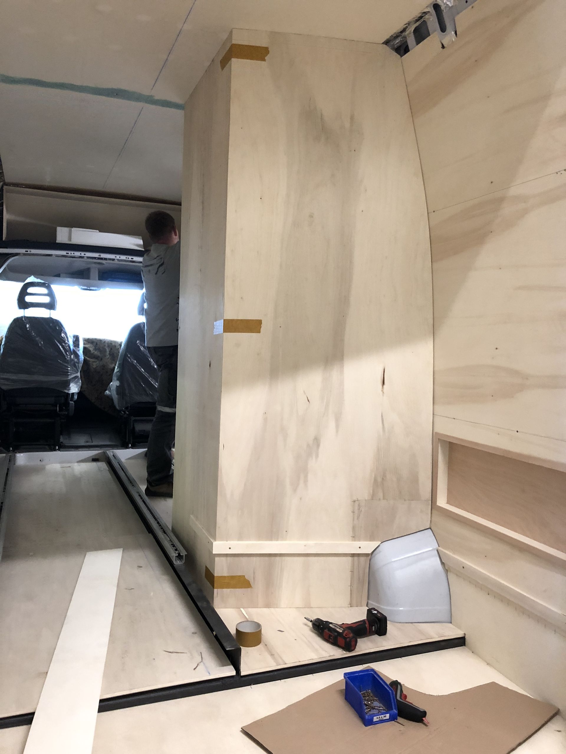Kész tervvel állt elénk aminek az elrendezését kicsit szkeptikusan fogadtuk. A sok ülés miatt szinte alig maradt hely a fürdőnek, konyhának és a két ágynak. Mi megpróbáltuk a legtöbbet kihozni belőle és úgy néz ki, hogy ez sikerült is.