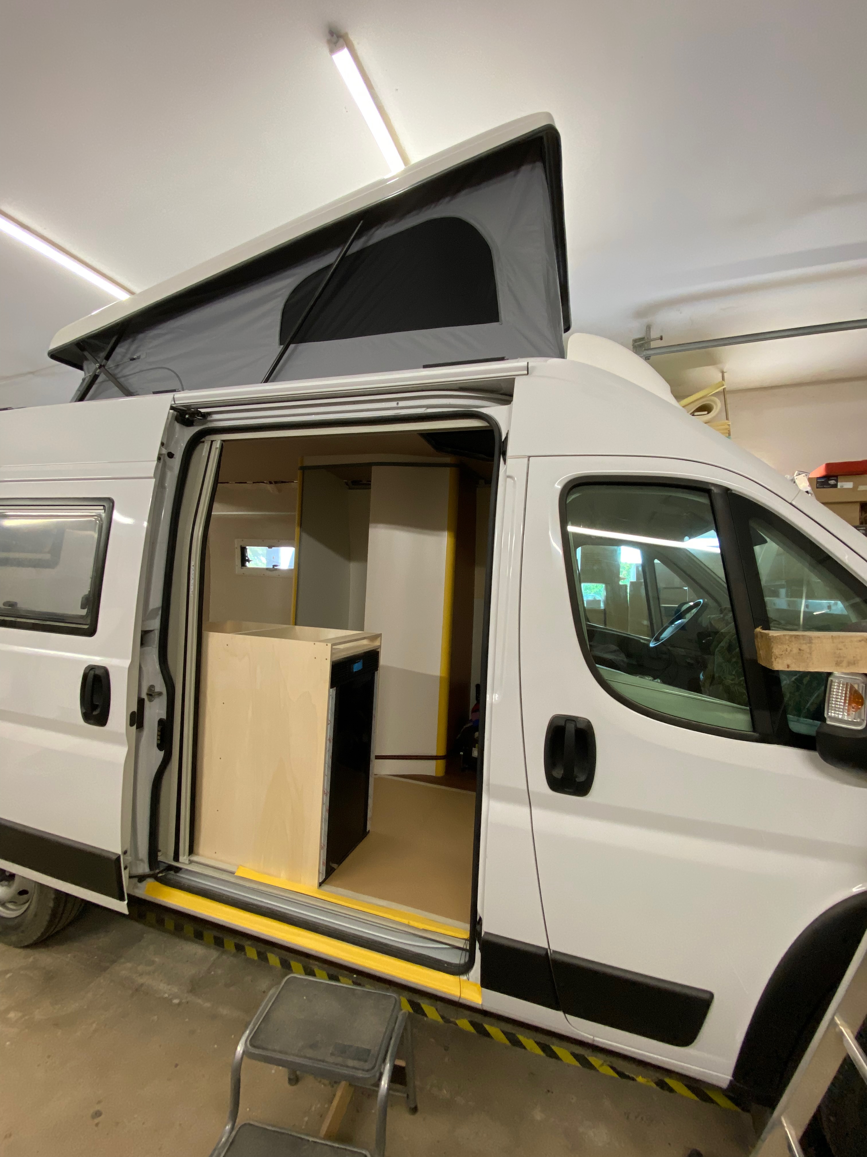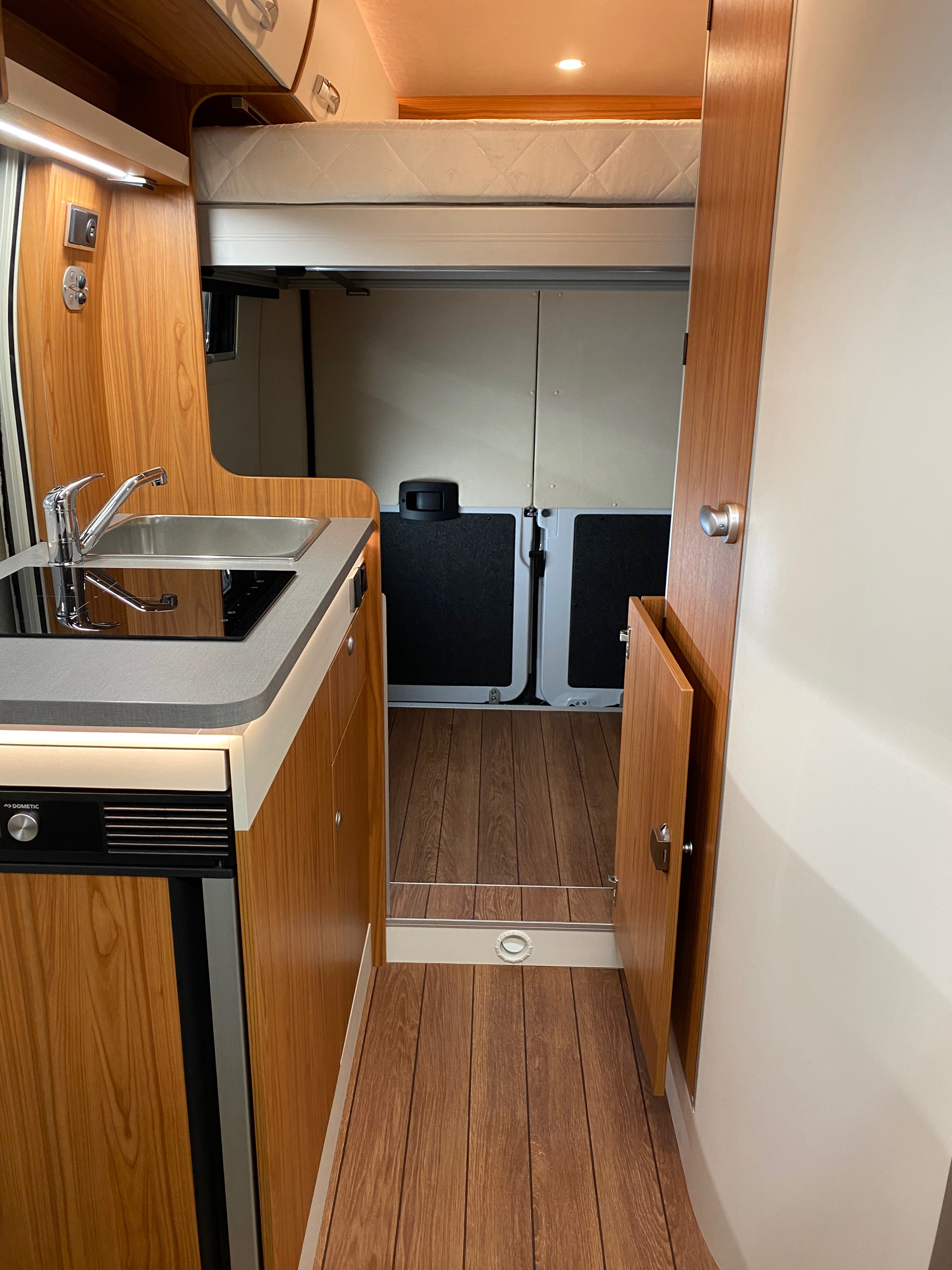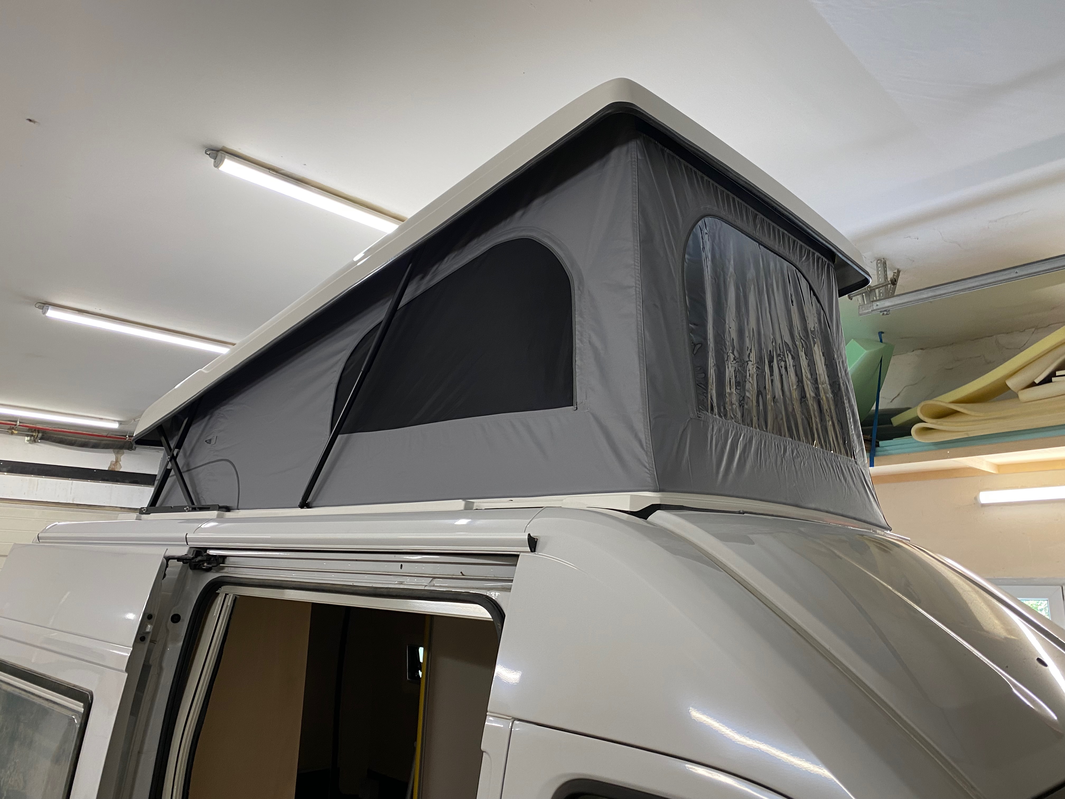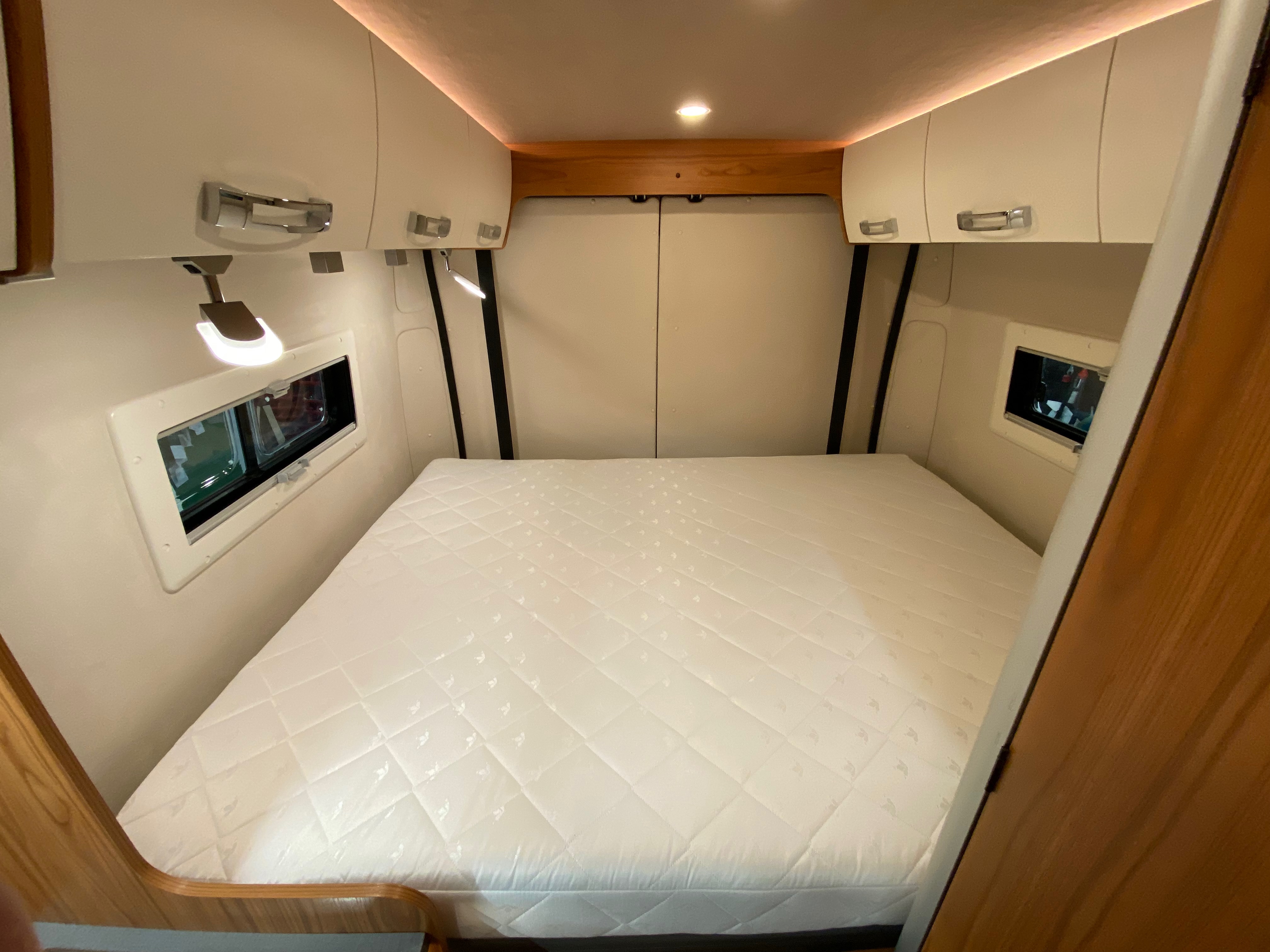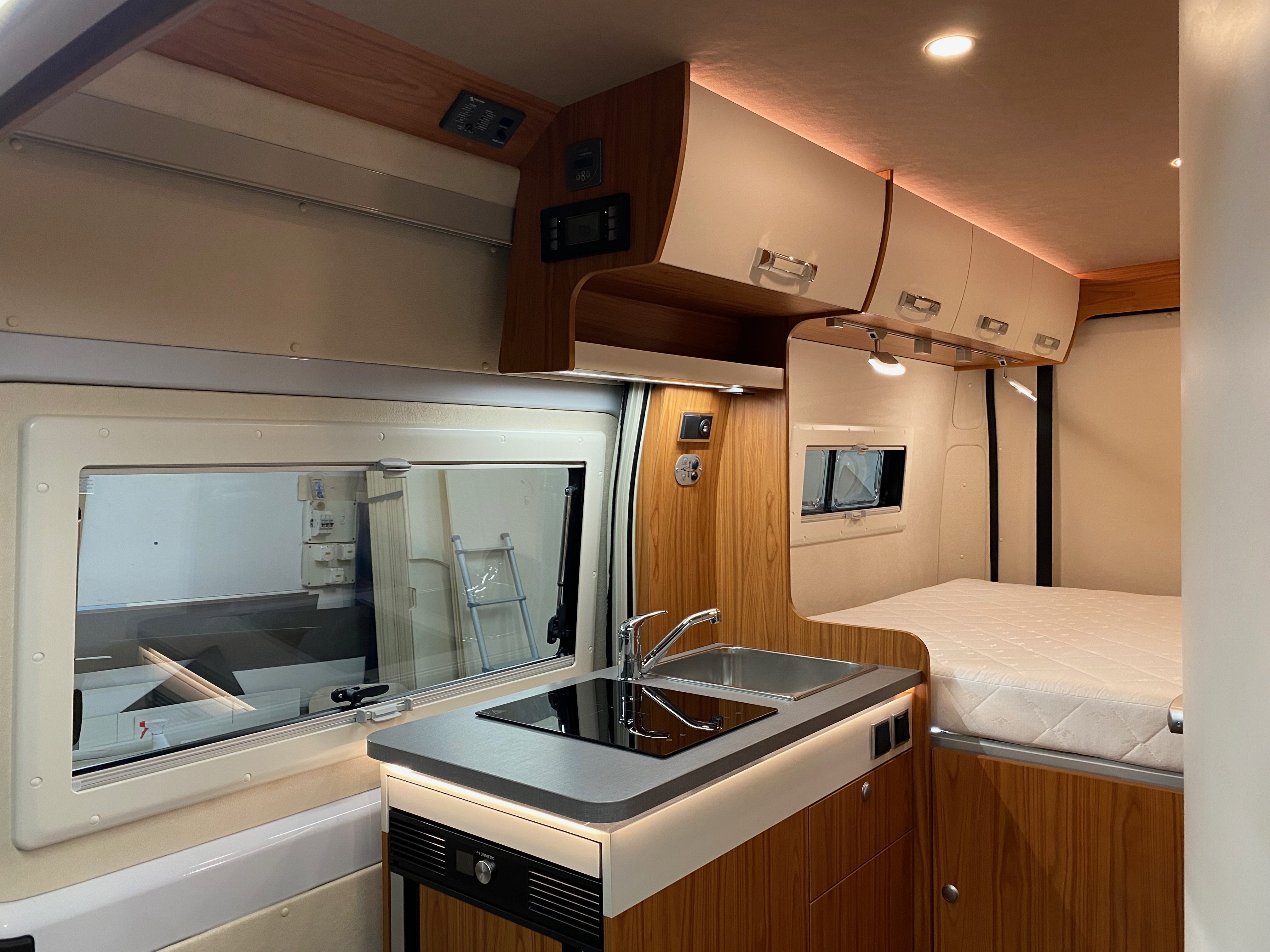Ezt a lakóautót a SplitT-Pong feltalálóinak készítettük. A jármű érdekessége, hogy nagyon kicsi (5,4m) és bár két személy szállítására alkalmas, mégis két teljes értékű franciaágy van benne. Erre azért volt szükség, mert ha a rakteret megpakolják a találmányukkal, akkor is lehessen aludni a lakóautóban. Ezt egy tetőre szerelt kinyitható sátortetővel oldottuk meg, valamint a hátsó franciaágyat motoros mechanikával láttuk el, hogy fel lehessen húzni a plafonra. Fontos szempont volt, hogy gázmentes legyen a lakóautó de a kicsi mérete miatt a konyhában nem fért el a diesel főzőlap, így indukciós főzőlapot építettünk be, aminek következtében már az ólomsavas akkumulátor nem volt megfelelő, ezért 200Ah lítium-os (LiFePO4) akkumulátor rendszert építettünk ki. A feltöltés 3 módon lehetséges. 220W napelem, 18A-es DC-DC töltő menet közben és egy 70A/1600W-os Victron MultiPlus töltő/inverterrel, ha hálózatra van kötve a lakóautó.