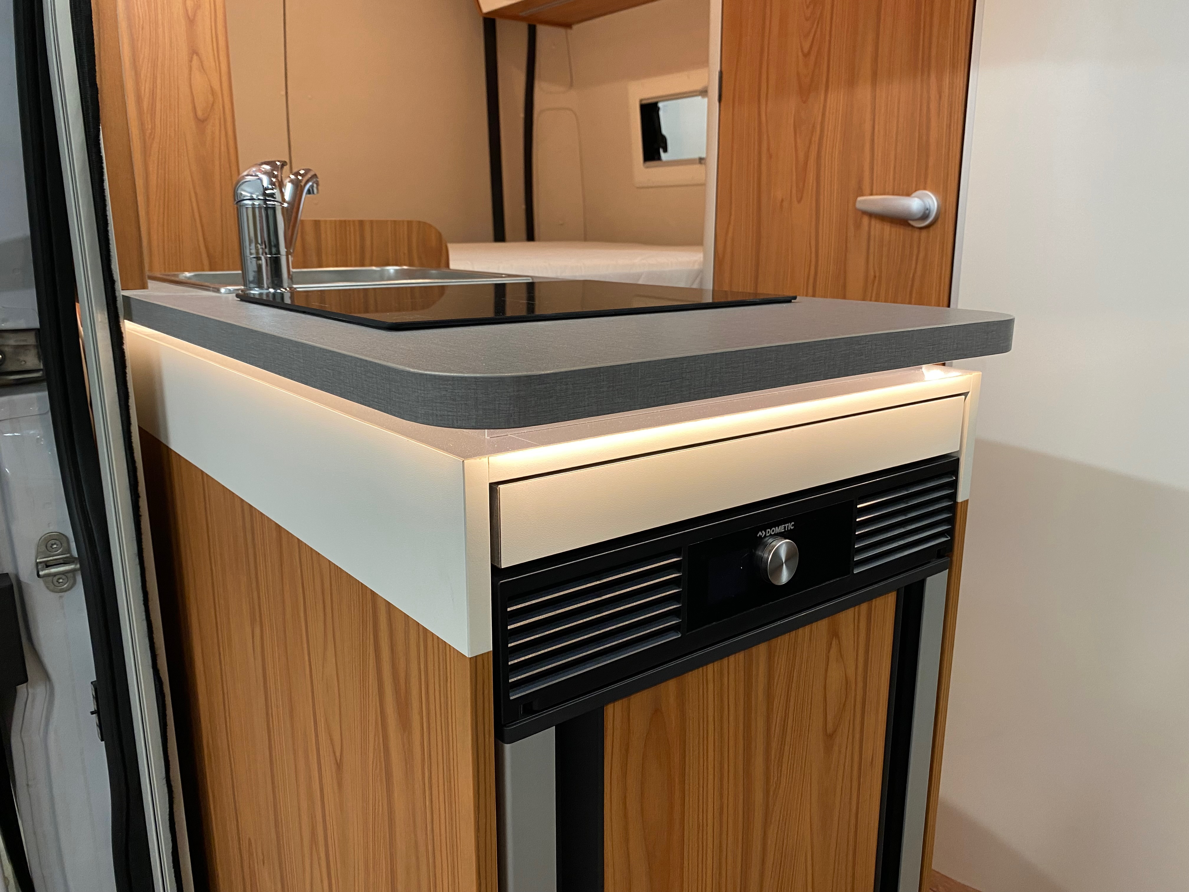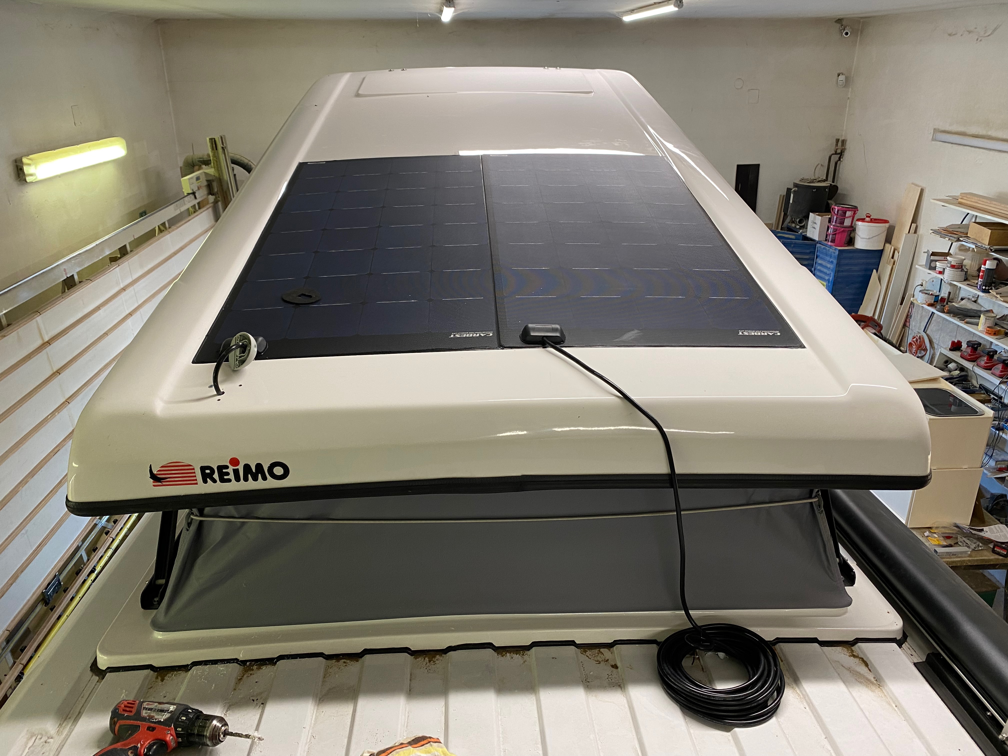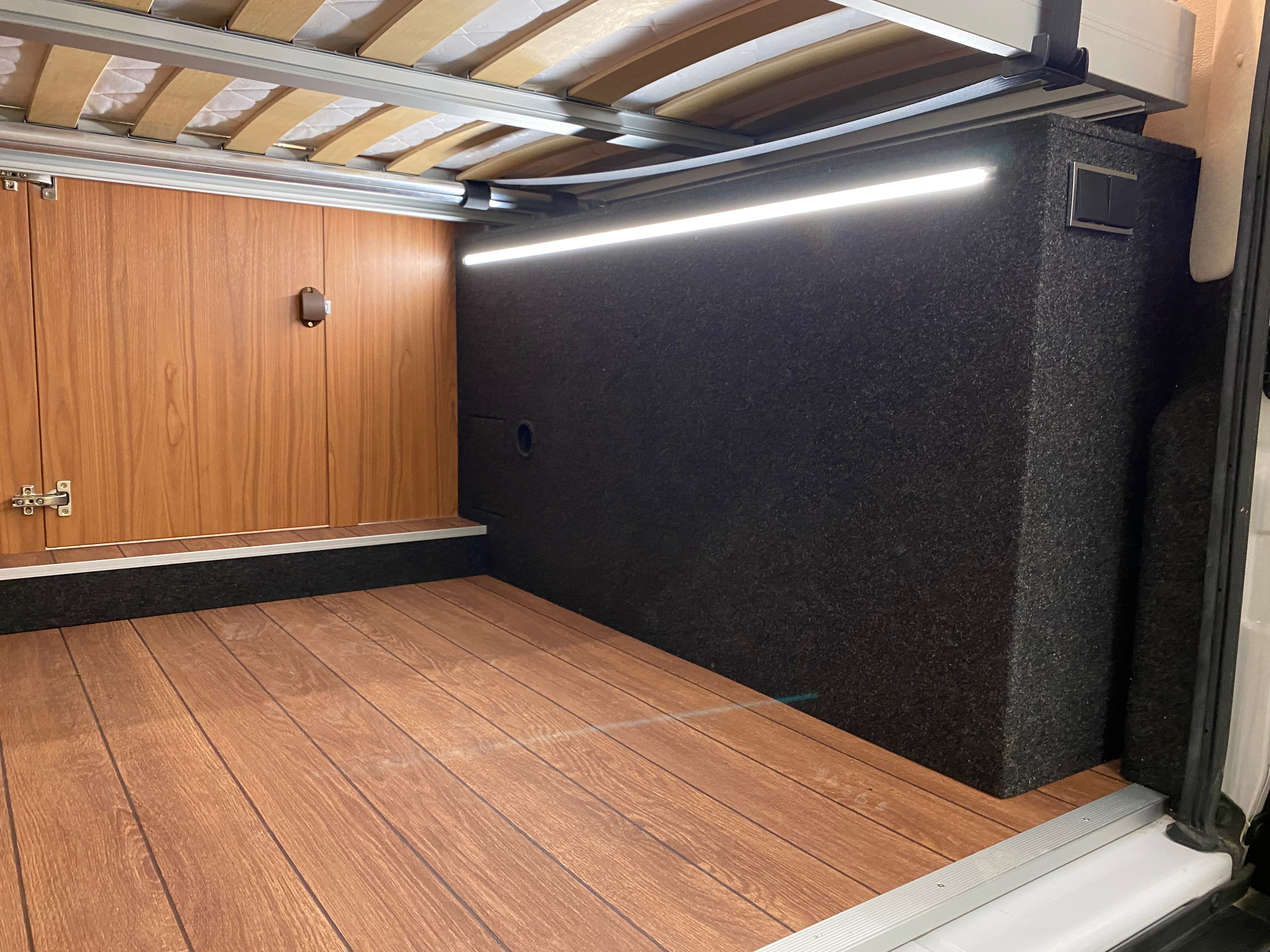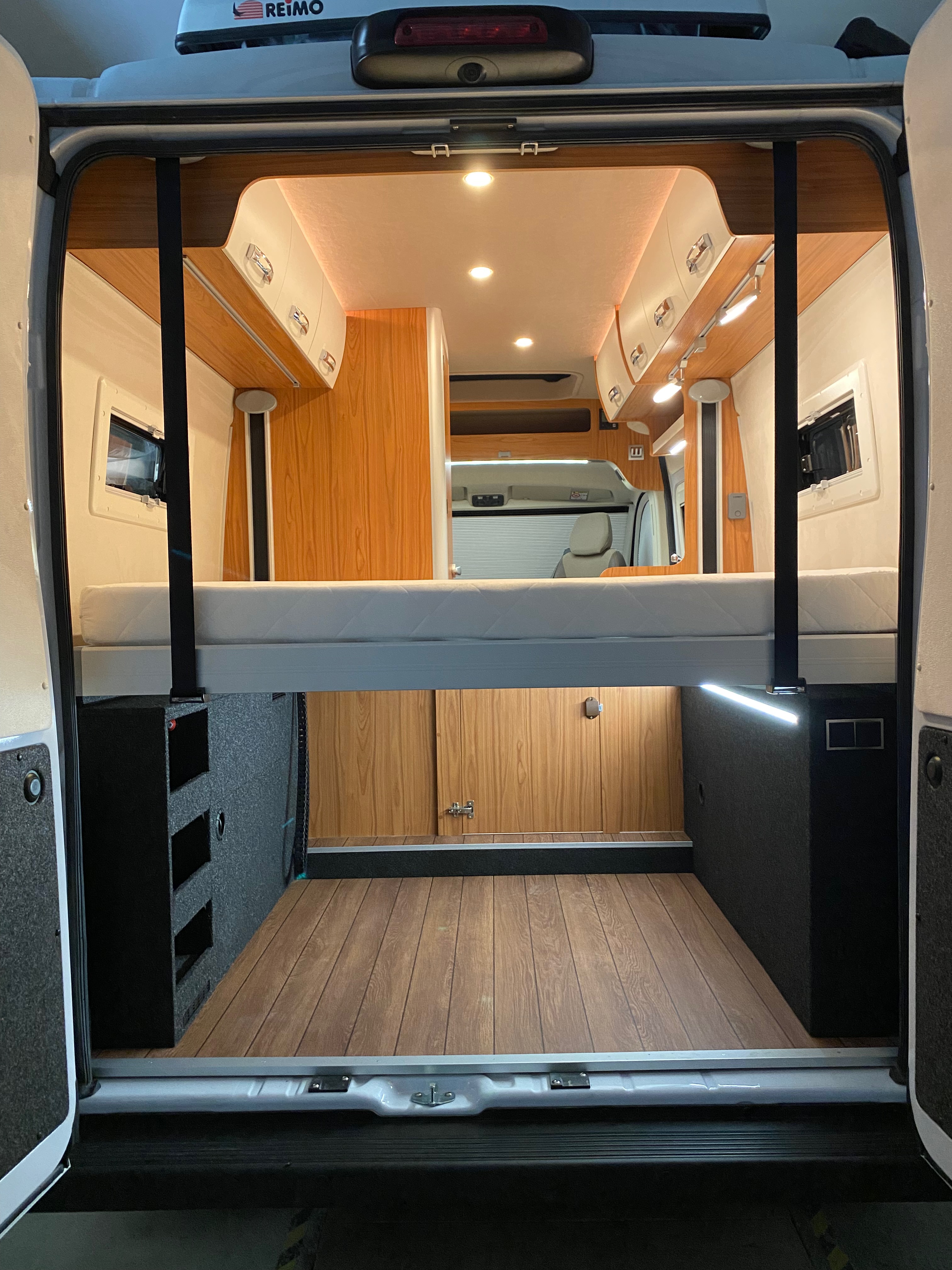 Ezt a lakóautót a SplitT-Pong feltalálóinak készítettük. A jármű érdekessége, hogy nagyon kicsi (5,4m) és bár két személy szállítására alkalmas, mégis két teljes értékű franciaágy van benne. Erre azért volt szükség, mert ha a rakteret megpakolják a találmányukkal, akkor is lehessen aludni a lakóautóban. Ezt egy tetőre szerelt kinyitható sátortetővel oldottuk meg, valamint a hátsó franciaágyat motoros mechanikával láttuk el, hogy fel lehessen húzni a plafonra. Fontos szempont volt, hogy gázmentes legyen a lakóautó de a kicsi mérete miatt a konyhában nem fért el a diesel főzőlap, így indukciós főzőlapot építettünk be, aminek következtében már az ólomsavas akkumulátor nem volt megfelelő, ezért 200Ah lítium-os (LiFePO4) akkumulátor rendszert építettünk ki. A feltöltés 3 módon lehetséges. 220W napelem, 18A-es DC-DC töltő menet közben és egy 70A/1600W-os Victron MultiPlus töltő/inverterrel, ha hálózatra van kötve a lakóautó.