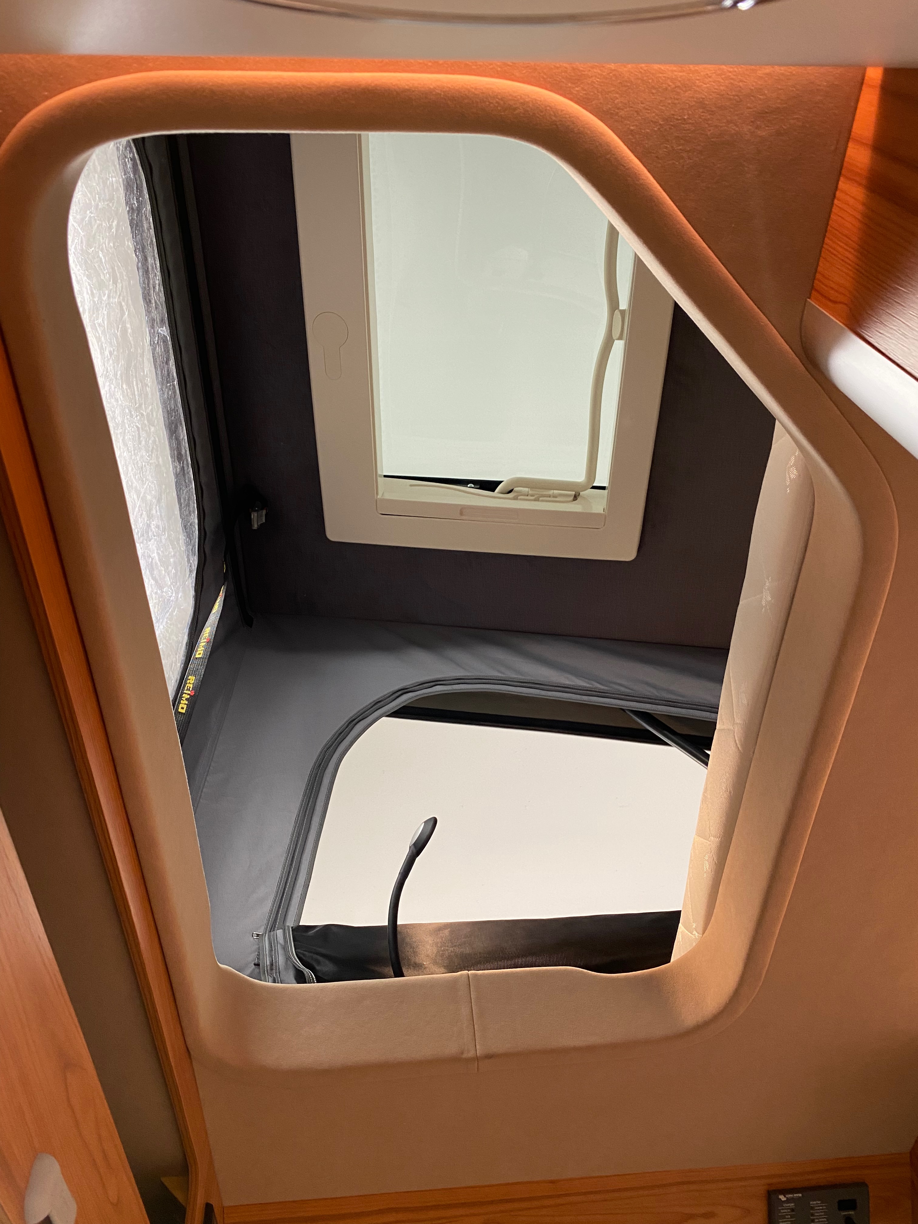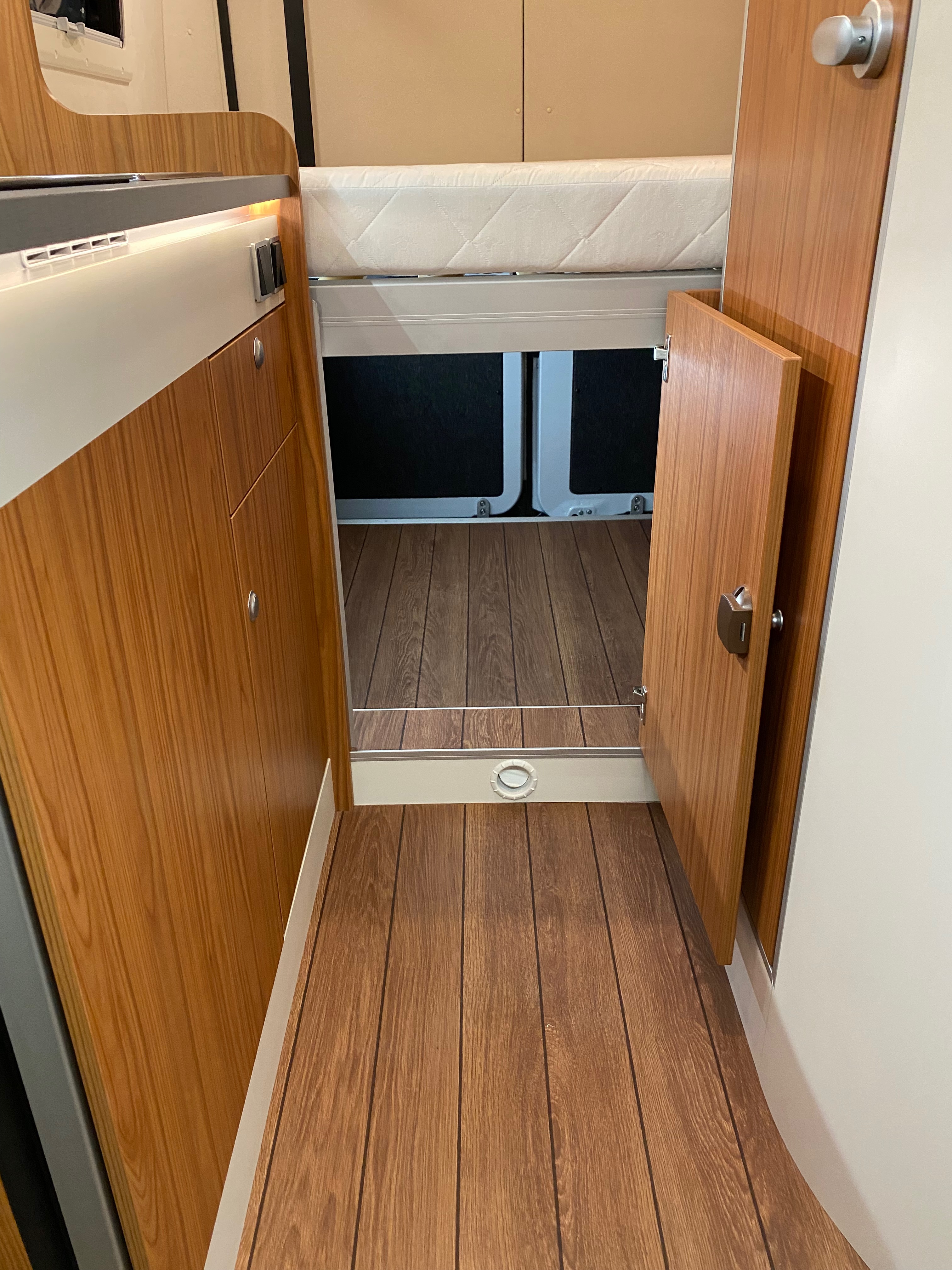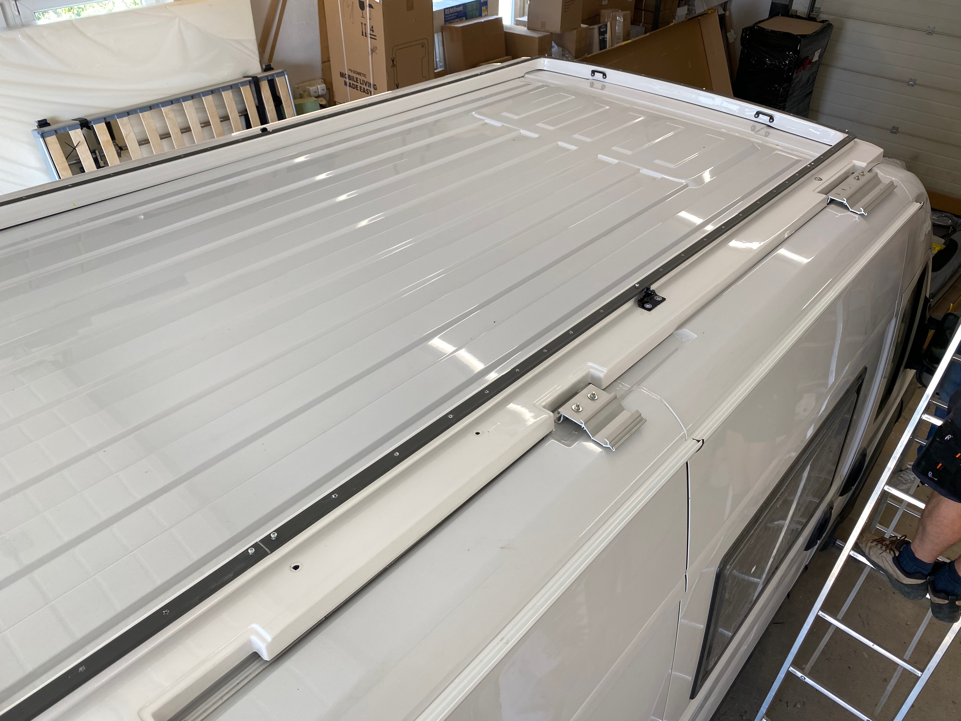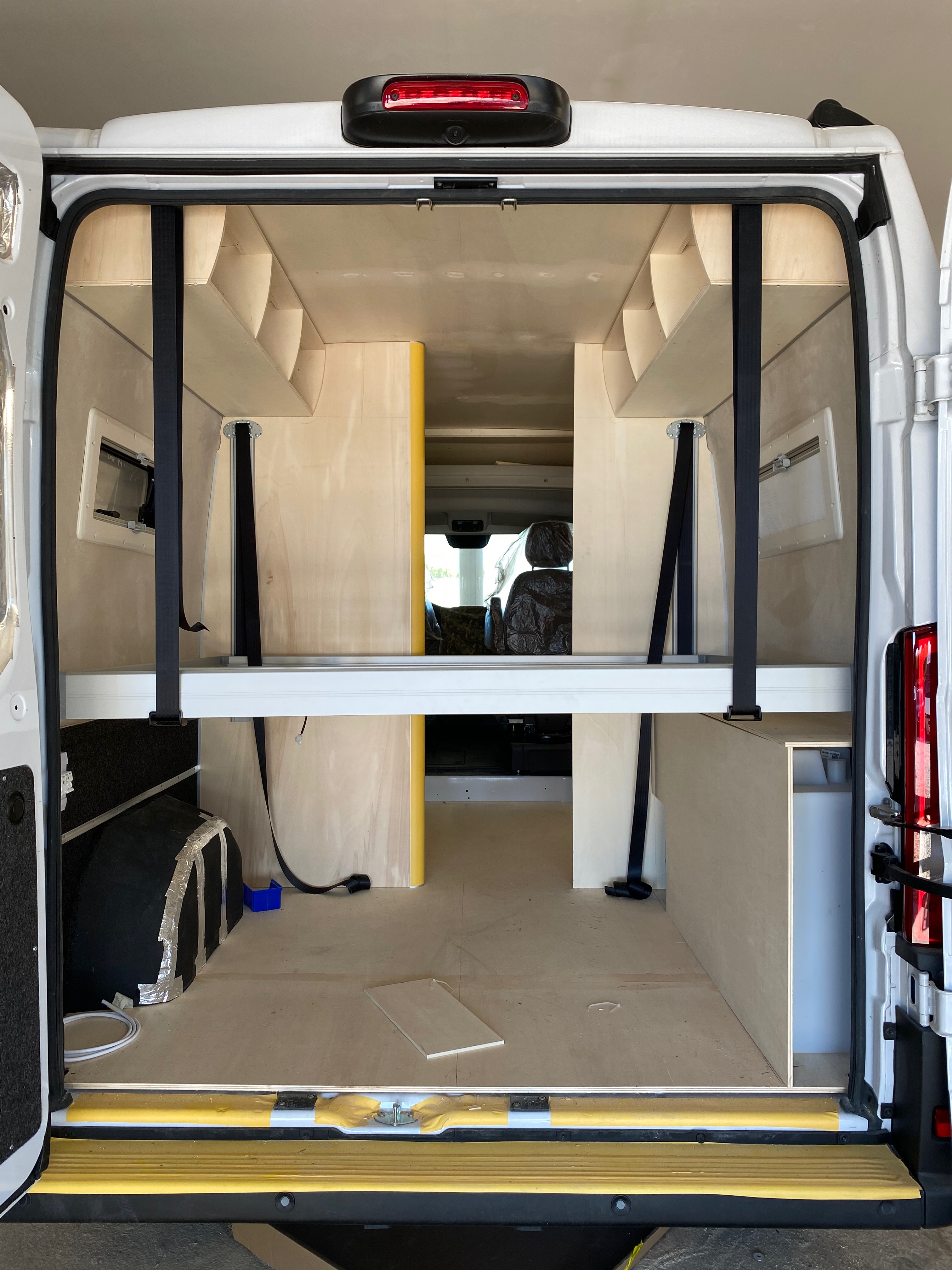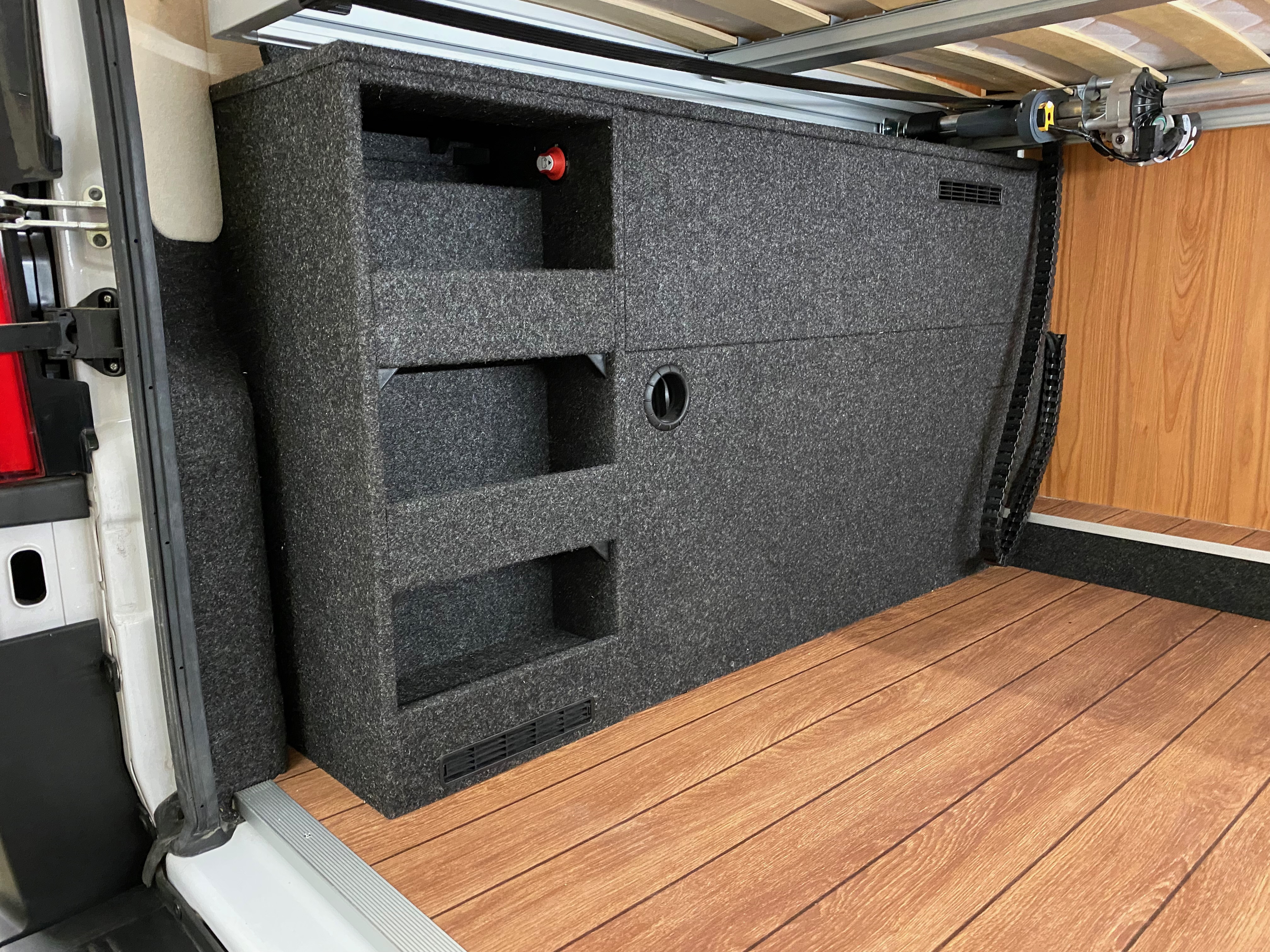 Ezt a lakóautót a SplitT-Pong feltalálóinak készítettük. A jármű érdekessége, hogy nagyon kicsi (5,4m) és bár két személy szállítására alkalmas, mégis két teljes értékű franciaágy van benne. Erre azért volt szükség, mert ha a rakteret megpakolják a találmányukkal, akkor is lehessen aludni a lakóautóban. Ezt egy tetőre szerelt kinyitható sátortetővel oldottuk meg, valamint a hátsó franciaágyat motoros mechanikával láttuk el, hogy fel lehessen húzni a plafonra. Fontos szempont volt, hogy gázmentes legyen a lakóautó de a kicsi mérete miatt a konyhában nem fért el a diesel főzőlap, így indukciós főzőlapot építettünk be, aminek következtében már az ólomsavas akkumulátor nem volt megfelelő, ezért 200Ah lítium-os (LiFePO4) akkumulátor rendszert építettünk ki. A feltöltés 3 módon lehetséges. 220W napelem, 18A-es DC-DC töltő menet közben és egy 70A/1600W-os Victron MultiPlus töltő/inverterrel, ha hálózatra van kötve a lakóautó.