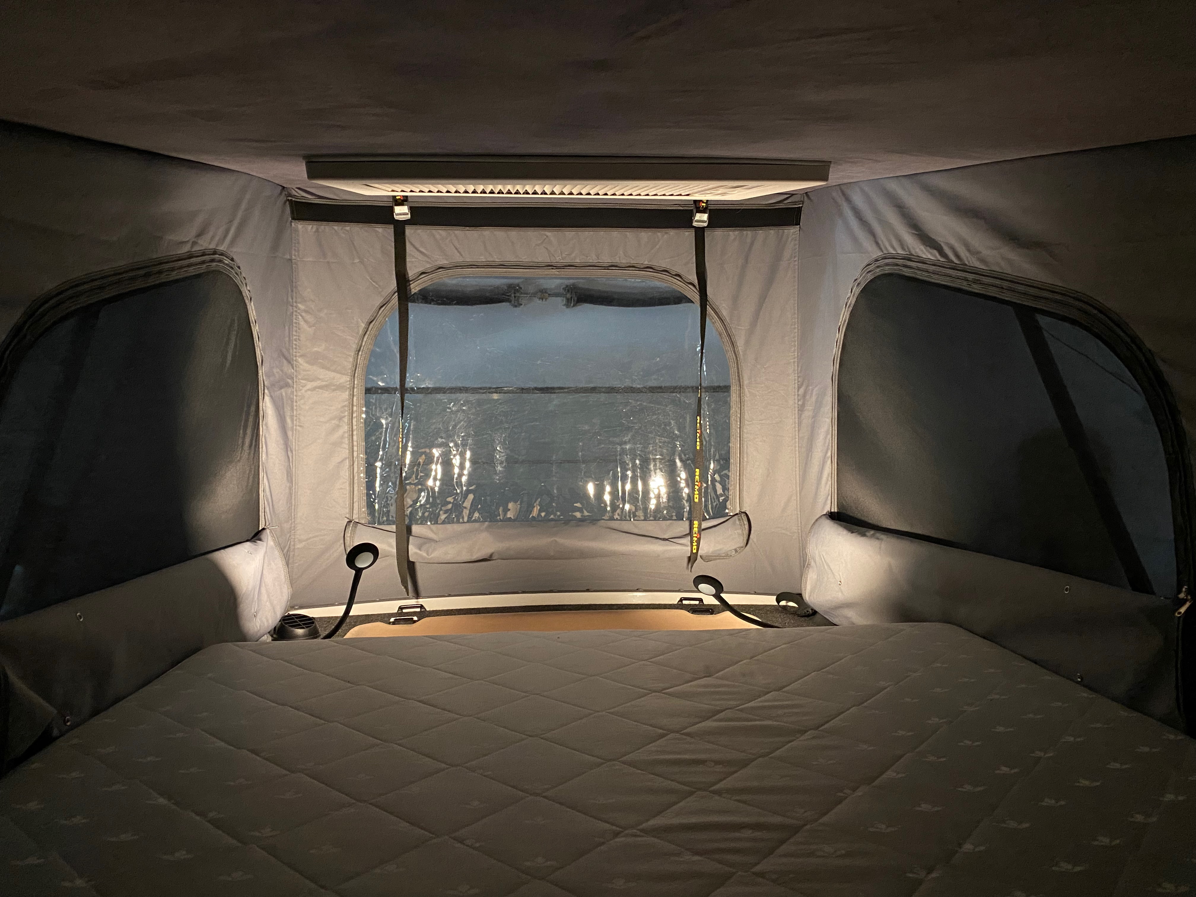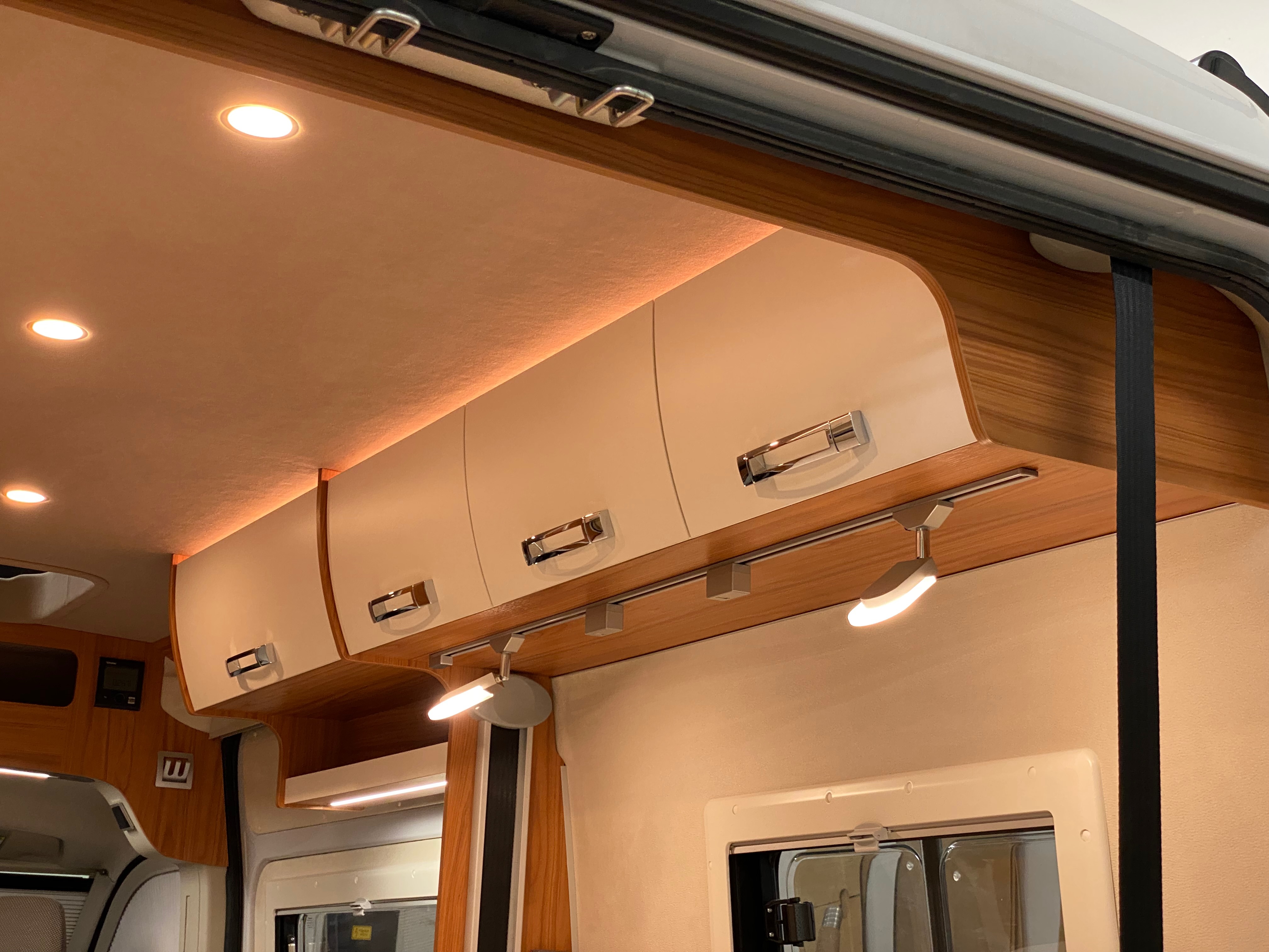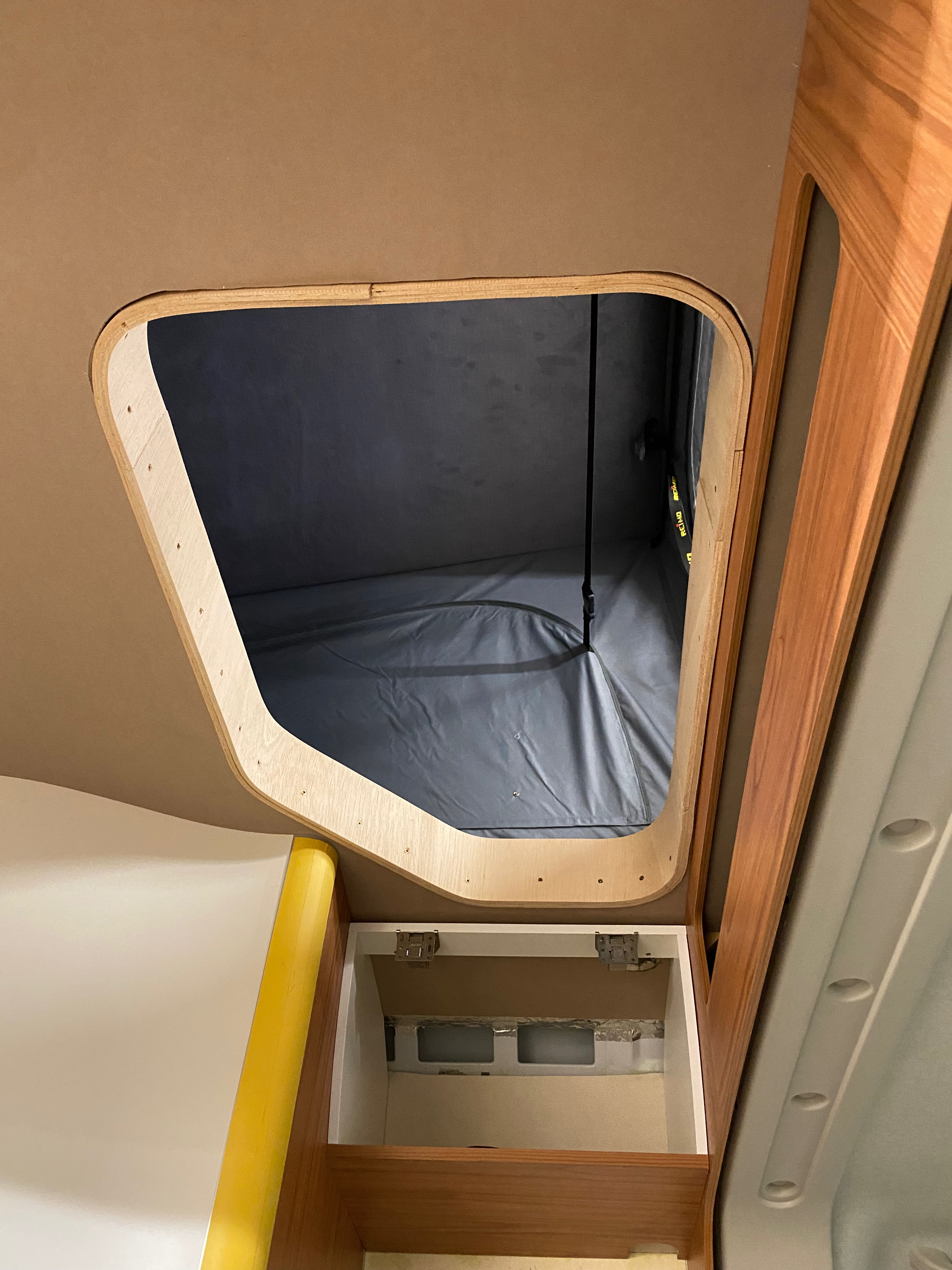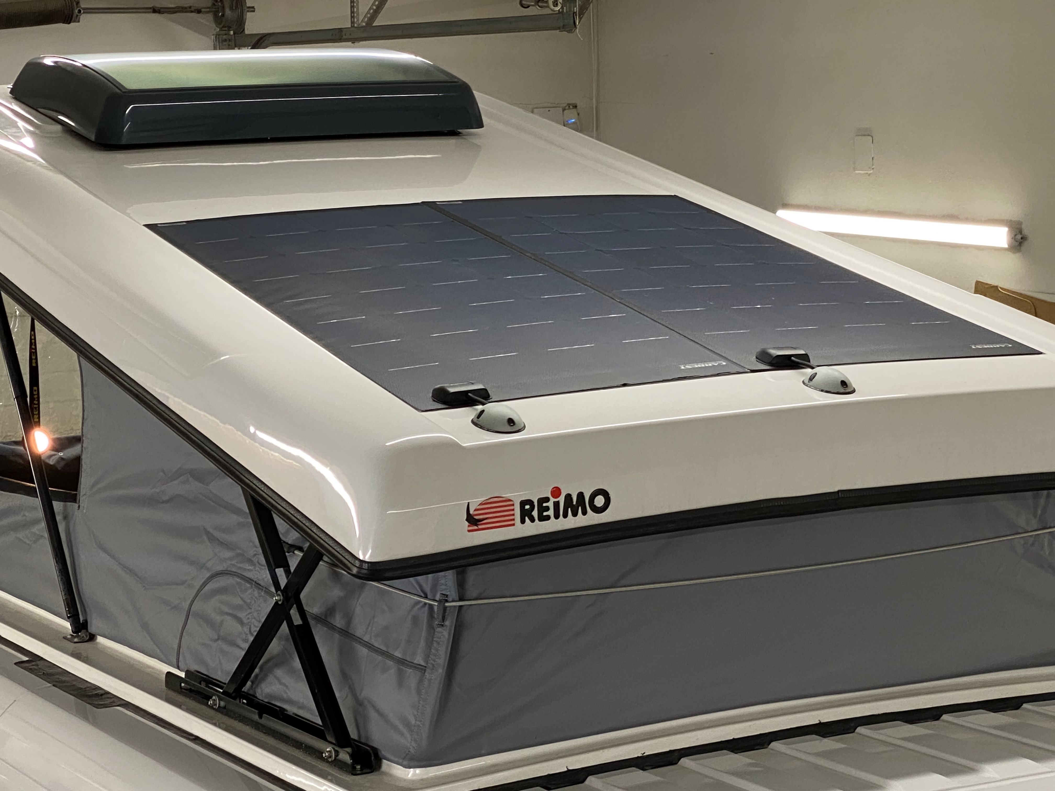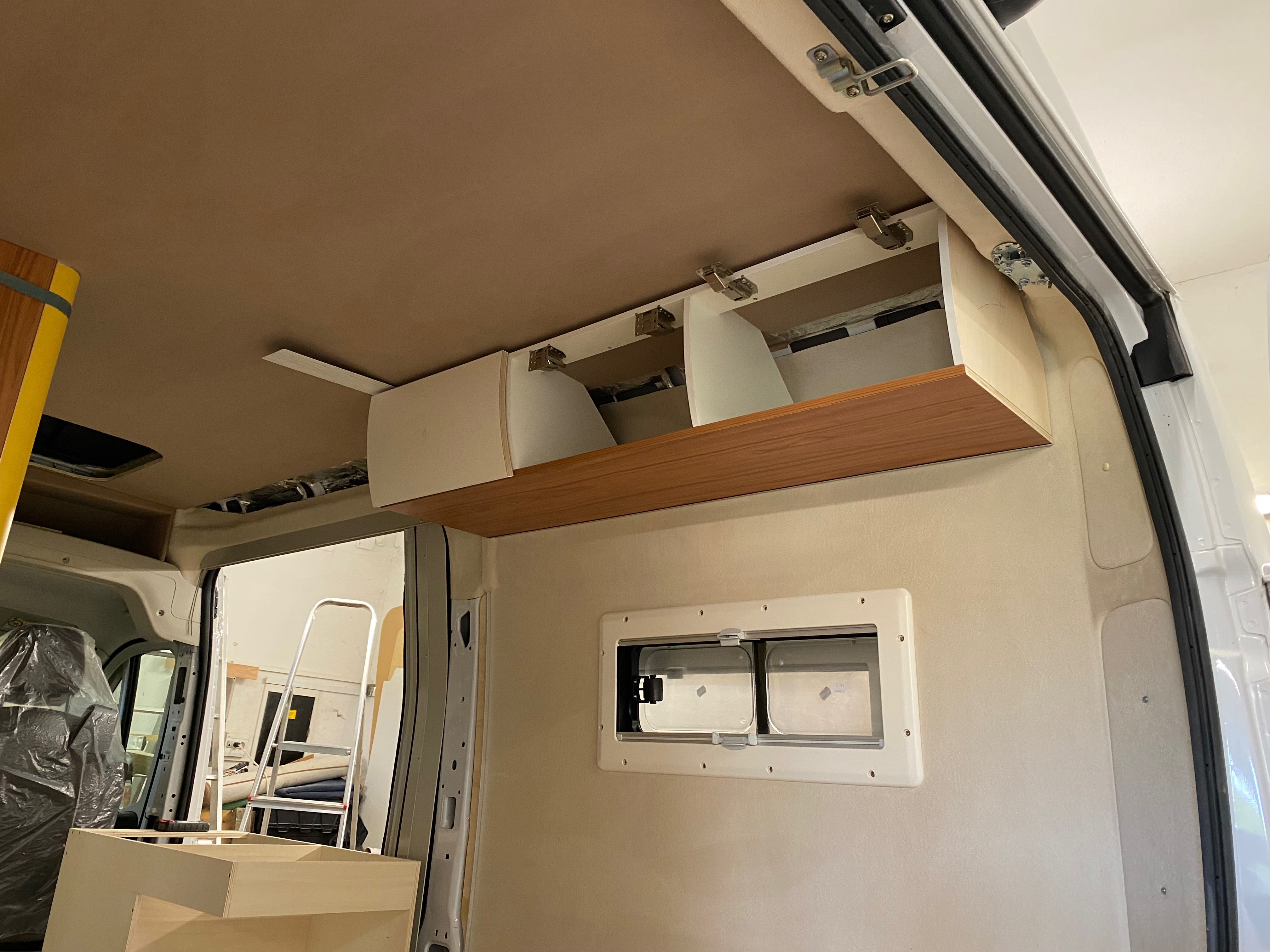 Ezt a lakóautót a SplitT-Pong feltalálóinak készítettük. A jármű érdekessége, hogy nagyon kicsi (5,4m) és bár két személy szállítására alkalmas, mégis két teljes értékű franciaágy van benne. Erre azért volt szükség, mert ha a rakteret megpakolják a találmányukkal, akkor is lehessen aludni a lakóautóban. Ezt egy tetőre szerelt kinyitható sátortetővel oldottuk meg, valamint a hátsó franciaágyat motoros mechanikával láttuk el, hogy fel lehessen húzni a plafonra. Fontos szempont volt, hogy gázmentes legyen a lakóautó de a kicsi mérete miatt a konyhában nem fért el a diesel főzőlap, így indukciós főzőlapot építettünk be, aminek következtében már az ólomsavas akkumulátor nem volt megfelelő, ezért 200Ah lítium-os (LiFePO4) akkumulátor rendszert építettünk ki. A feltöltés 3 módon lehetséges. 220W napelem, 18A-es DC-DC töltő menet közben és egy 70A/1600W-os Victron MultiPlus töltő/inverterrel, ha hálózatra van kötve a lakóautó.