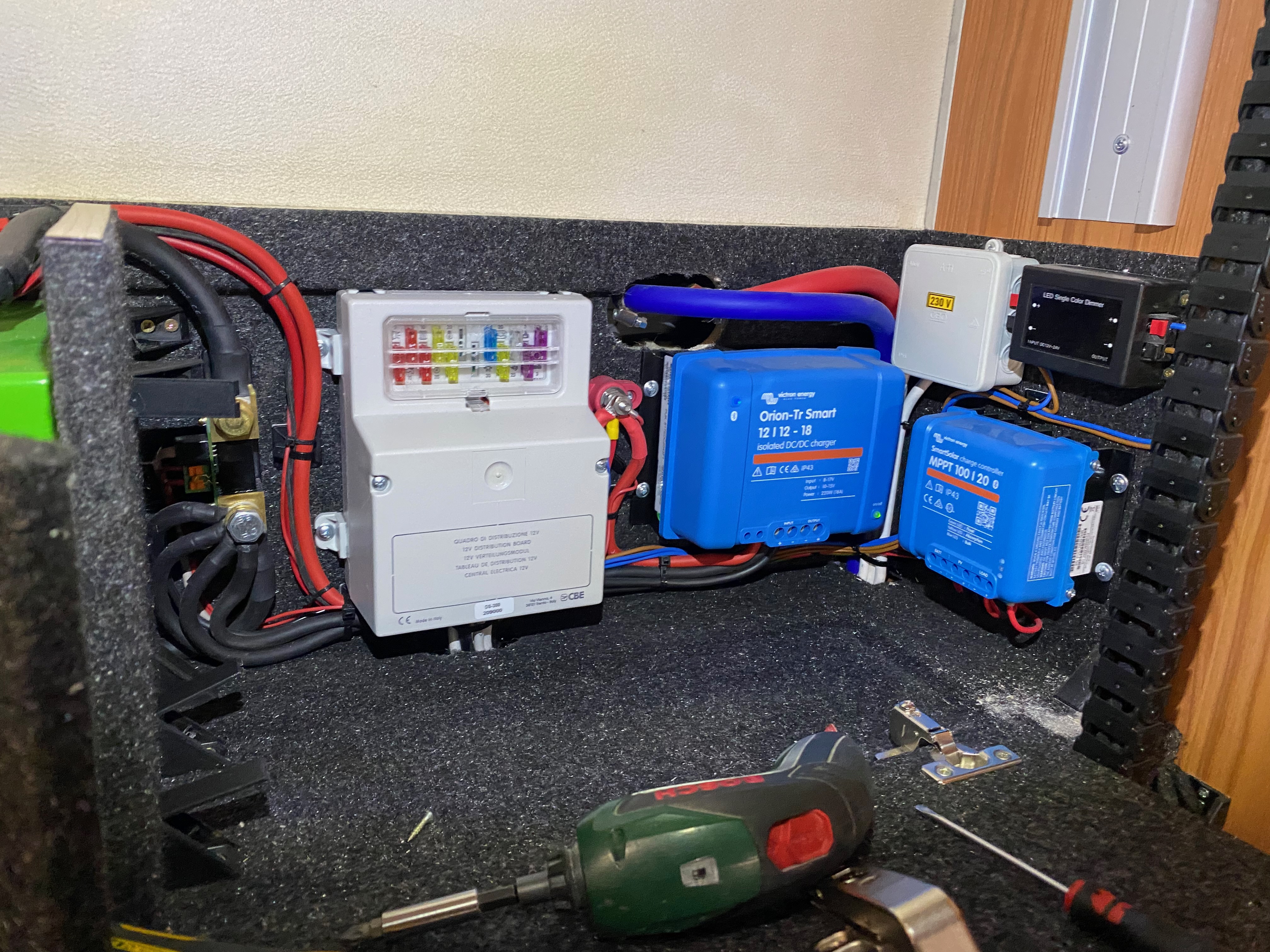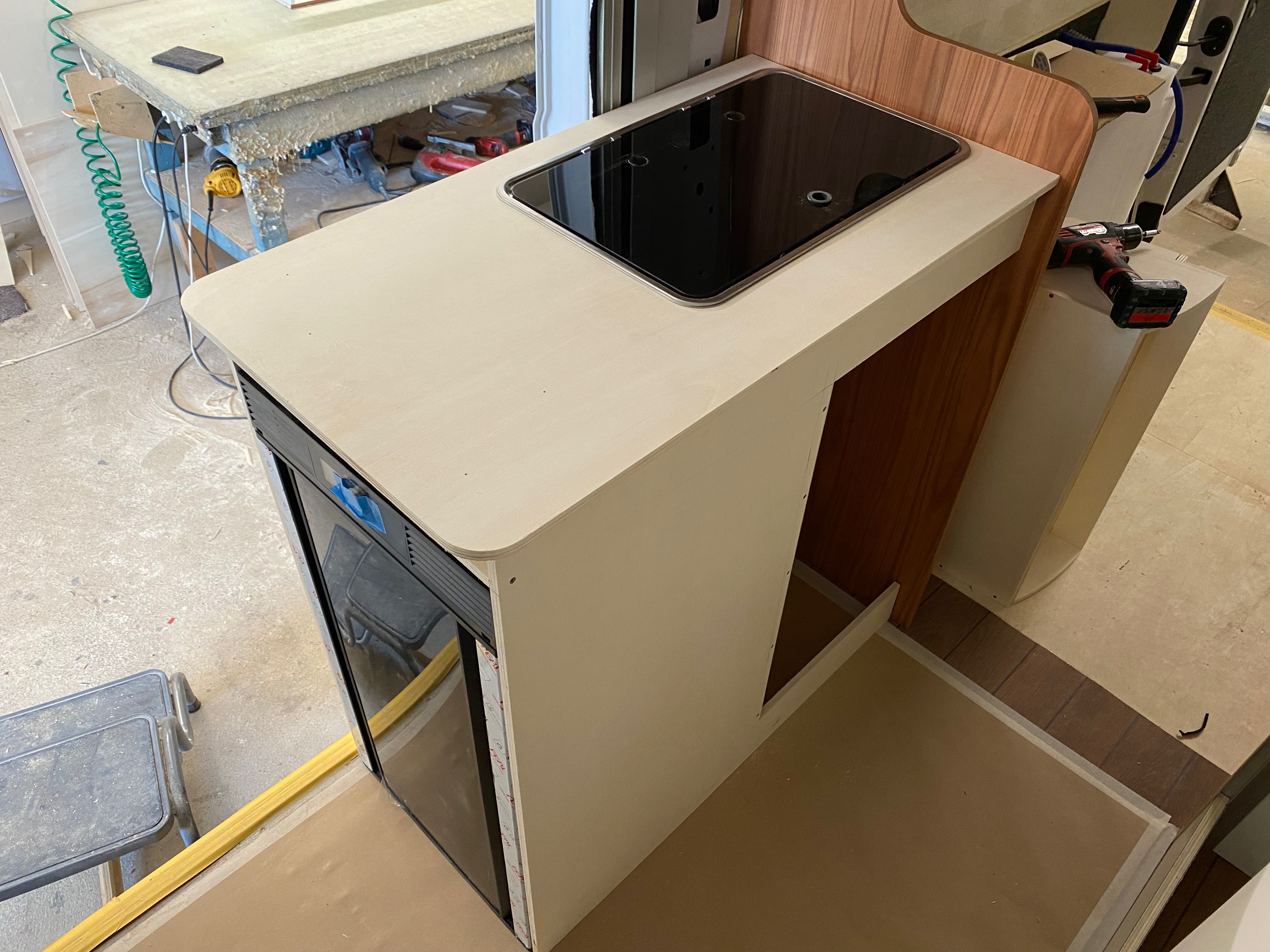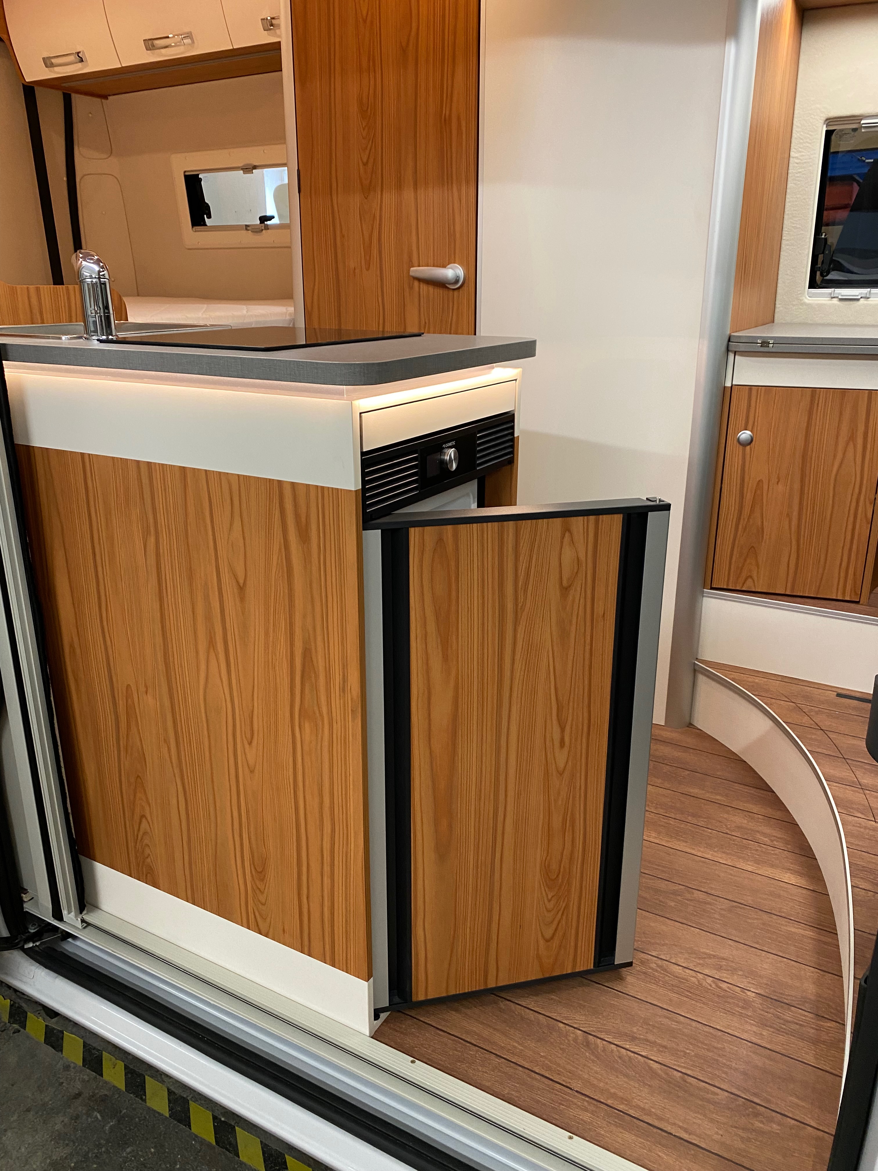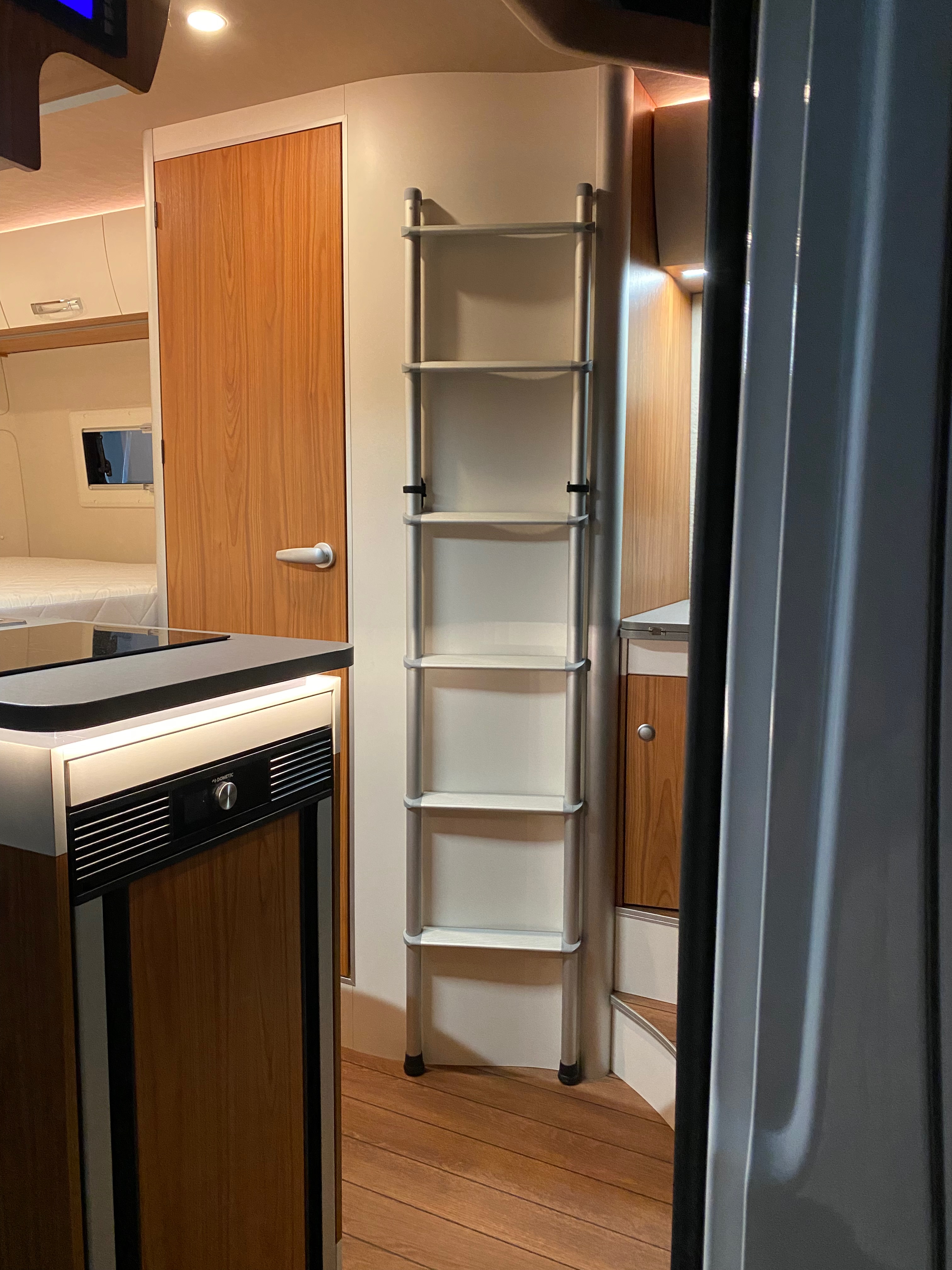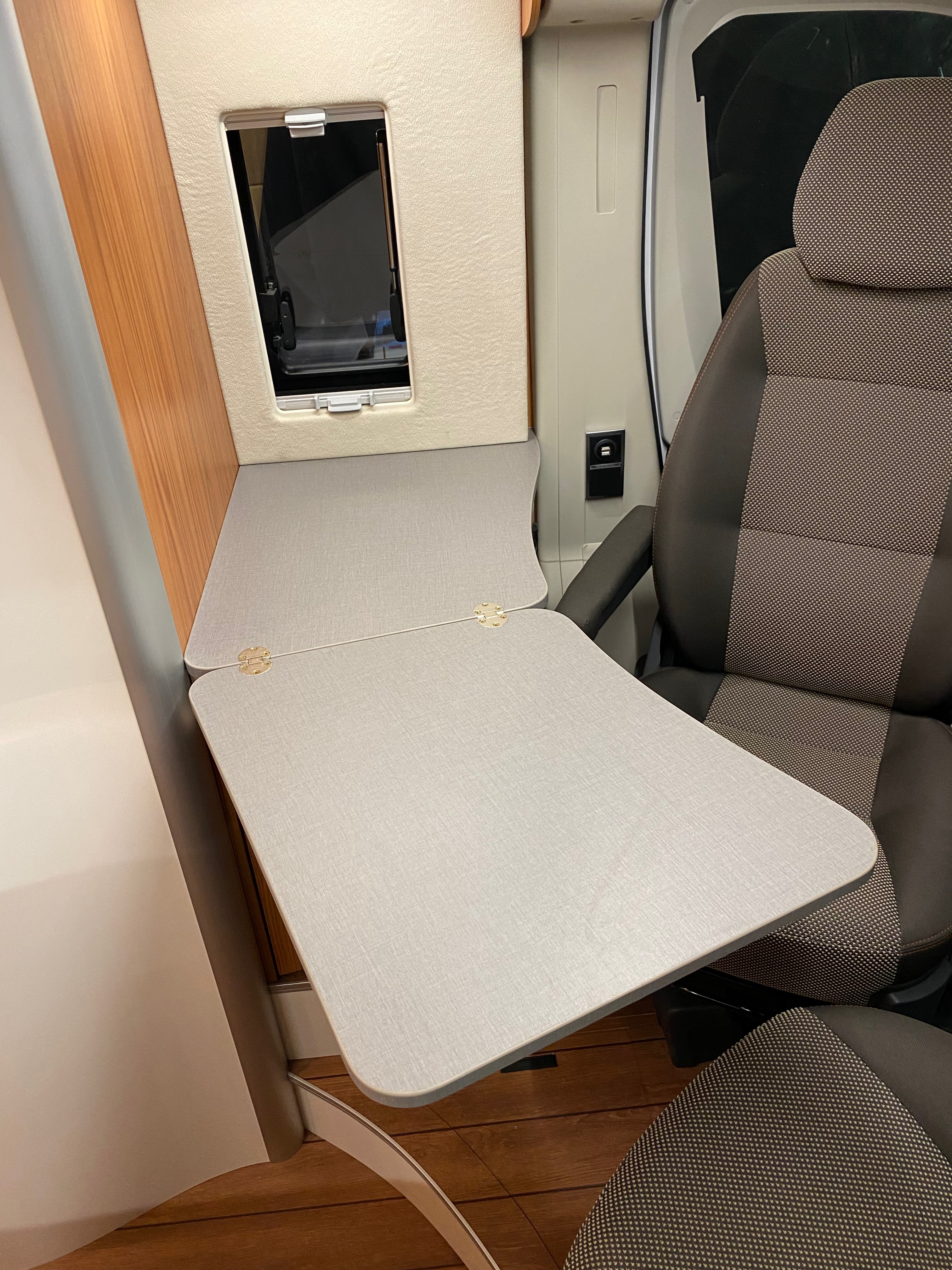 Ezt a lakóautót a SplitT-Pong feltalálóinak készítettük. A jármű érdekessége, hogy nagyon kicsi (5,4m) és bár két személy szállítására alkalmas, mégis két teljes értékű franciaágy van benne. Erre azért volt szükség, mert ha a rakteret megpakolják a találmányukkal, akkor is lehessen aludni a lakóautóban. Ezt egy tetőre szerelt kinyitható sátortetővel oldottuk meg, valamint a hátsó franciaágyat motoros mechanikával láttuk el, hogy fel lehessen húzni a plafonra. Fontos szempont volt, hogy gázmentes legyen a lakóautó de a kicsi mérete miatt a konyhában nem fért el a diesel főzőlap, így indukciós főzőlapot építettünk be, aminek következtében már az ólomsavas akkumulátor nem volt megfelelő, ezért 200Ah lítium-os (LiFePO4) akkumulátor rendszert építettünk ki. A feltöltés 3 módon lehetséges. 220W napelem, 18A-es DC-DC töltő menet közben és egy 70A/1600W-os Victron MultiPlus töltő/inverterrel, ha hálózatra van kötve a lakóautó.