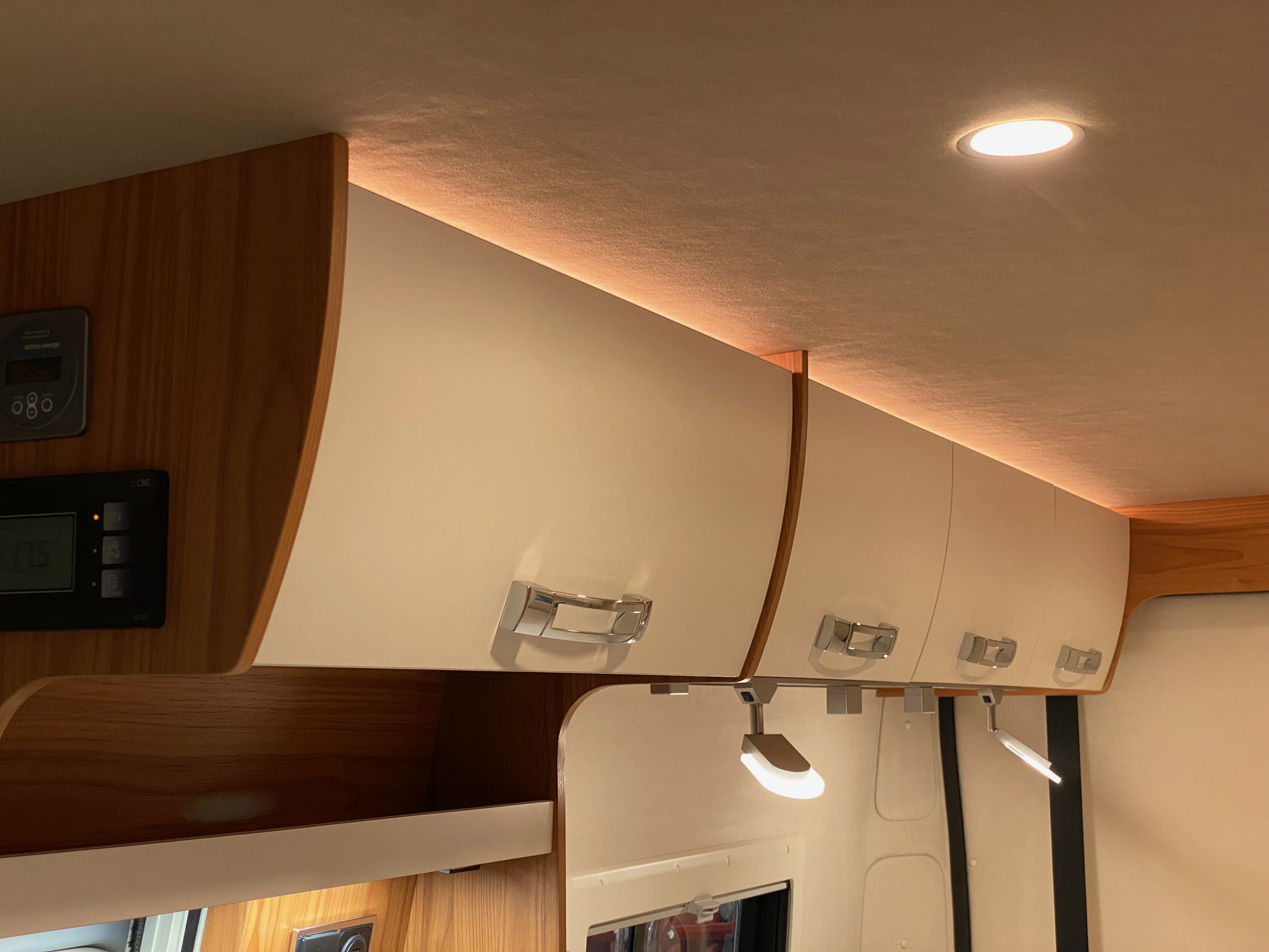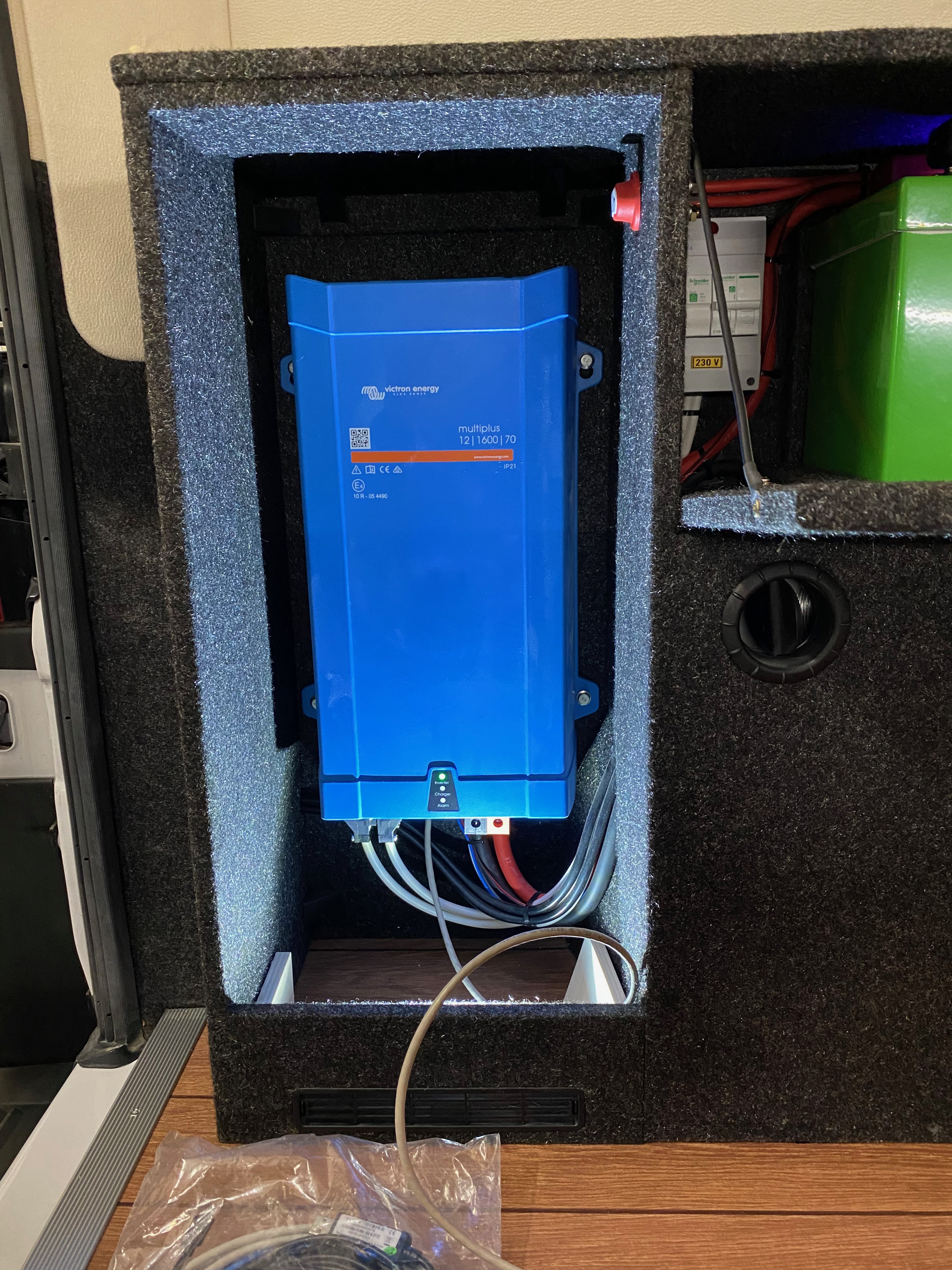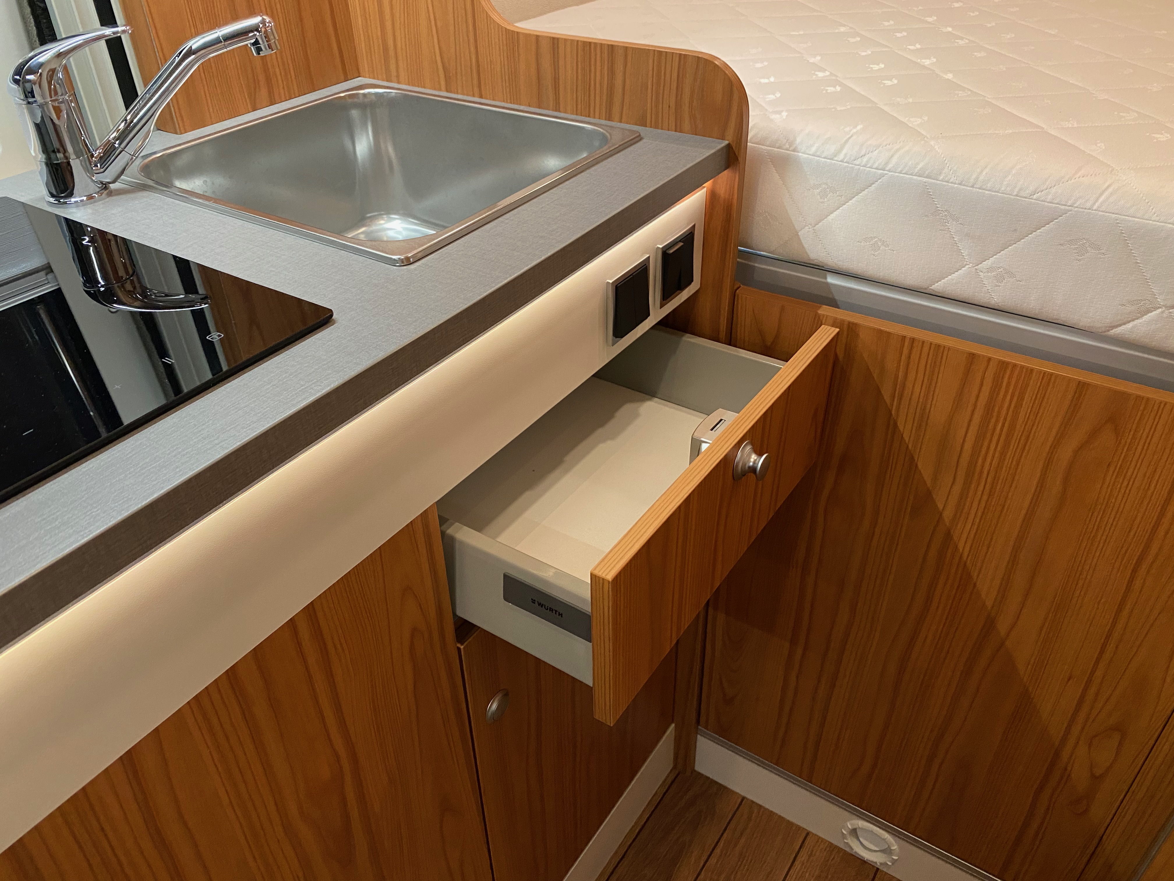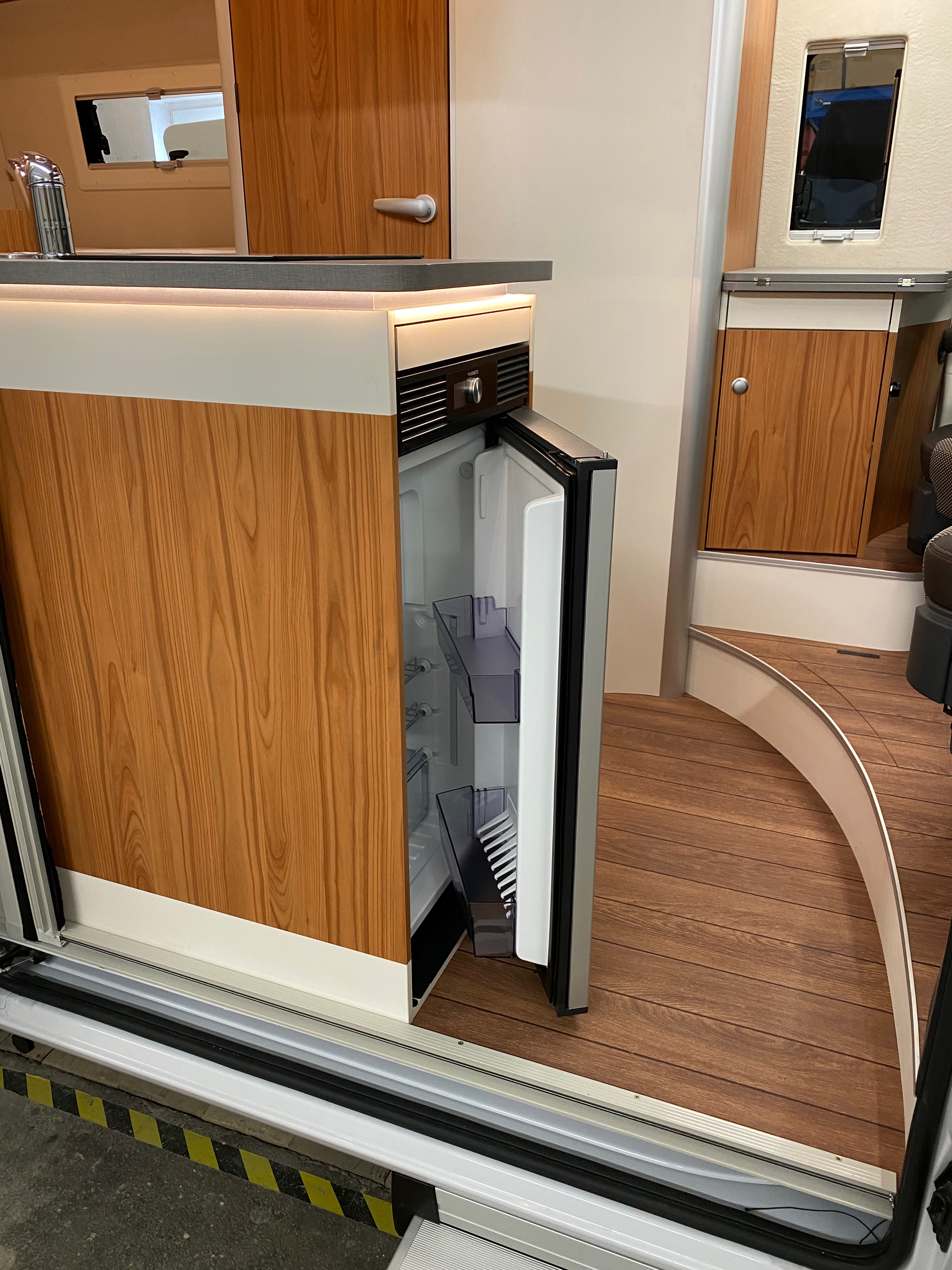 Ezt a lakóautót a SplitT-Pong feltalálóinak készítettük. A jármű érdekessége, hogy nagyon kicsi (5,4m) és bár két személy szállítására alkalmas, mégis két teljes értékű franciaágy van benne. Erre azért volt szükség, mert ha a rakteret megpakolják a találmányukkal, akkor is lehessen aludni a lakóautóban. Ezt egy tetőre szerelt kinyitható sátortetővel oldottuk meg, valamint a hátsó franciaágyat motoros mechanikával láttuk el, hogy fel lehessen húzni a plafonra. Fontos szempont volt, hogy gázmentes legyen a lakóautó de a kicsi mérete miatt a konyhában nem fért el a diesel főzőlap, így indukciós főzőlapot építettünk be, aminek következtében már az ólomsavas akkumulátor nem volt megfelelő, ezért 200Ah lítium-os (LiFePO4) akkumulátor rendszert építettünk ki. A feltöltés 3 módon lehetséges. 220W napelem, 18A-es DC-DC töltő menet közben és egy 70A/1600W-os Victron MultiPlus töltő/inverterrel, ha hálózatra van kötve a lakóautó.