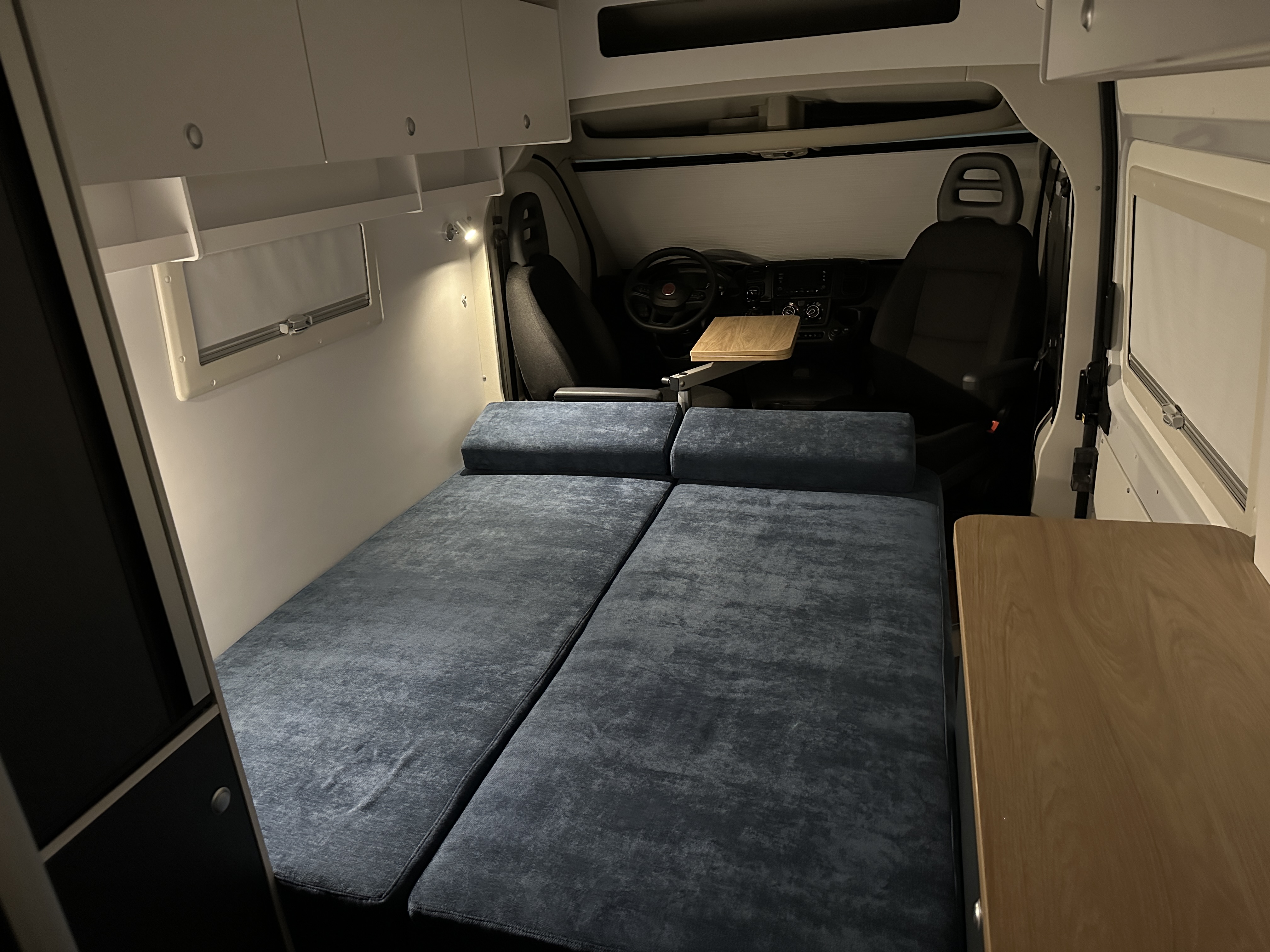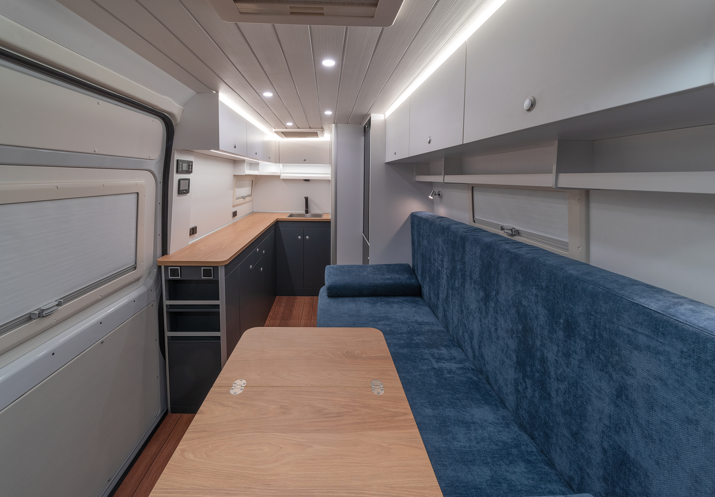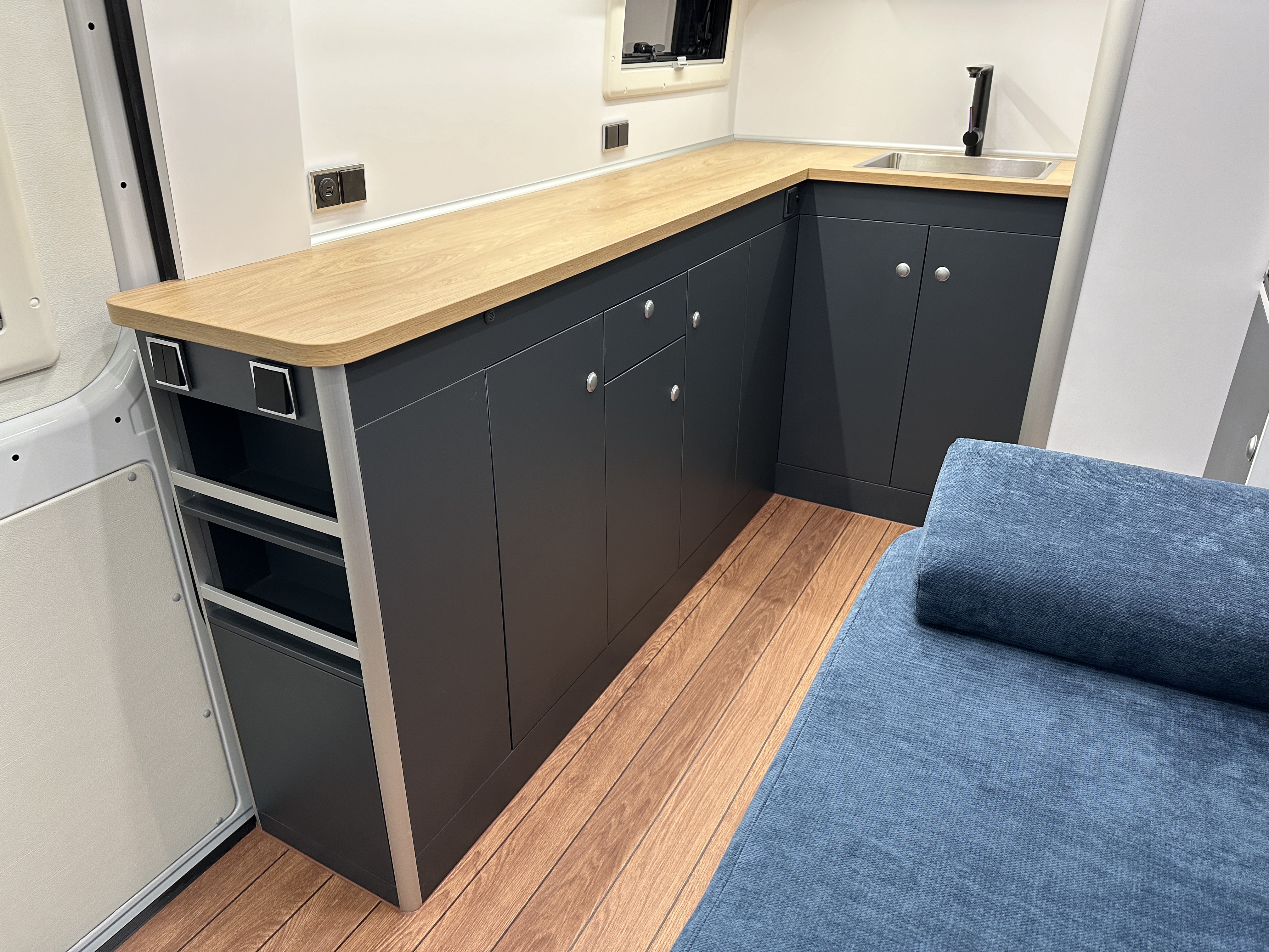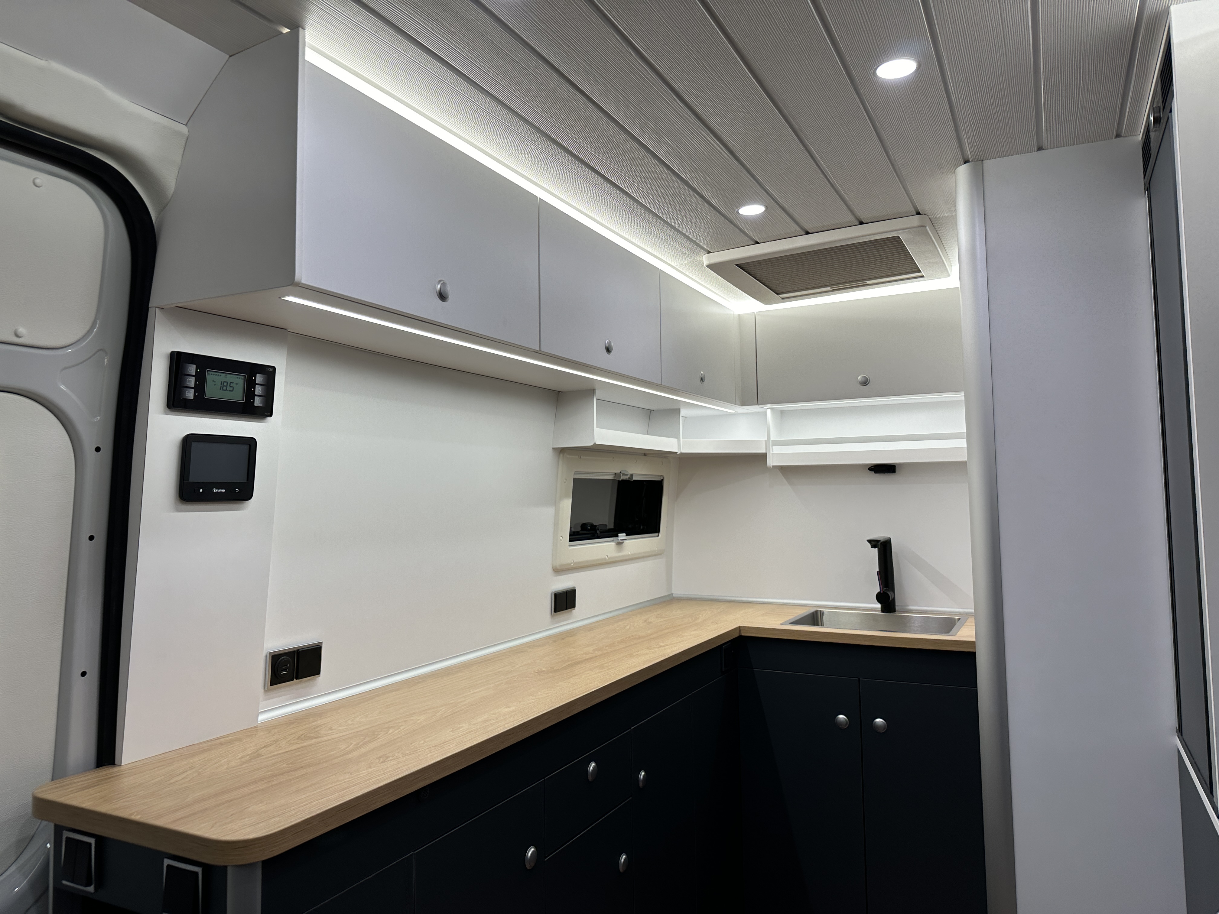 Ez a lakóautó hosszú távú lakhatásra készült, ügyfelünk egyedi igényei alapján, maximális kényelem és önállóság biztosításával. A megbízható energiaellátást 400Ah LiFePo4 akkumulátor és prémium Victron Energy rendszer biztosítja, amelyet négy 110W-os napelem egészít ki, így akár hosszabb ideig is önellátó marad, még távoli helyeken is. A belső térben kényelmes, franciaággyá alakítható kanapé, tágas konyhapult és komposztálós WC található, amelyek a lakóautó komfortját emelik. A dízel kombi kazán biztosítja a fűtést és a melegvízellátást, így a jármű minden évszakban otthonos érzetet nyújt. Az utazások során a beépített 5G antenna / router gondoskodik a gyors és stabil internetkapcsolatról, míg a külső kamerarendszer folyamatosan védi a lakóautót. A hátsó részben egy nagy tároló garázsrész került kialakításra, amely elegendő helyet biztosít különféle felszerelések számára. Emellett praktikus tárolóhelyek és átgondolt belső elrendezés segít abban, hogy minden szükséges eszköz kéznél legyen. Az intelligens világítási rendszer és az energiatakarékos megoldások tovább növelik a kényelmet, hogy ügyfelünk bárhol élvezhesse a modern élet luxusát, akár a városi forgatagtól távol, a természet közelségében.