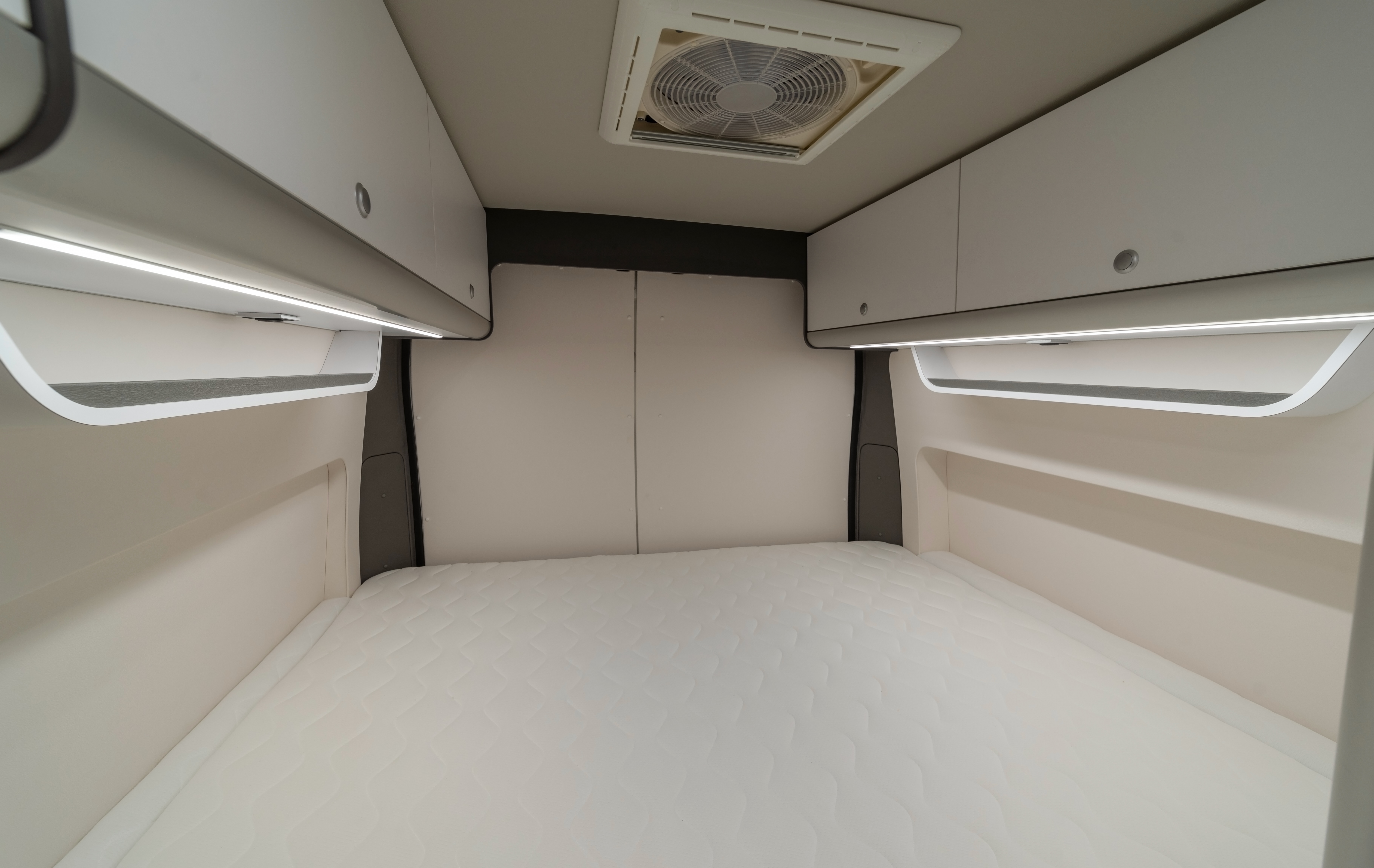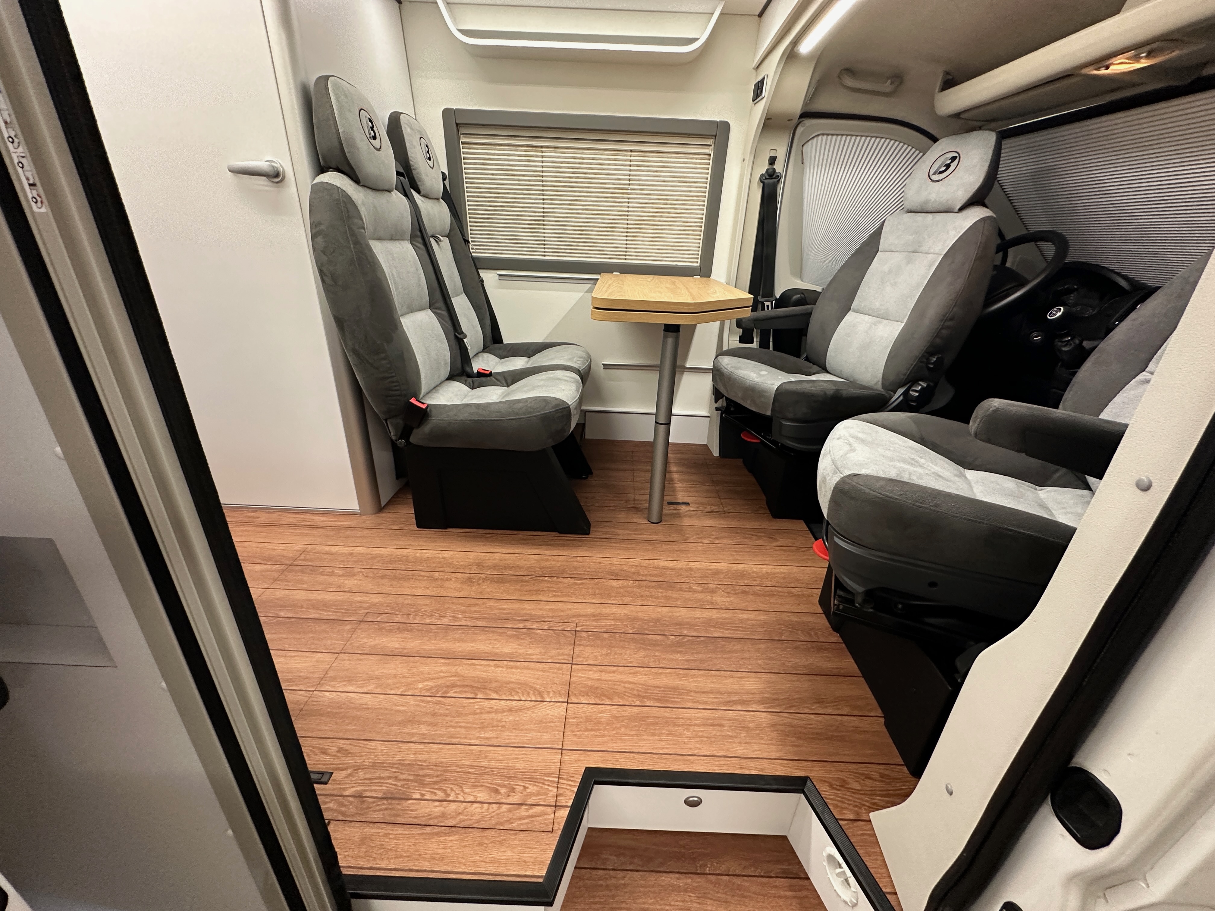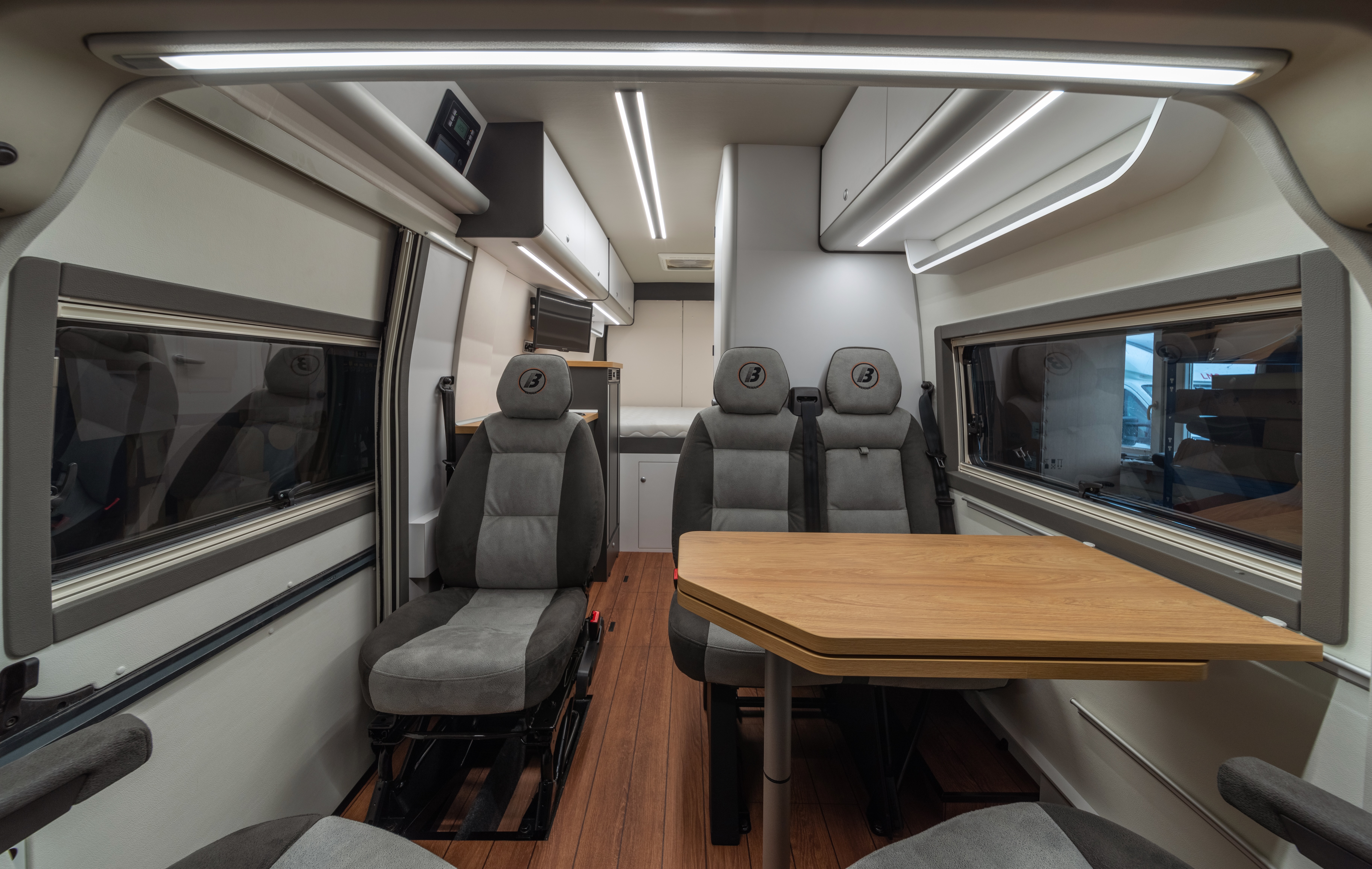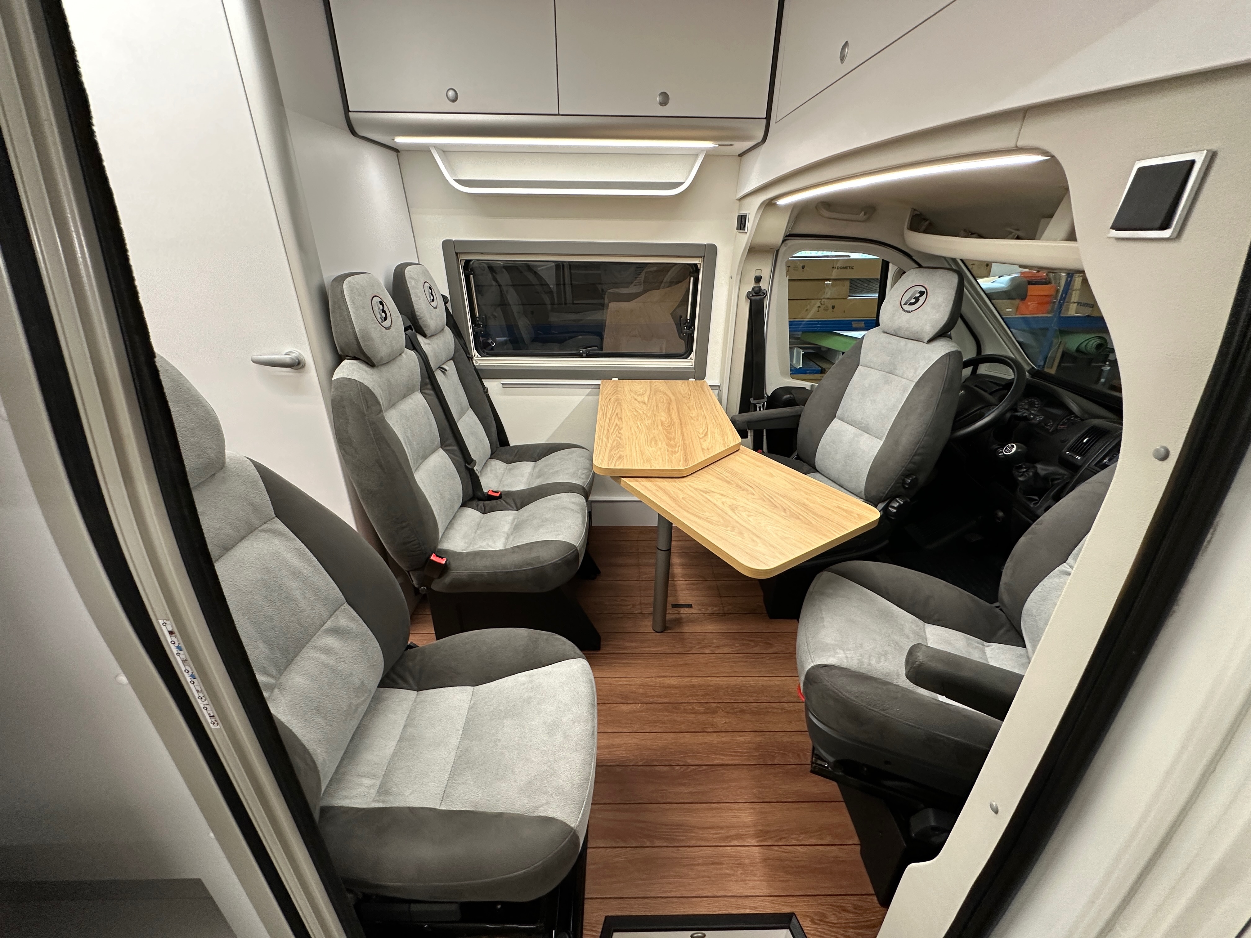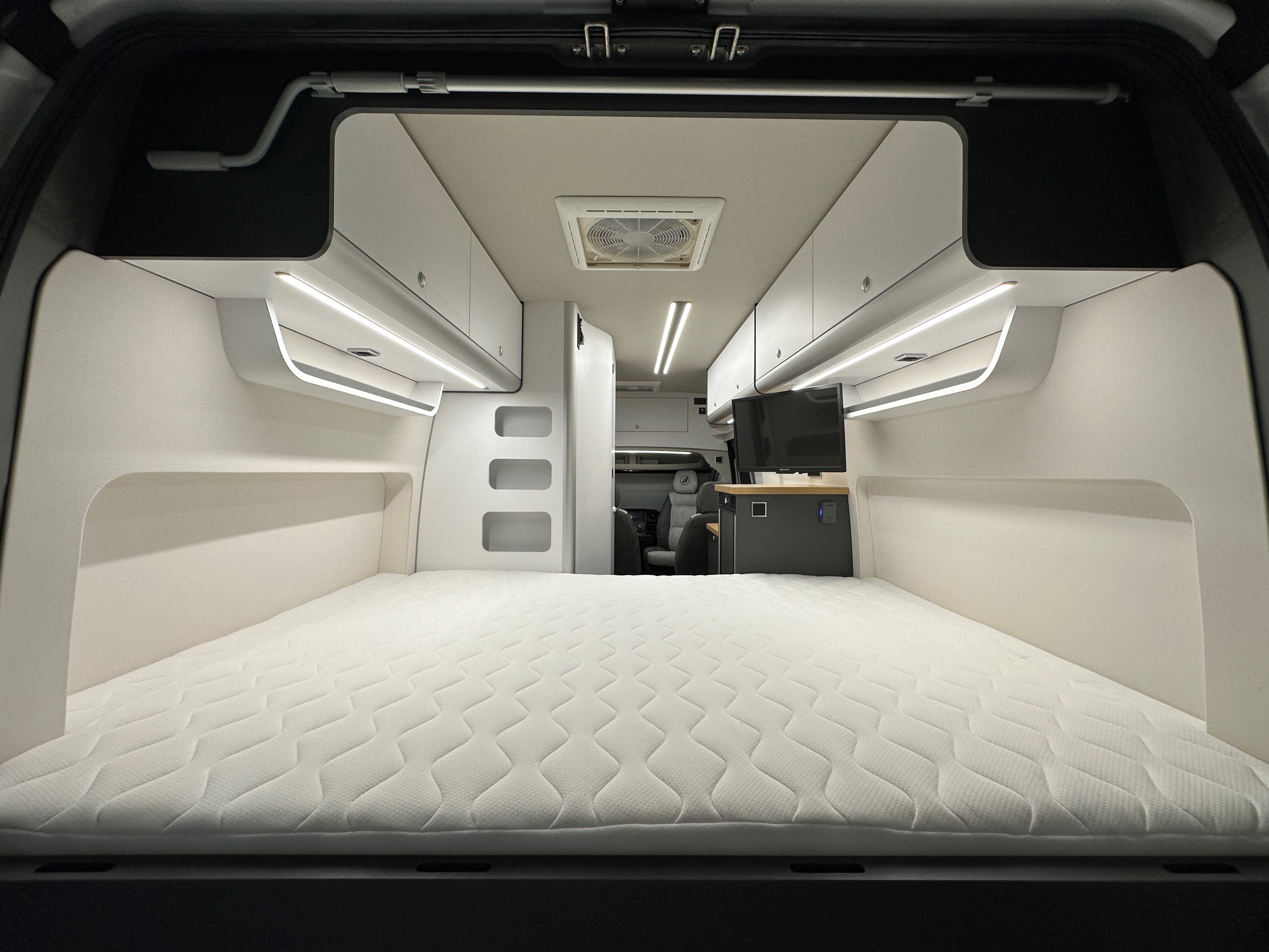 A világos, letisztult belső tér öt személy szállítására alkalmas, de az ötödik ülés könnyedén eltávolítható, így még tágasabb életteret biztosítva. A keresztirányban elhelyezett franciaágy a karosszéria bővítésének köszönhetően 2 méter hosszú, kényelmes alvóhelyet nyújtva. Számos rejtett tárolórekesz segíti a rendszerezést és a helykihasználást. A teljesen gázmentes kialakítású lakóautóban dízel kombi kazán és kompresszoros hűtő gondoskodik a fűtésről és hűtésről. A kényelmet tovább fokozza az állóhelyzeti klíma, amely biztosítja a megfelelő hőmérsékletet a pihenések során, valamint a beépített TV, amely szórakozást nyújt az utazások alatt. A tetőn elhelyezett napelemek lehetővé teszik az elektromos rendszerek önálló működtetését, függetlenül a külső áramforrásoktól. A belső tér kialakítása során különös figyelmet fordítottunk a praktikumra és a kényelemre, hogy hosszabb utazások során is otthonos környezetet biztosítson.