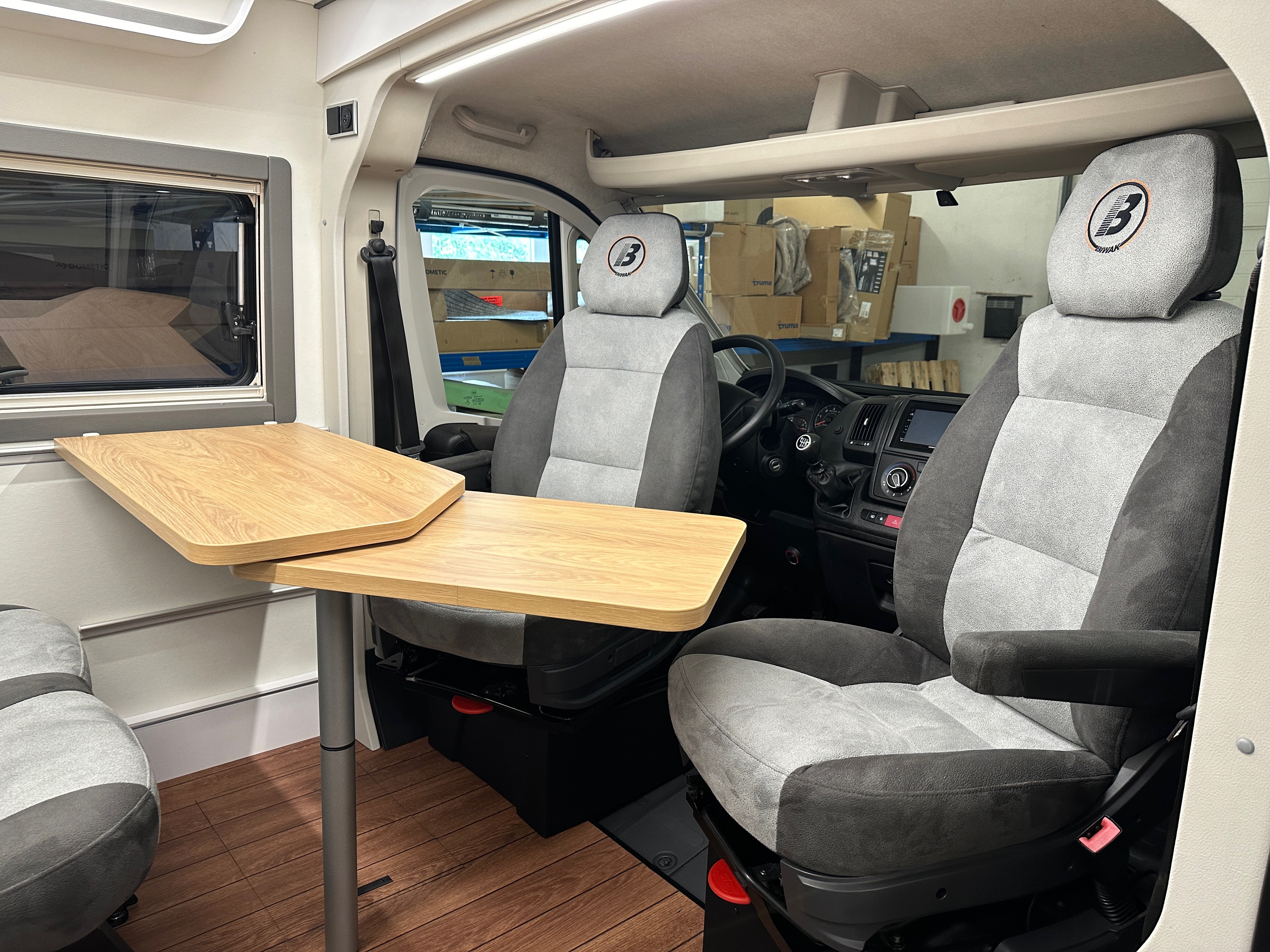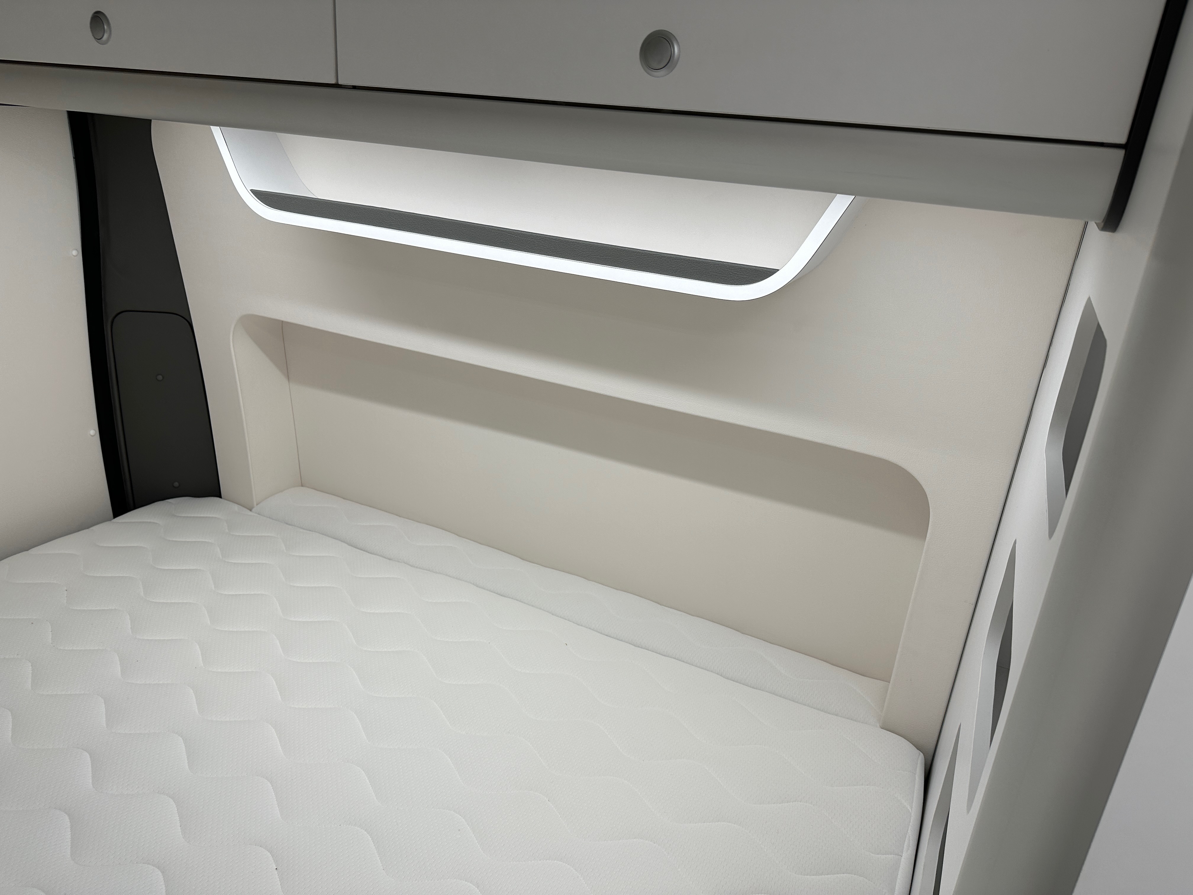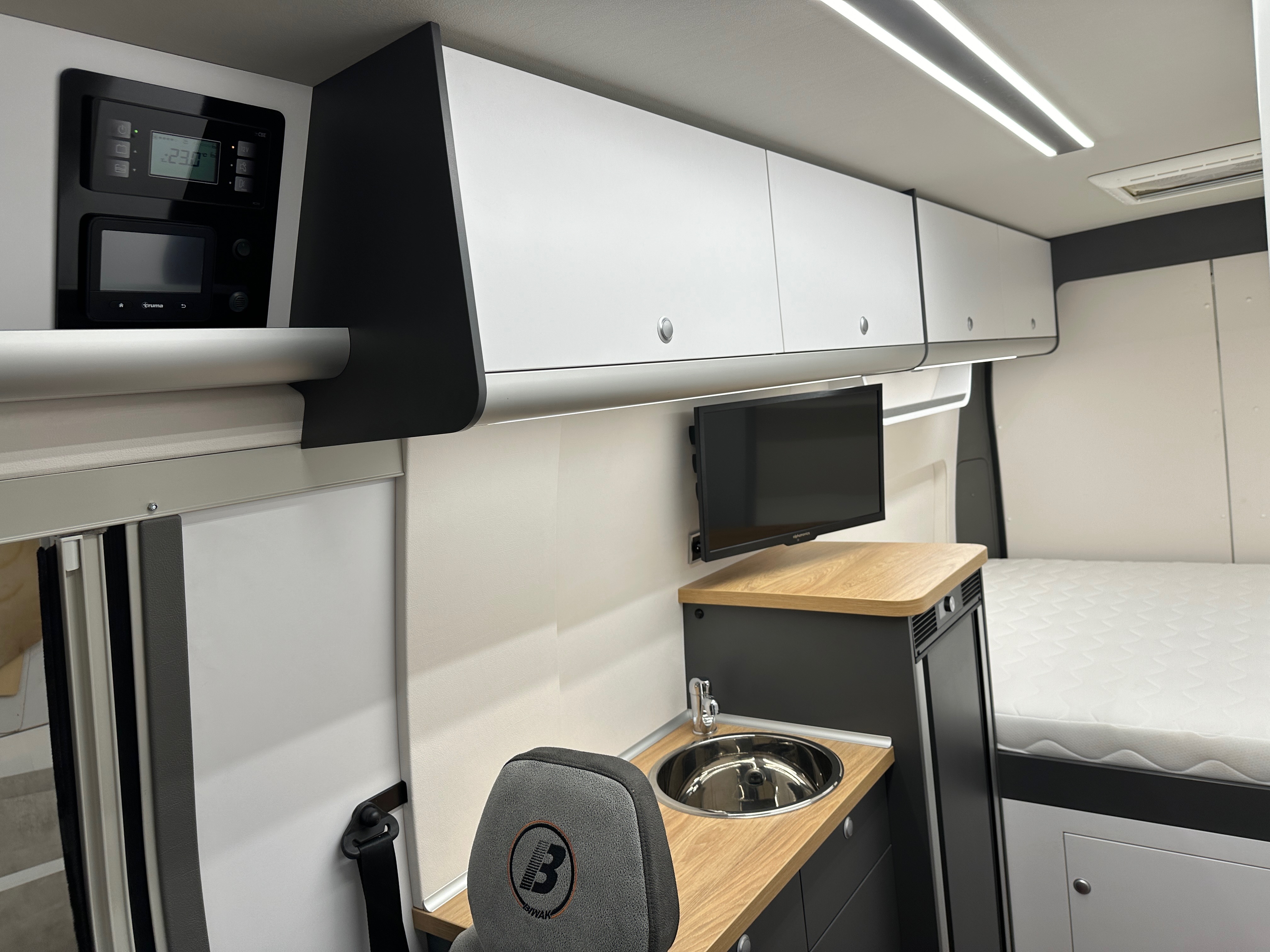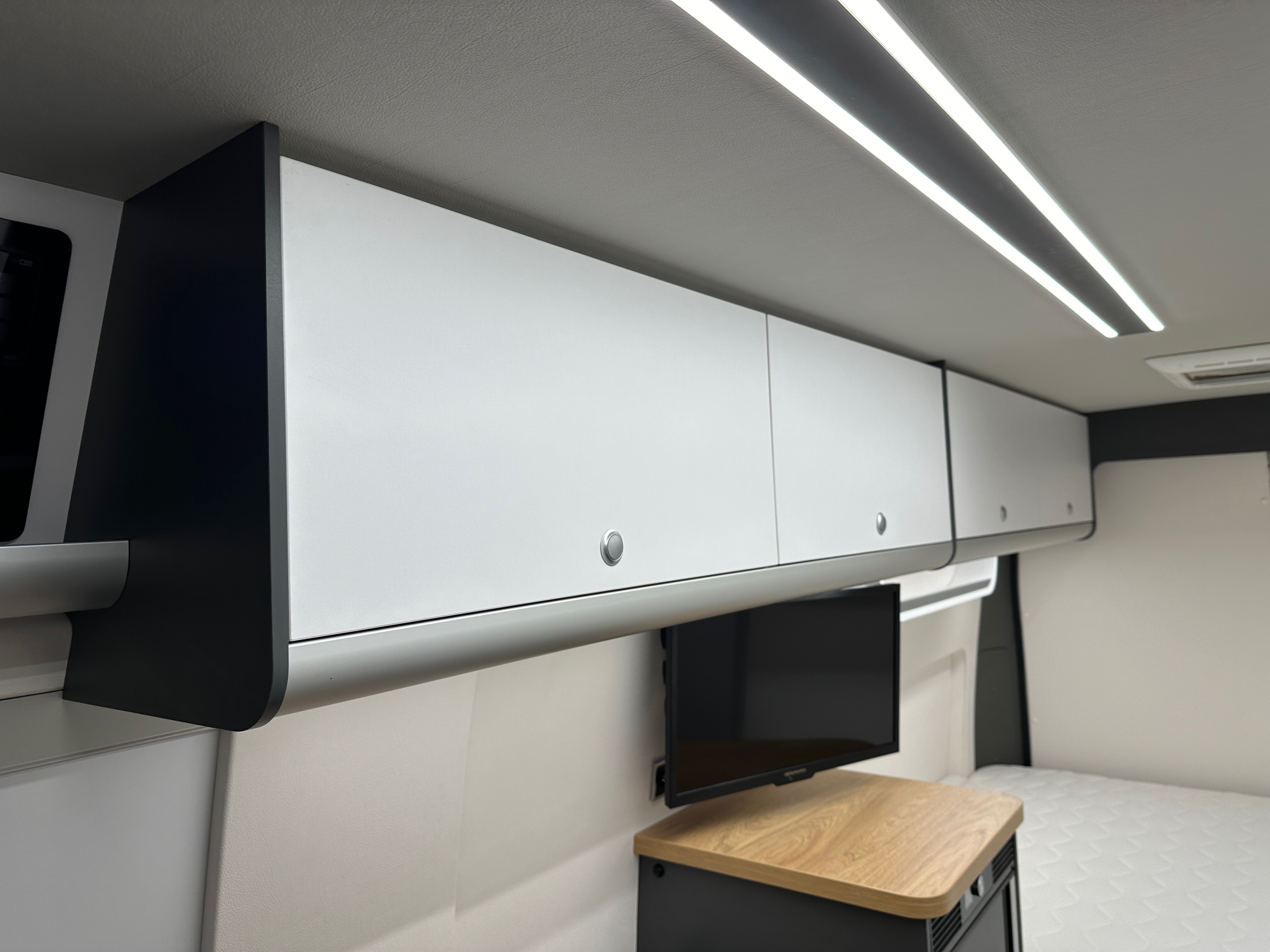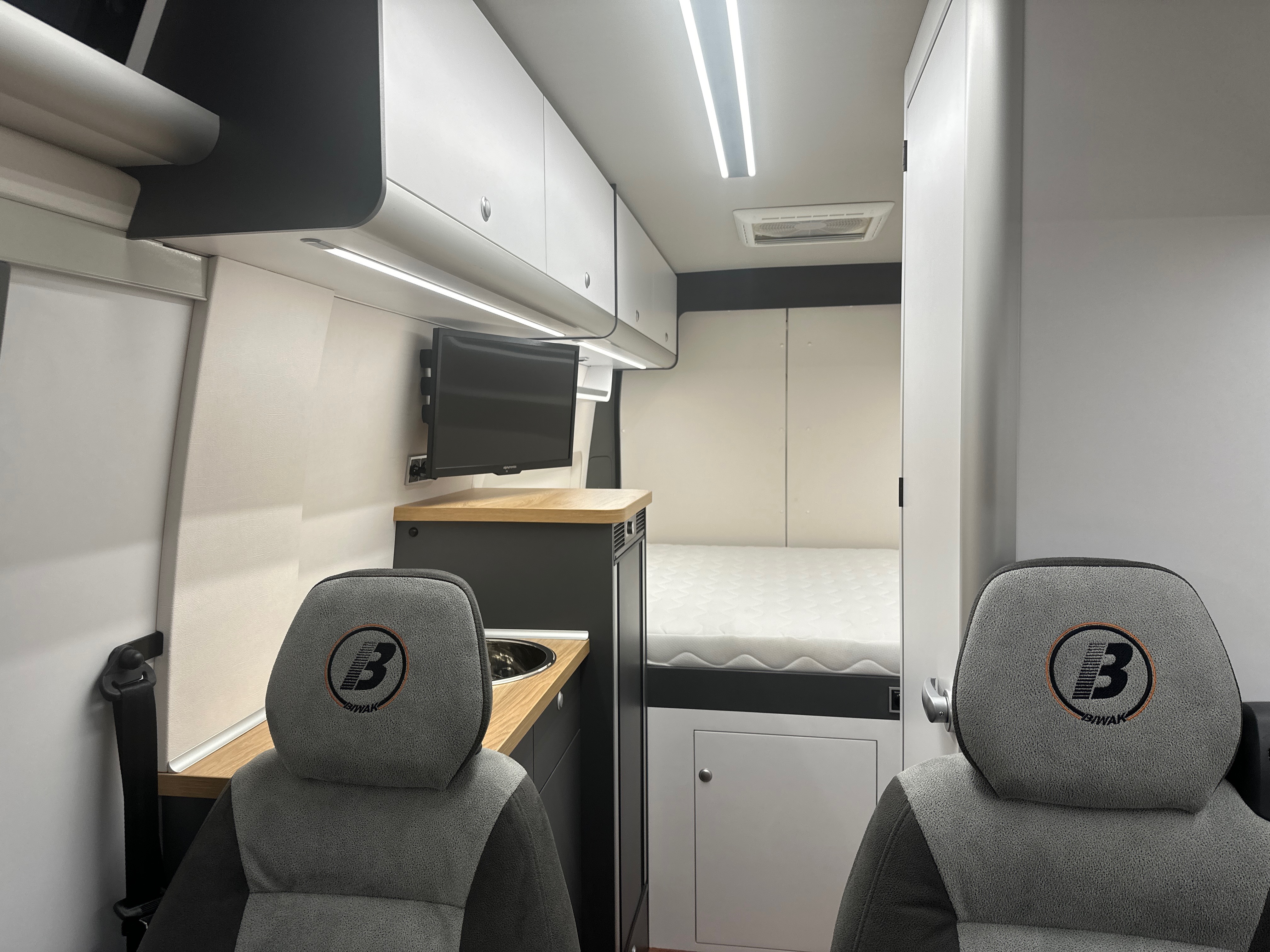 A világos, letisztult belső tér öt személy szállítására alkalmas, de az ötödik ülés könnyedén eltávolítható, így még tágasabb életteret biztosítva. A keresztirányban elhelyezett franciaágy a karosszéria bővítésének köszönhetően 2 méter hosszú, kényelmes alvóhelyet nyújtva. Számos rejtett tárolórekesz segíti a rendszerezést és a helykihasználást. A teljesen gázmentes kialakítású lakóautóban dízel kombi kazán és kompresszoros hűtő gondoskodik a fűtésről és hűtésről. A kényelmet tovább fokozza az állóhelyzeti klíma, amely biztosítja a megfelelő hőmérsékletet a pihenések során, valamint a beépített TV, amely szórakozást nyújt az utazások alatt. A tetőn elhelyezett napelemek lehetővé teszik az elektromos rendszerek önálló működtetését, függetlenül a külső áramforrásoktól. A belső tér kialakítása során különös figyelmet fordítottunk a praktikumra és a kényelemre, hogy hosszabb utazások során is otthonos környezetet biztosítson.