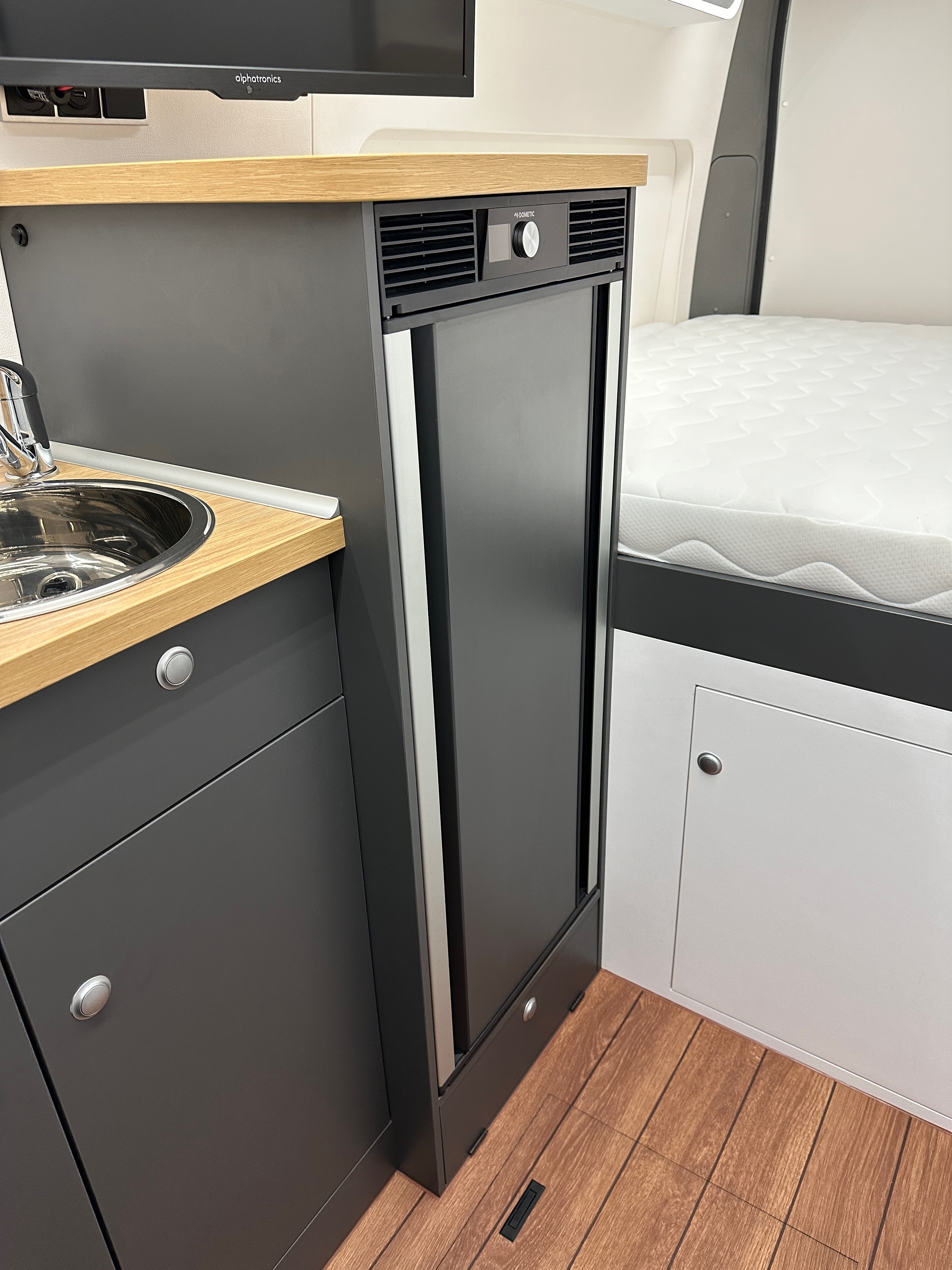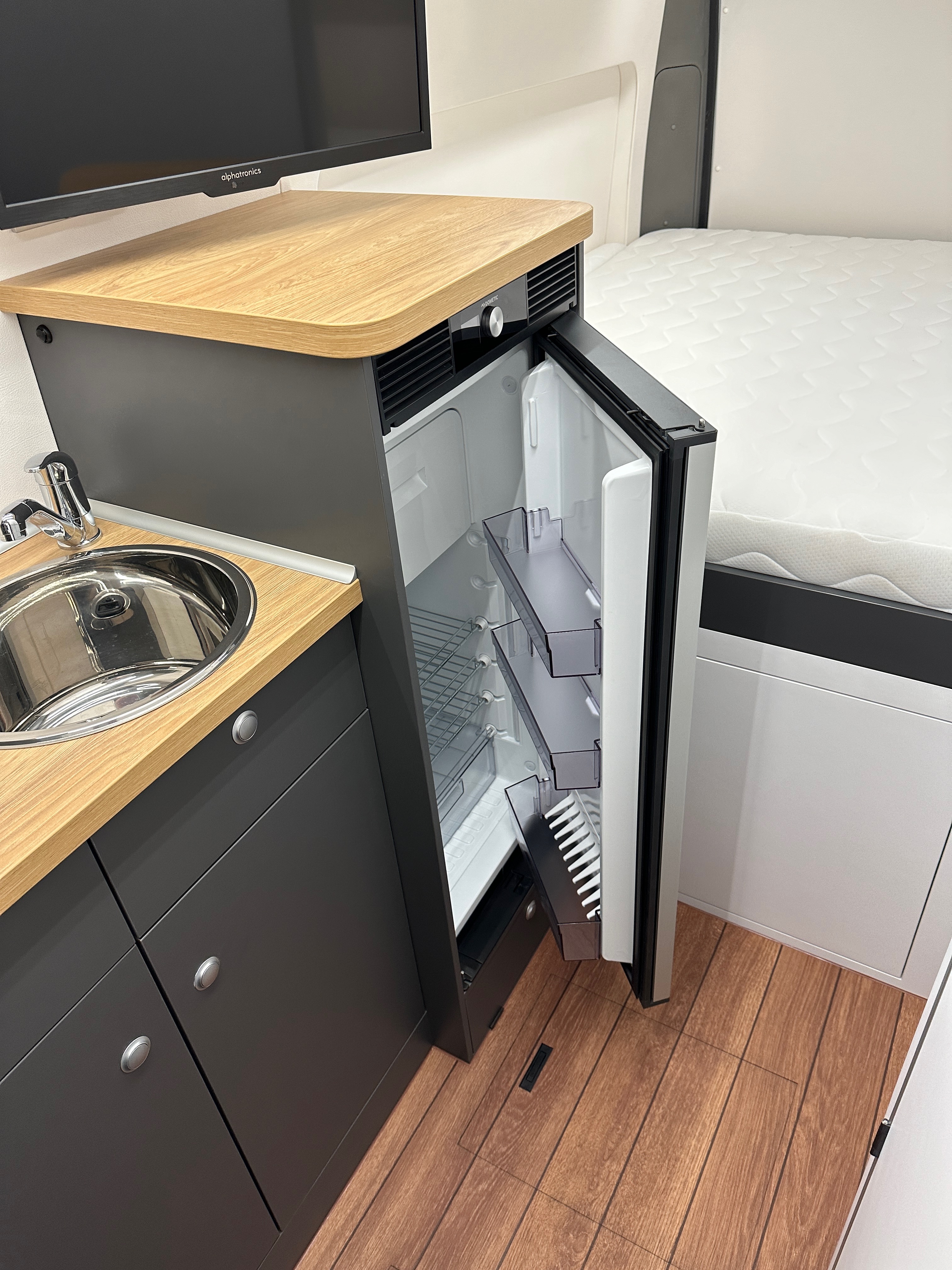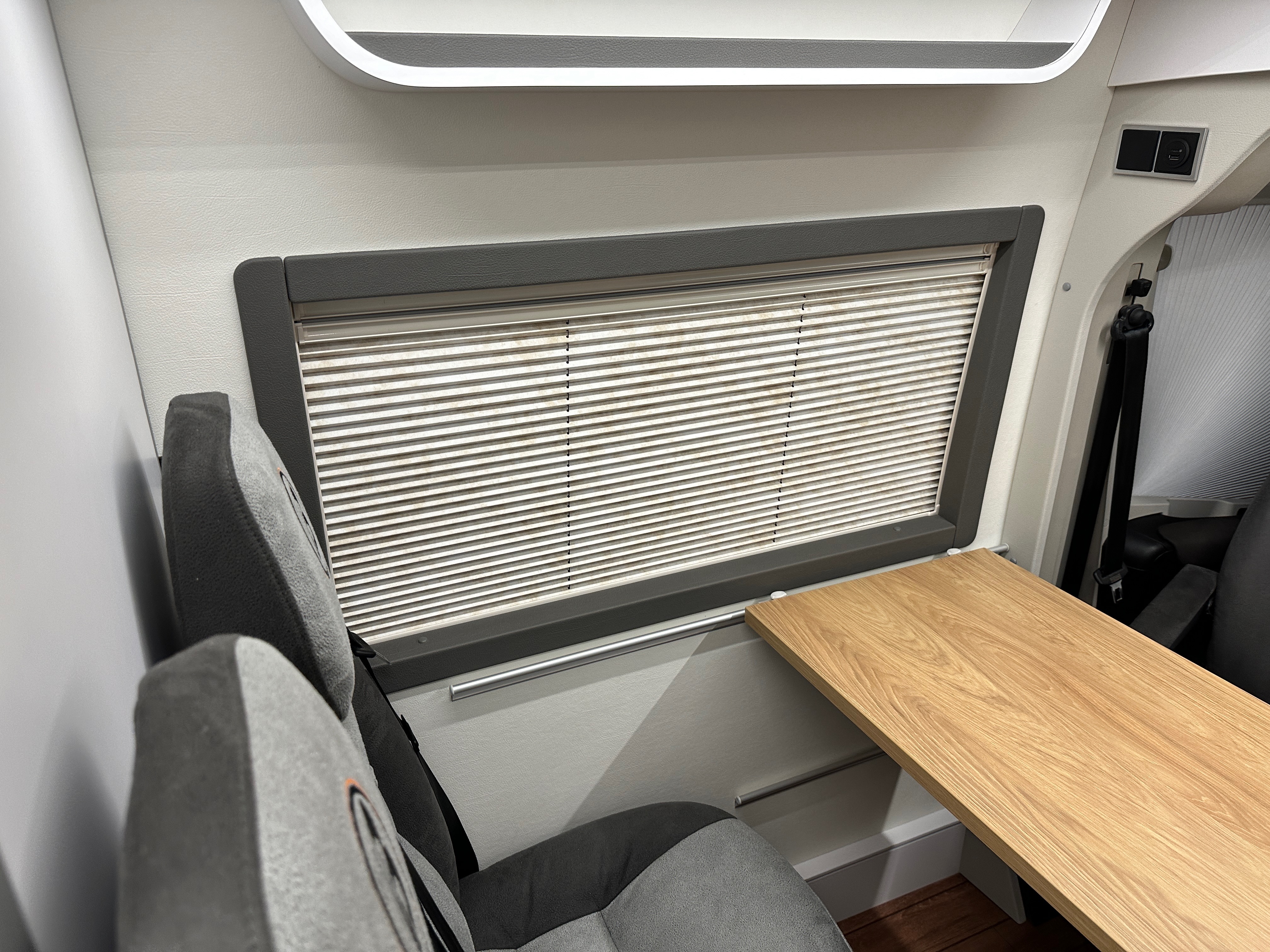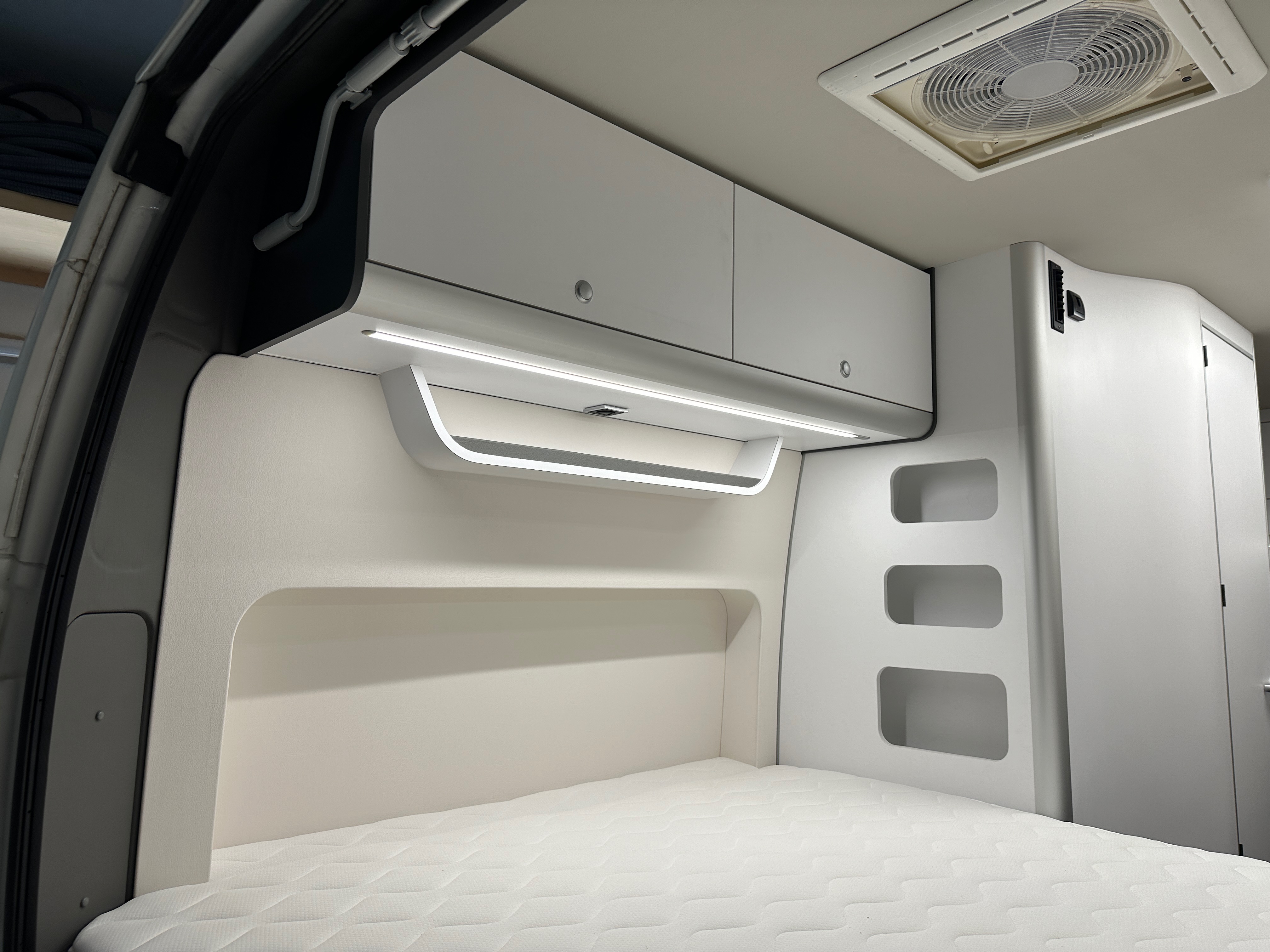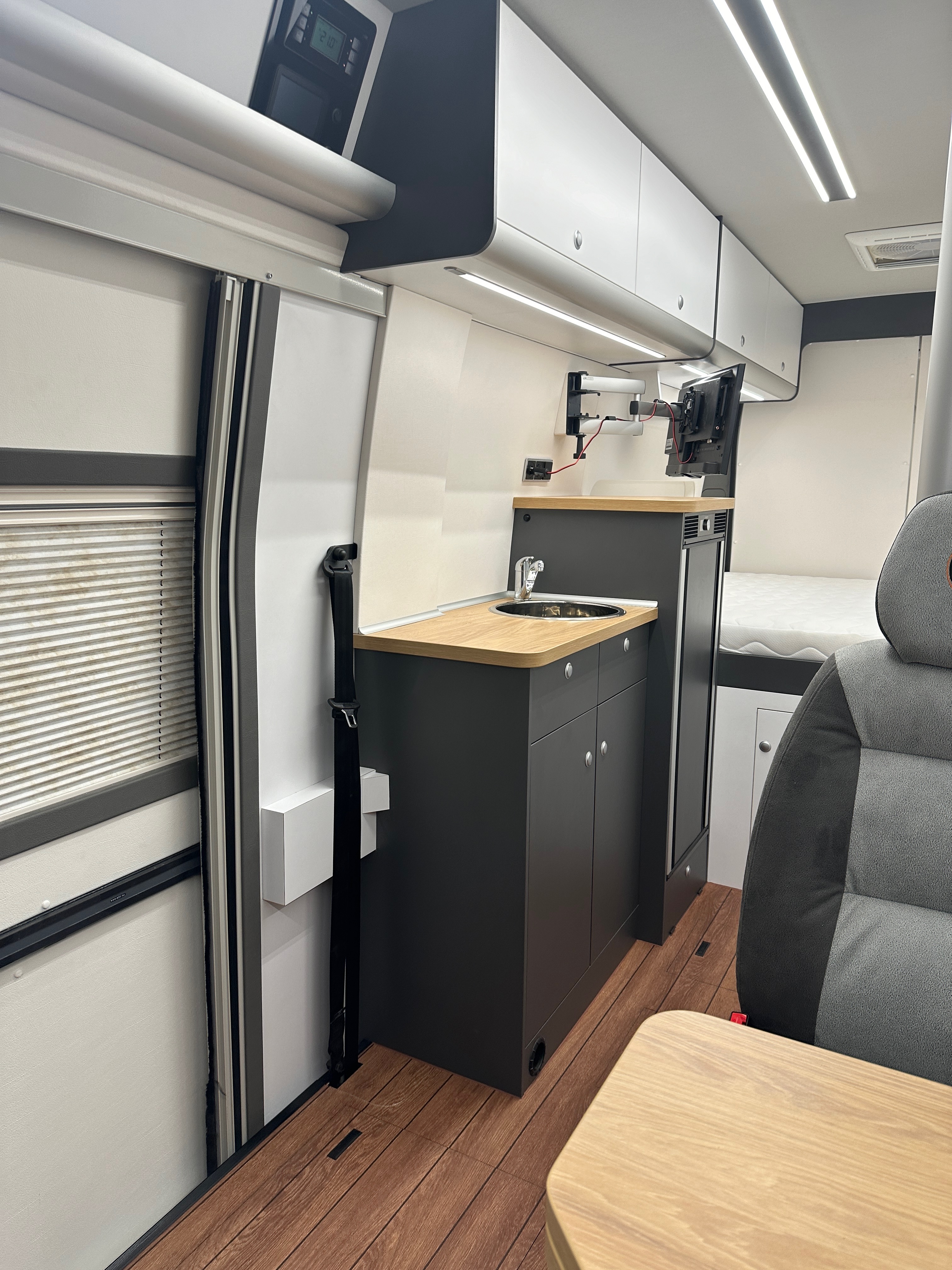 A világos, letisztult belső tér öt személy szállítására alkalmas, de az ötödik ülés könnyedén eltávolítható, így még tágasabb életteret biztosítva. A keresztirányban elhelyezett franciaágy a karosszéria bővítésének köszönhetően 2 méter hosszú, kényelmes alvóhelyet nyújtva. Számos rejtett tárolórekesz segíti a rendszerezést és a helykihasználást. A teljesen gázmentes kialakítású lakóautóban dízel kombi kazán és kompresszoros hűtő gondoskodik a fűtésről és hűtésről. A kényelmet tovább fokozza az állóhelyzeti klíma, amely biztosítja a megfelelő hőmérsékletet a pihenések során, valamint a beépített TV, amely szórakozást nyújt az utazások alatt. A tetőn elhelyezett napelemek lehetővé teszik az elektromos rendszerek önálló működtetését, függetlenül a külső áramforrásoktól. A belső tér kialakítása során különös figyelmet fordítottunk a praktikumra és a kényelemre, hogy hosszabb utazások során is otthonos környezetet biztosítson.