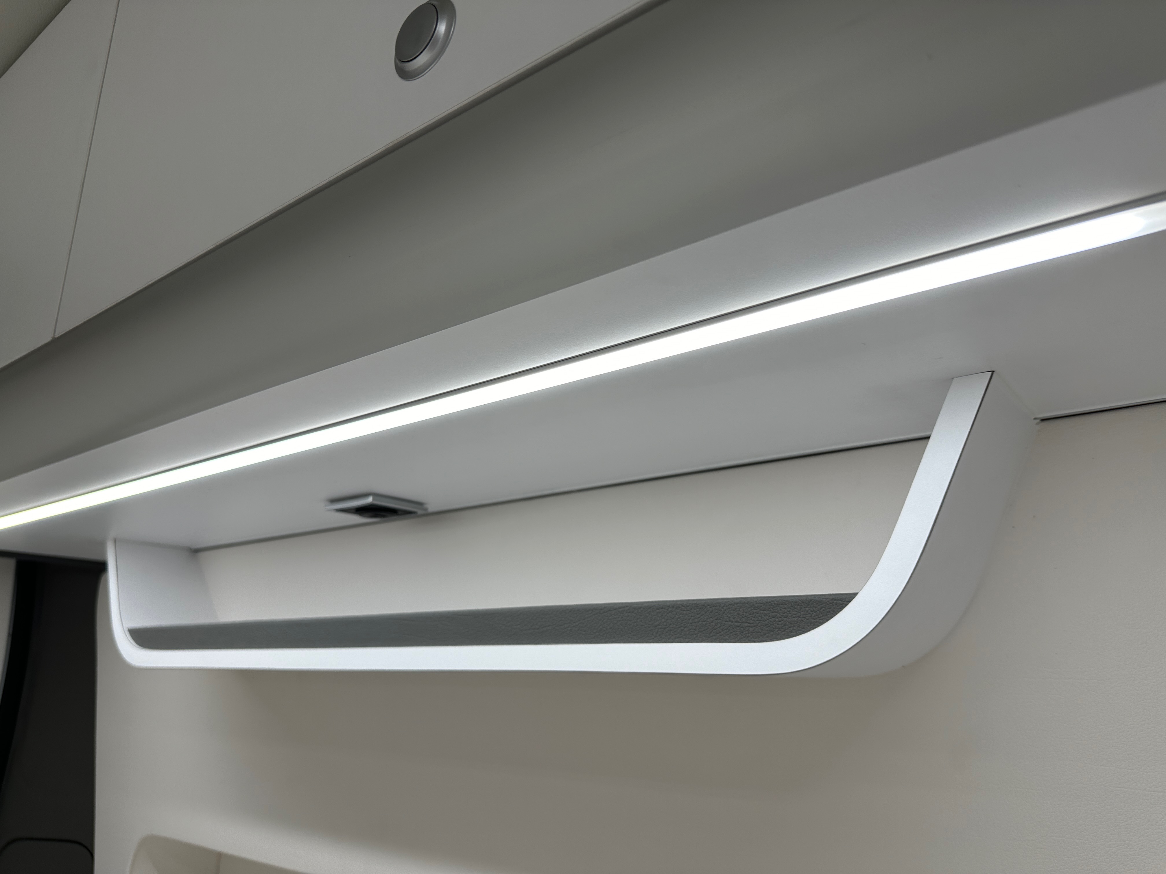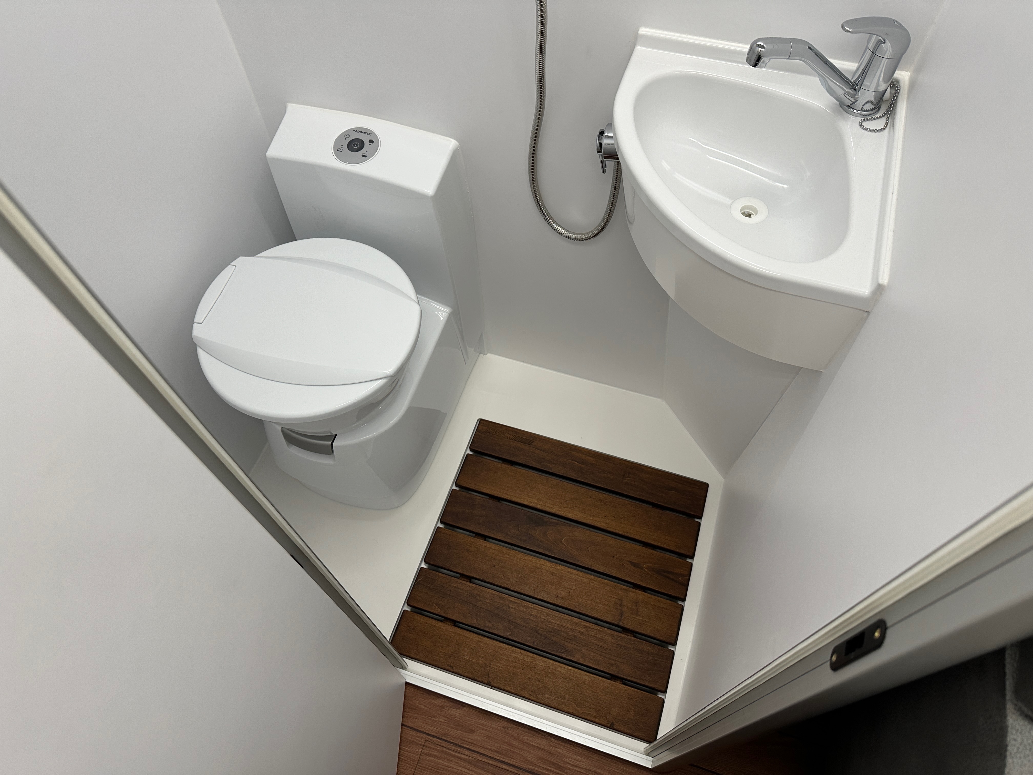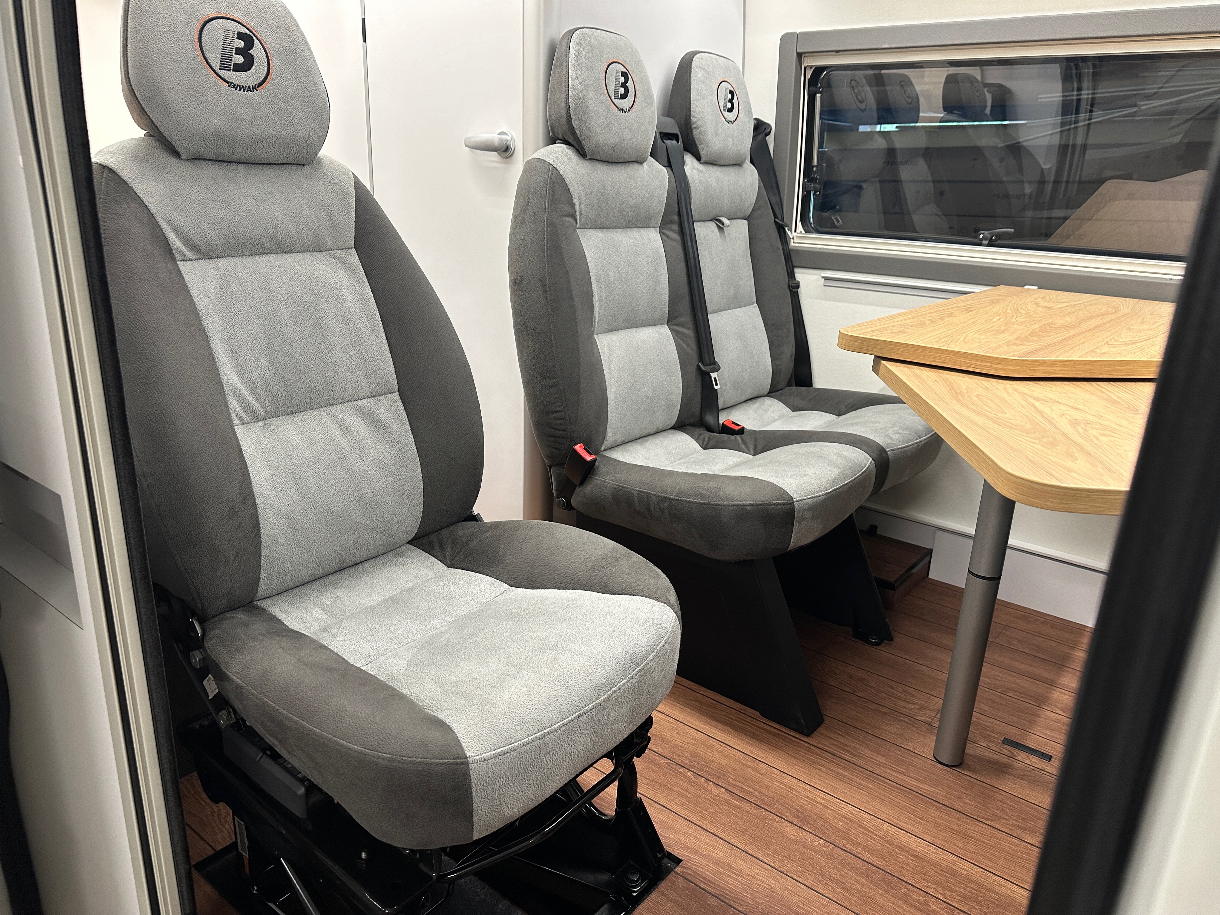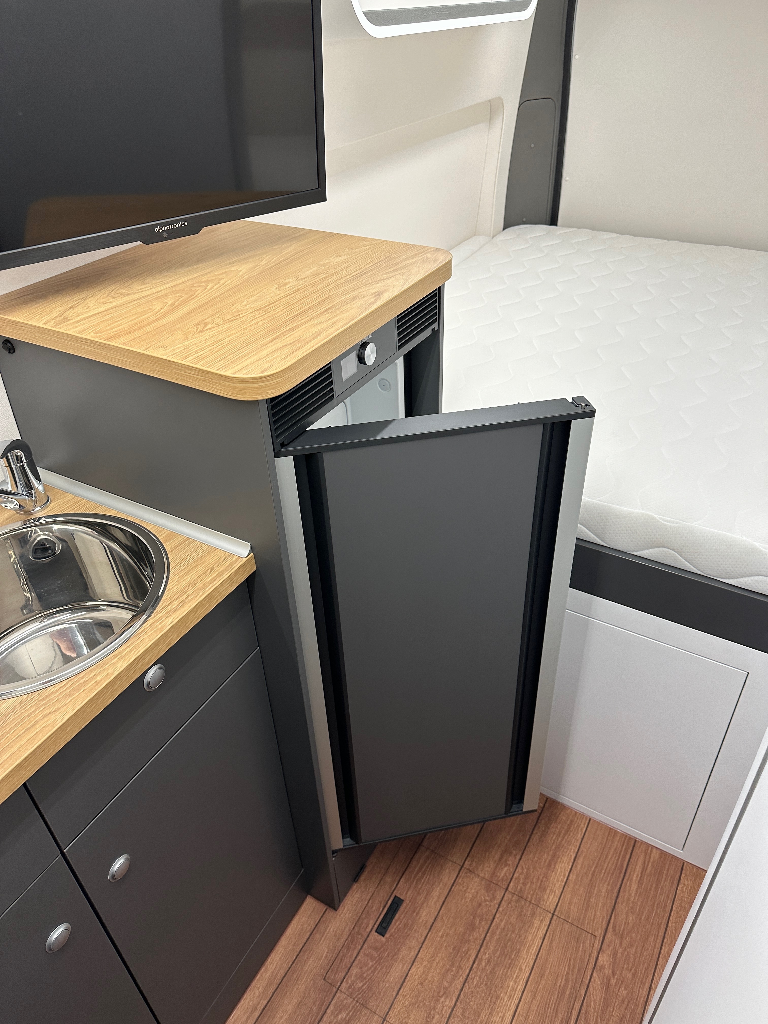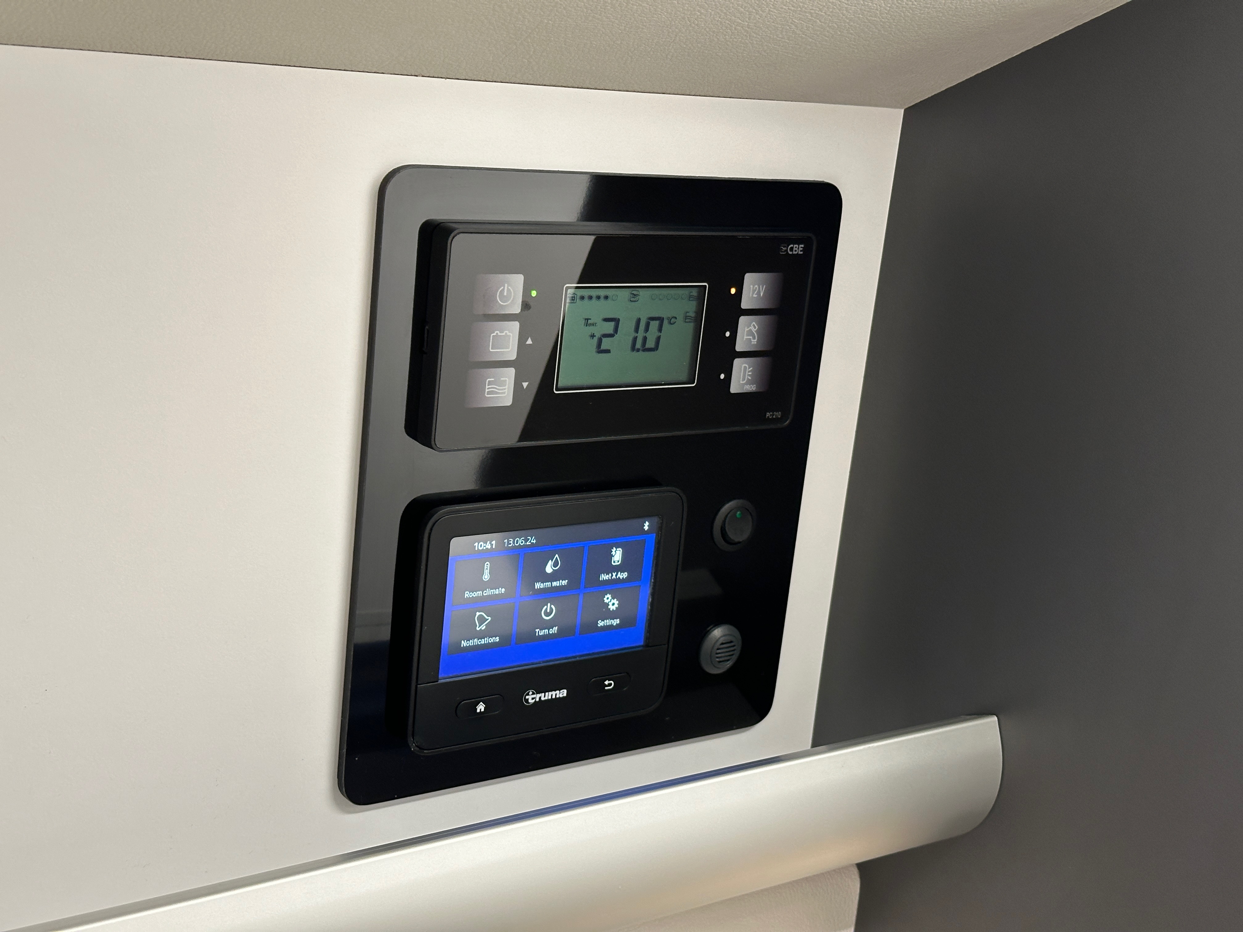 A világos, letisztult belső tér öt személy szállítására alkalmas, de az ötödik ülés könnyedén eltávolítható, így még tágasabb életteret biztosítva. A keresztirányban elhelyezett franciaágy a karosszéria bővítésének köszönhetően 2 méter hosszú, kényelmes alvóhelyet nyújtva. Számos rejtett tárolórekesz segíti a rendszerezést és a helykihasználást. A teljesen gázmentes kialakítású lakóautóban dízel kombi kazán és kompresszoros hűtő gondoskodik a fűtésről és hűtésről. A kényelmet tovább fokozza az állóhelyzeti klíma, amely biztosítja a megfelelő hőmérsékletet a pihenések során, valamint a beépített TV, amely szórakozást nyújt az utazások alatt. A tetőn elhelyezett napelemek lehetővé teszik az elektromos rendszerek önálló működtetését, függetlenül a külső áramforrásoktól. A belső tér kialakítása során különös figyelmet fordítottunk a praktikumra és a kényelemre, hogy hosszabb utazások során is otthonos környezetet biztosítson.