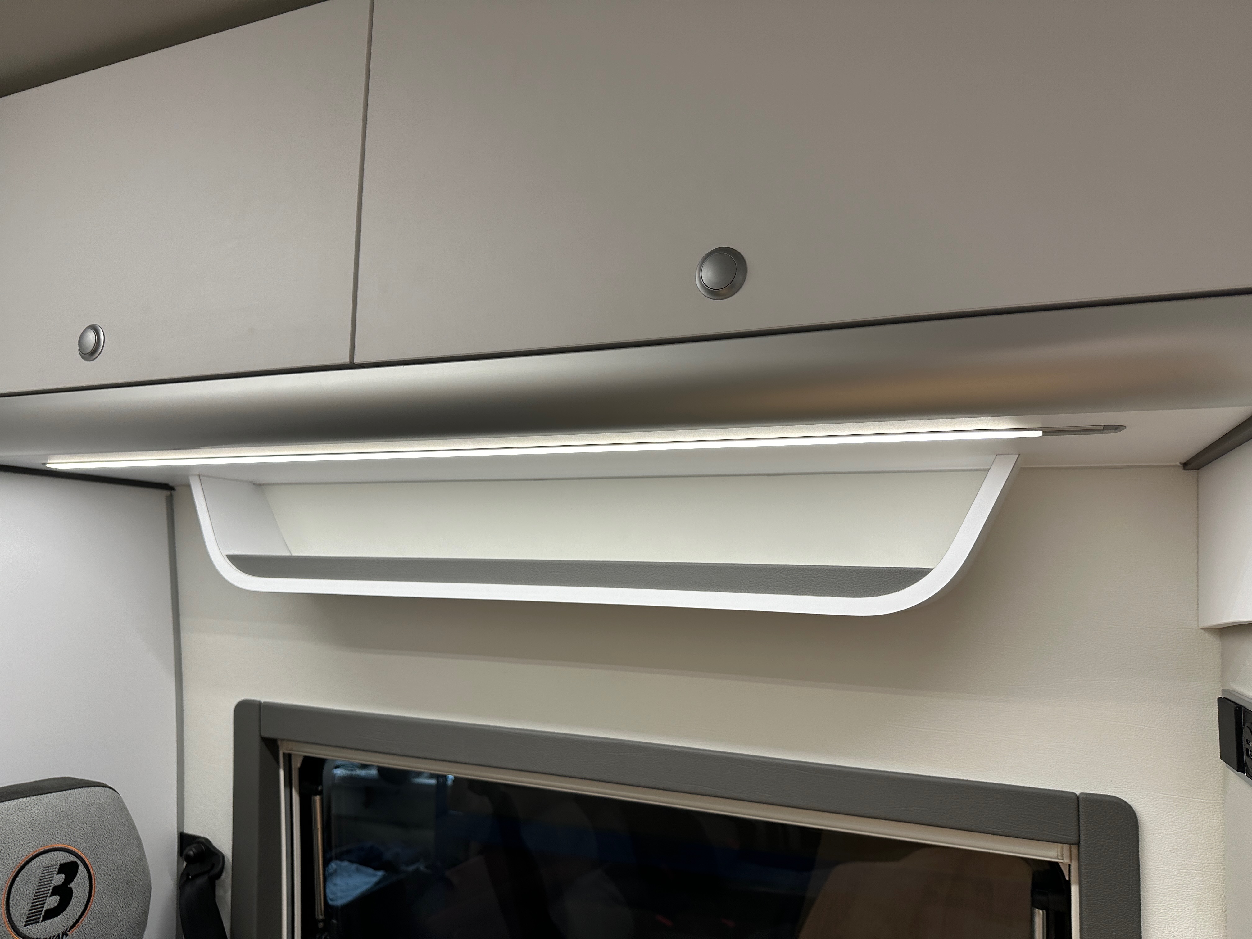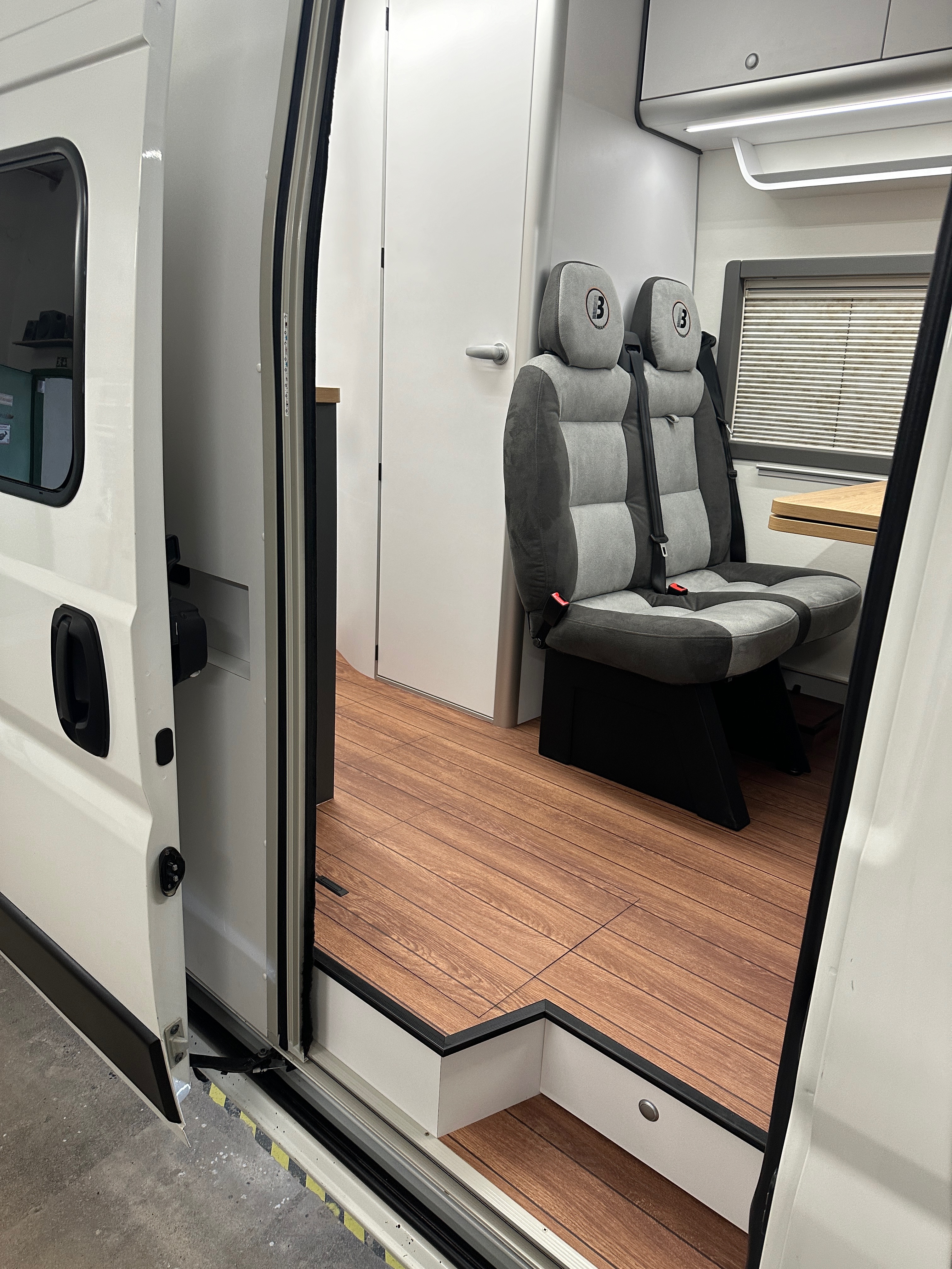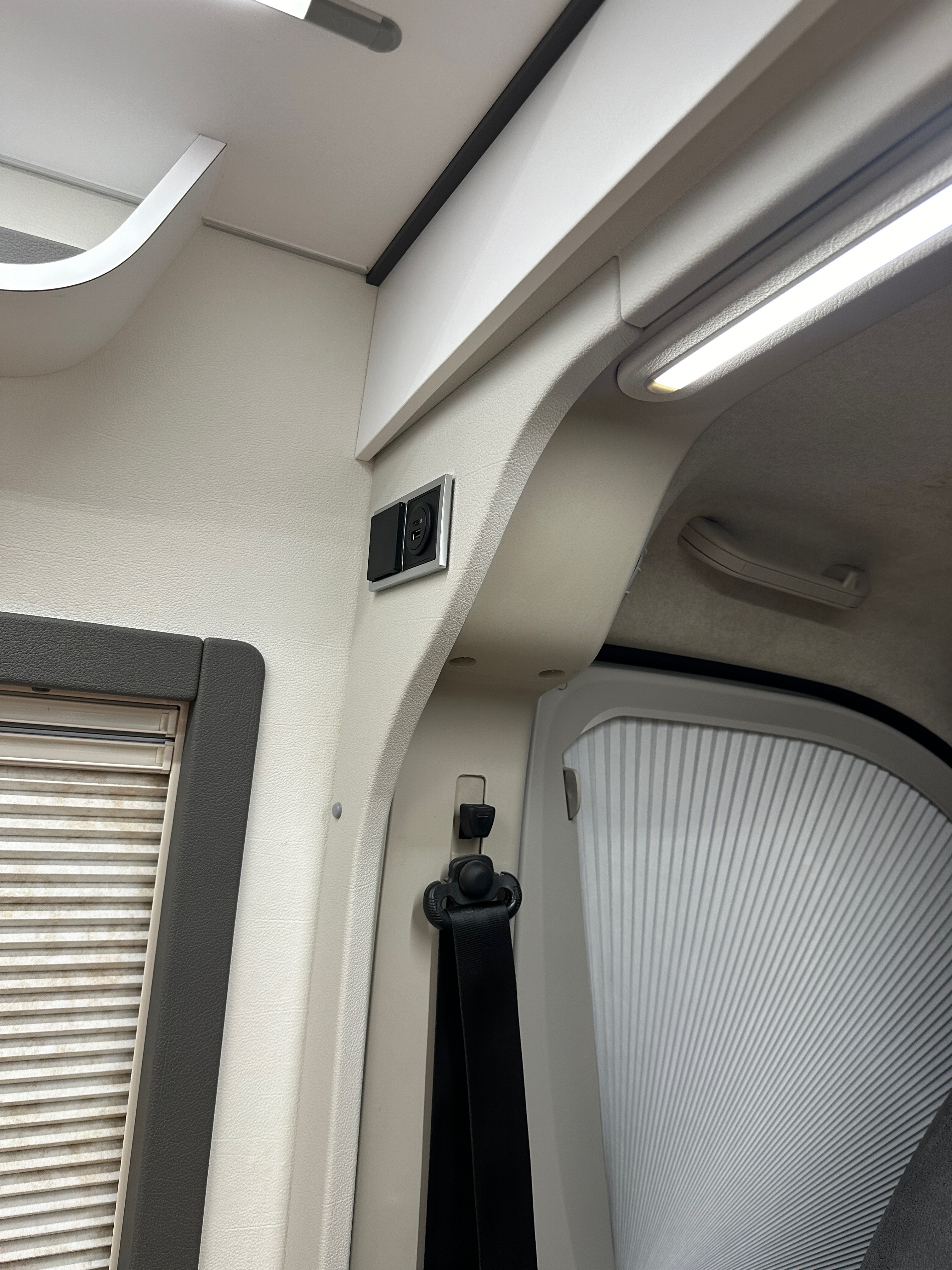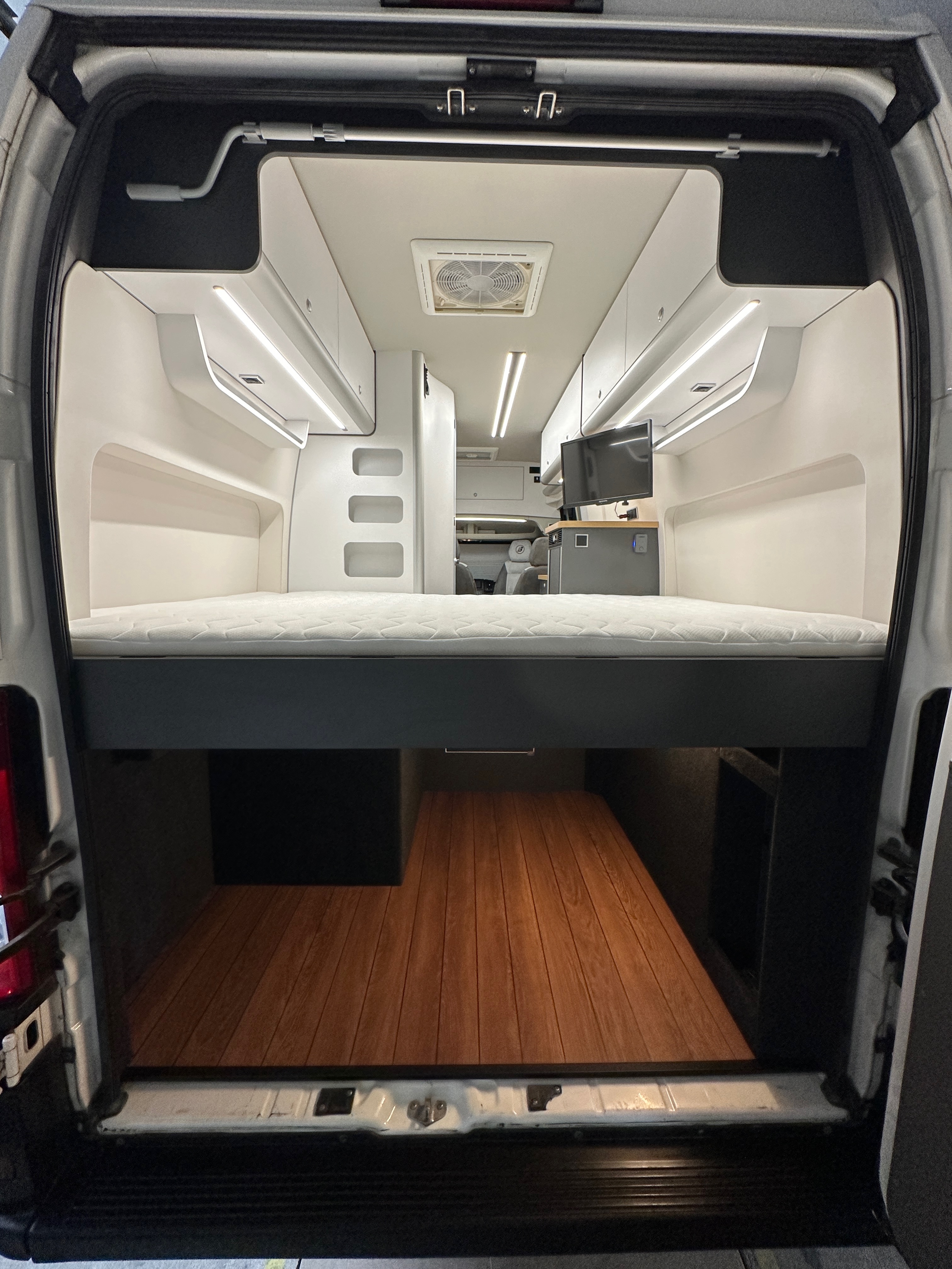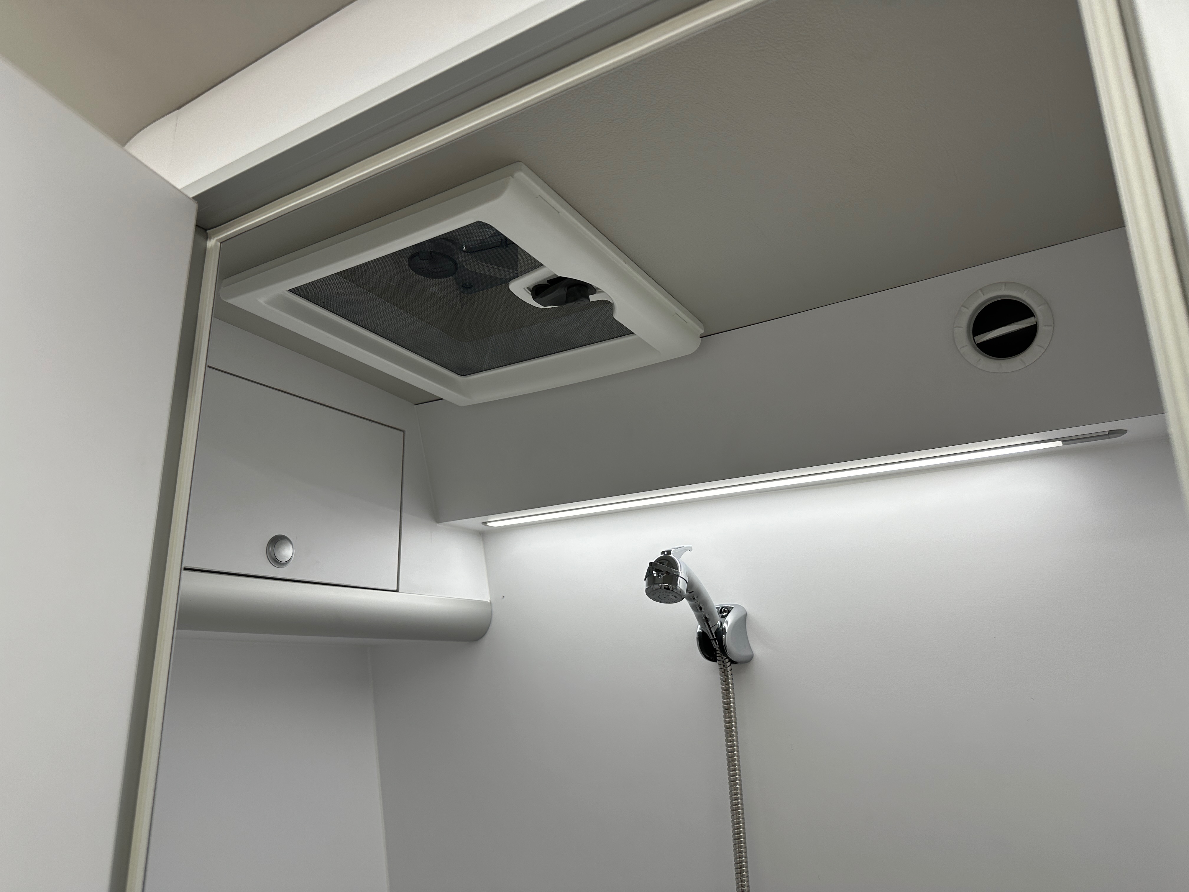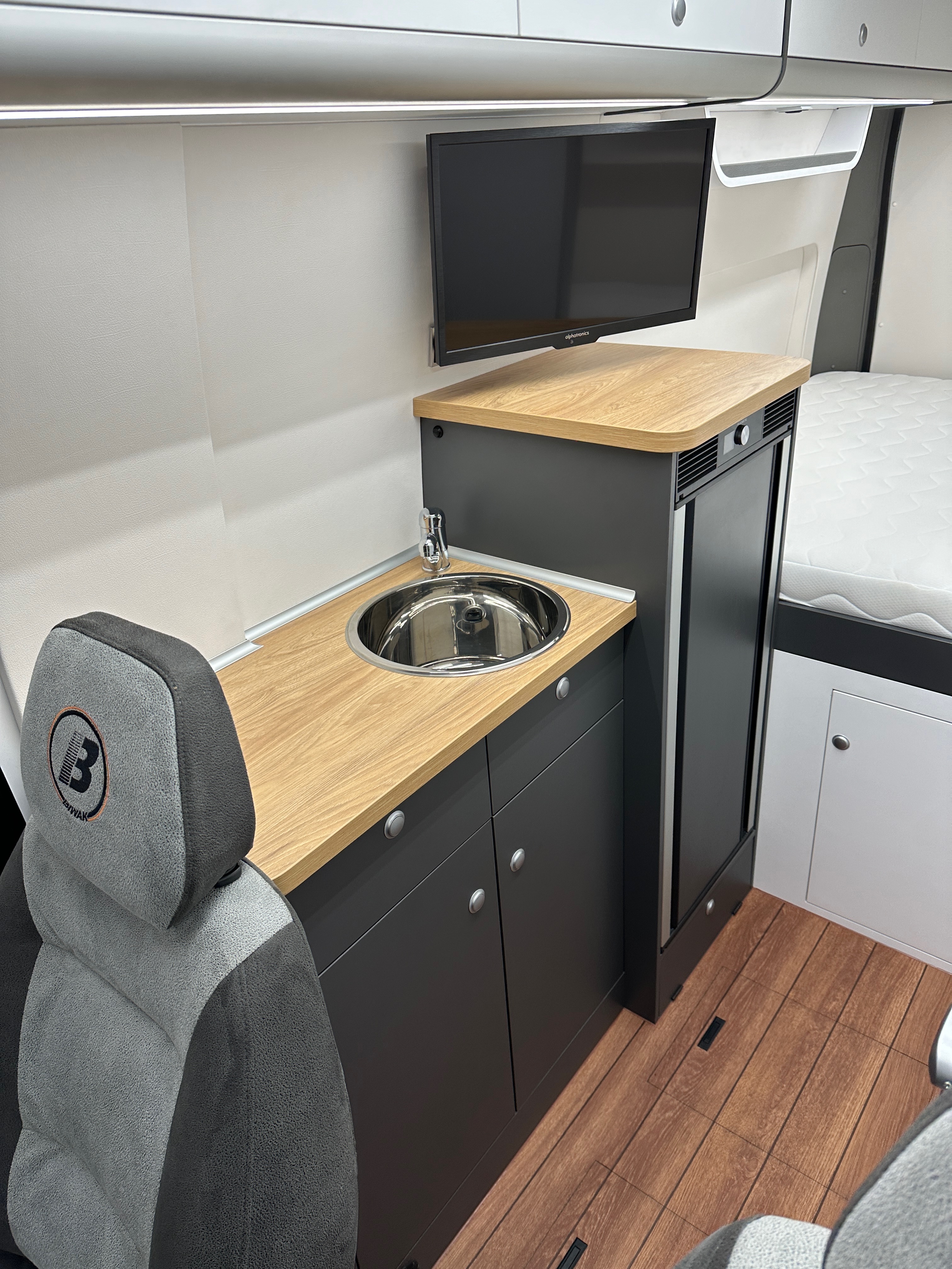 A világos, letisztult belső tér öt személy szállítására alkalmas, de az ötödik ülés könnyedén eltávolítható, így még tágasabb életteret biztosítva. A keresztirányban elhelyezett franciaágy a karosszéria bővítésének köszönhetően 2 méter hosszú, kényelmes alvóhelyet nyújtva. Számos rejtett tárolórekesz segíti a rendszerezést és a helykihasználást. A teljesen gázmentes kialakítású lakóautóban dízel kombi kazán és kompresszoros hűtő gondoskodik a fűtésről és hűtésről. A kényelmet tovább fokozza az állóhelyzeti klíma, amely biztosítja a megfelelő hőmérsékletet a pihenések során, valamint a beépített TV, amely szórakozást nyújt az utazások alatt. A tetőn elhelyezett napelemek lehetővé teszik az elektromos rendszerek önálló működtetését, függetlenül a külső áramforrásoktól. A belső tér kialakítása során különös figyelmet fordítottunk a praktikumra és a kényelemre, hogy hosszabb utazások során is otthonos környezetet biztosítson.