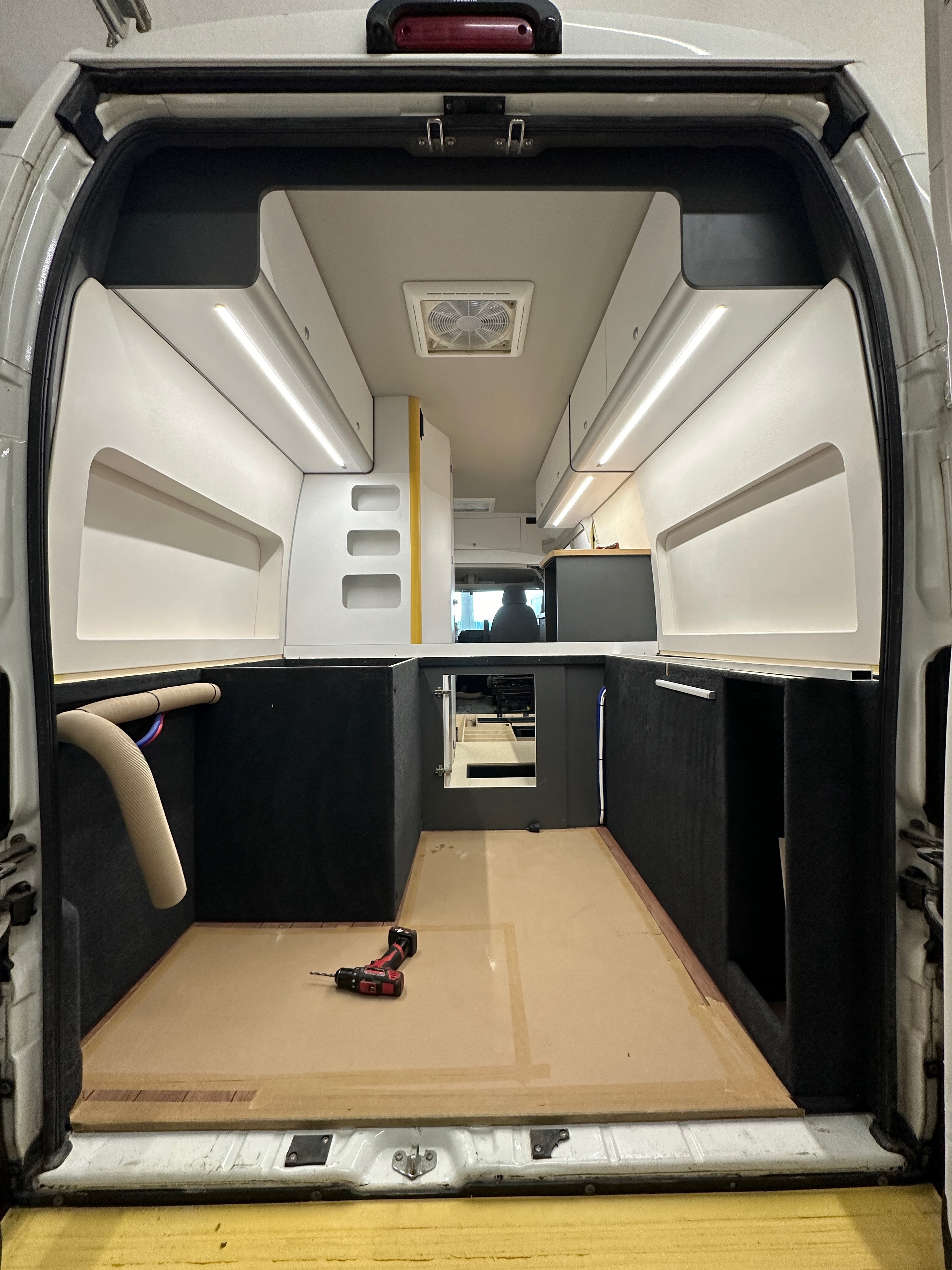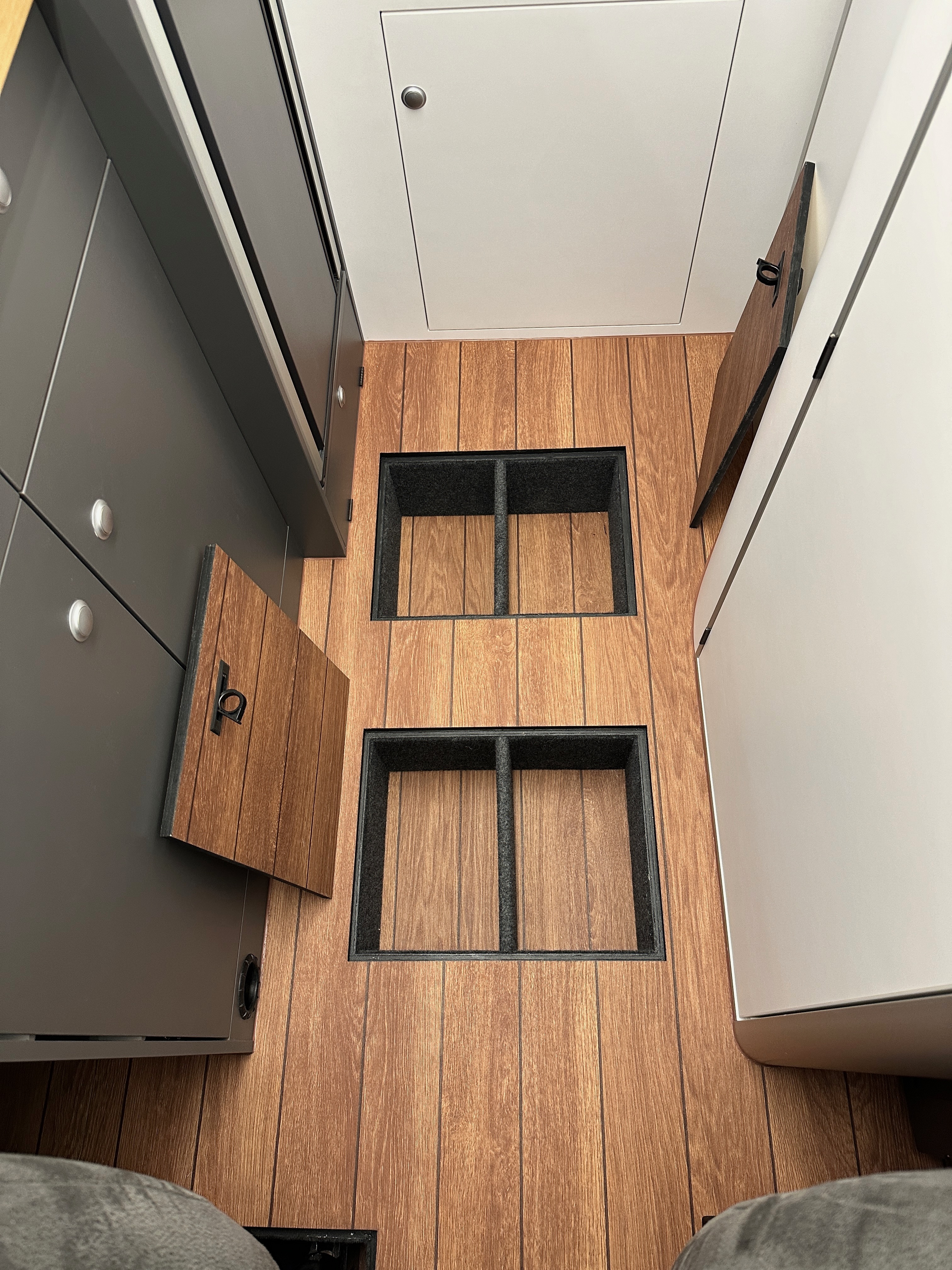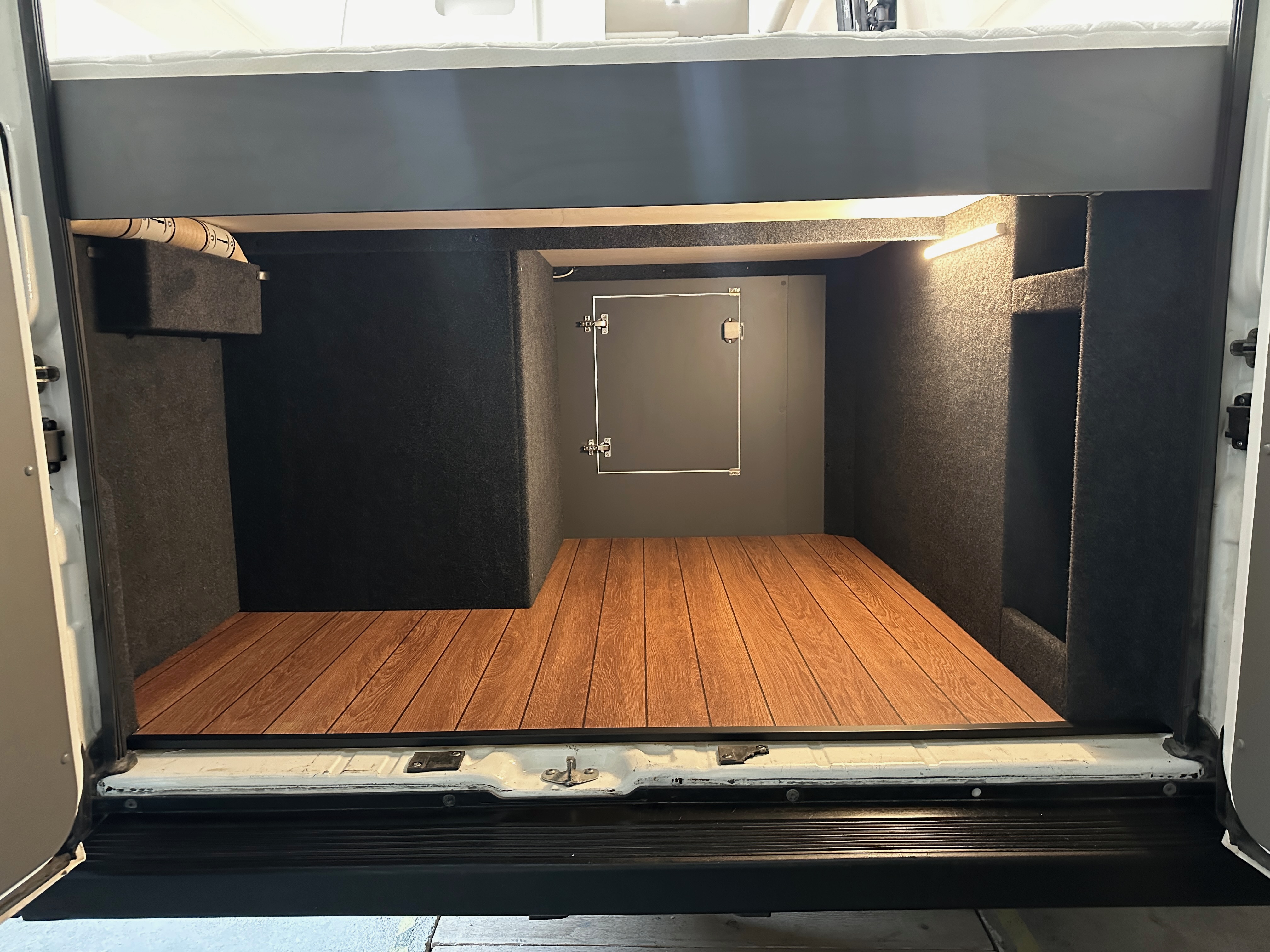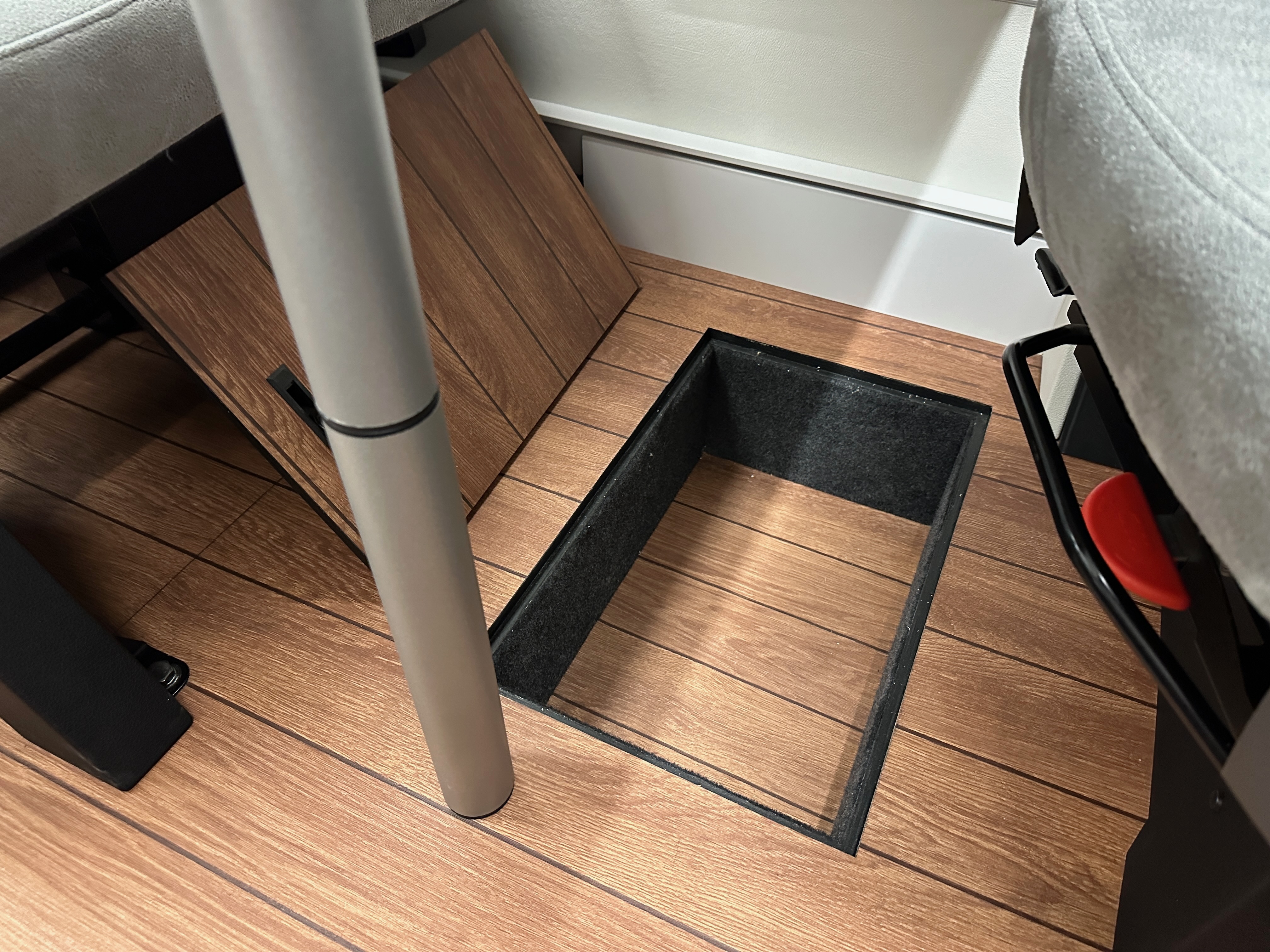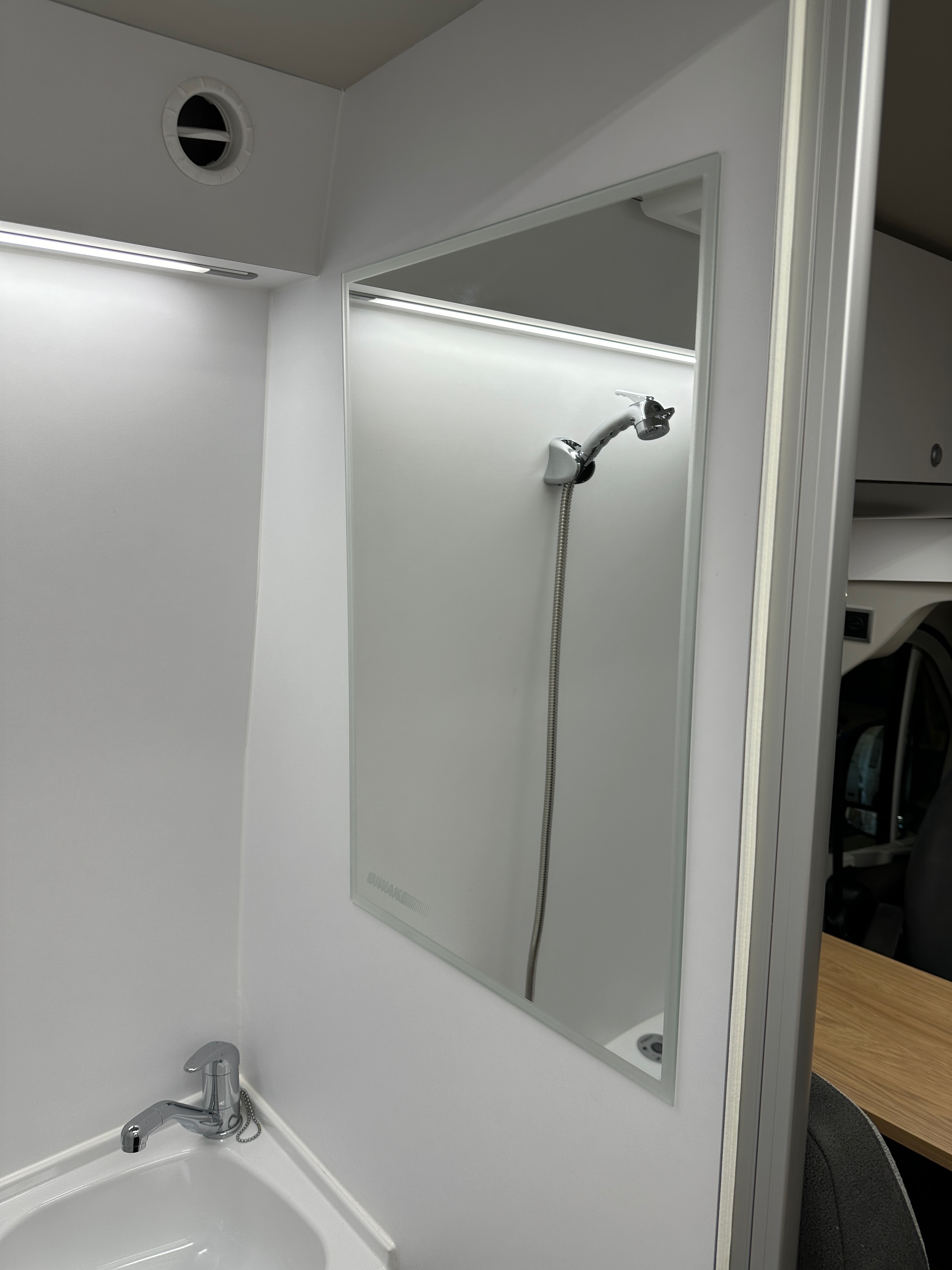 A világos, letisztult belső tér öt személy szállítására alkalmas, de az ötödik ülés könnyedén eltávolítható, így még tágasabb életteret biztosítva. A keresztirányban elhelyezett franciaágy a karosszéria bővítésének köszönhetően 2 méter hosszú, kényelmes alvóhelyet nyújtva. Számos rejtett tárolórekesz segíti a rendszerezést és a helykihasználást. A teljesen gázmentes kialakítású lakóautóban dízel kombi kazán és kompresszoros hűtő gondoskodik a fűtésről és hűtésről. A kényelmet tovább fokozza az állóhelyzeti klíma, amely biztosítja a megfelelő hőmérsékletet a pihenések során, valamint a beépített TV, amely szórakozást nyújt az utazások alatt. A tetőn elhelyezett napelemek lehetővé teszik az elektromos rendszerek önálló működtetését, függetlenül a külső áramforrásoktól. A belső tér kialakítása során különös figyelmet fordítottunk a praktikumra és a kényelemre, hogy hosszabb utazások során is otthonos környezetet biztosítson.