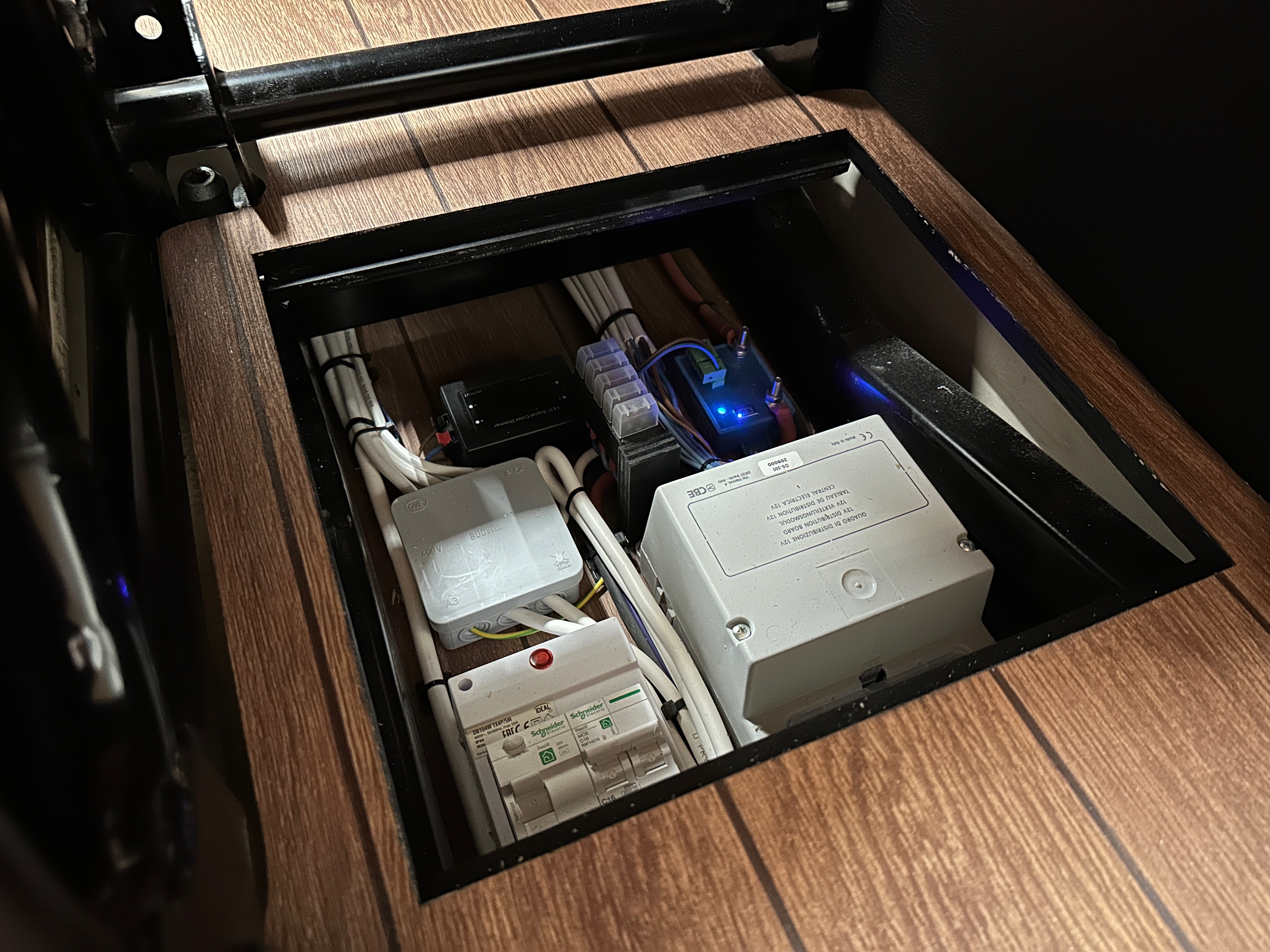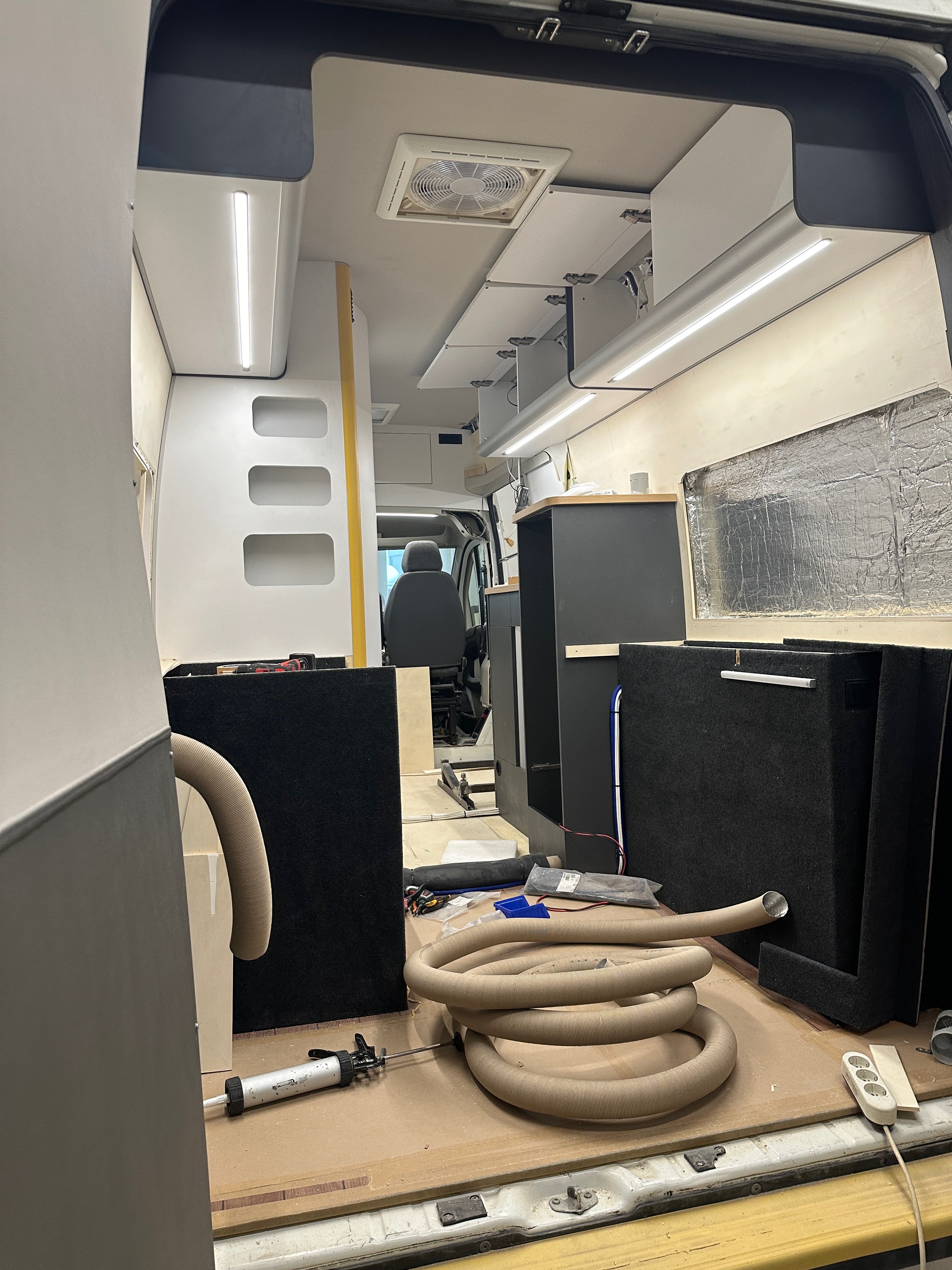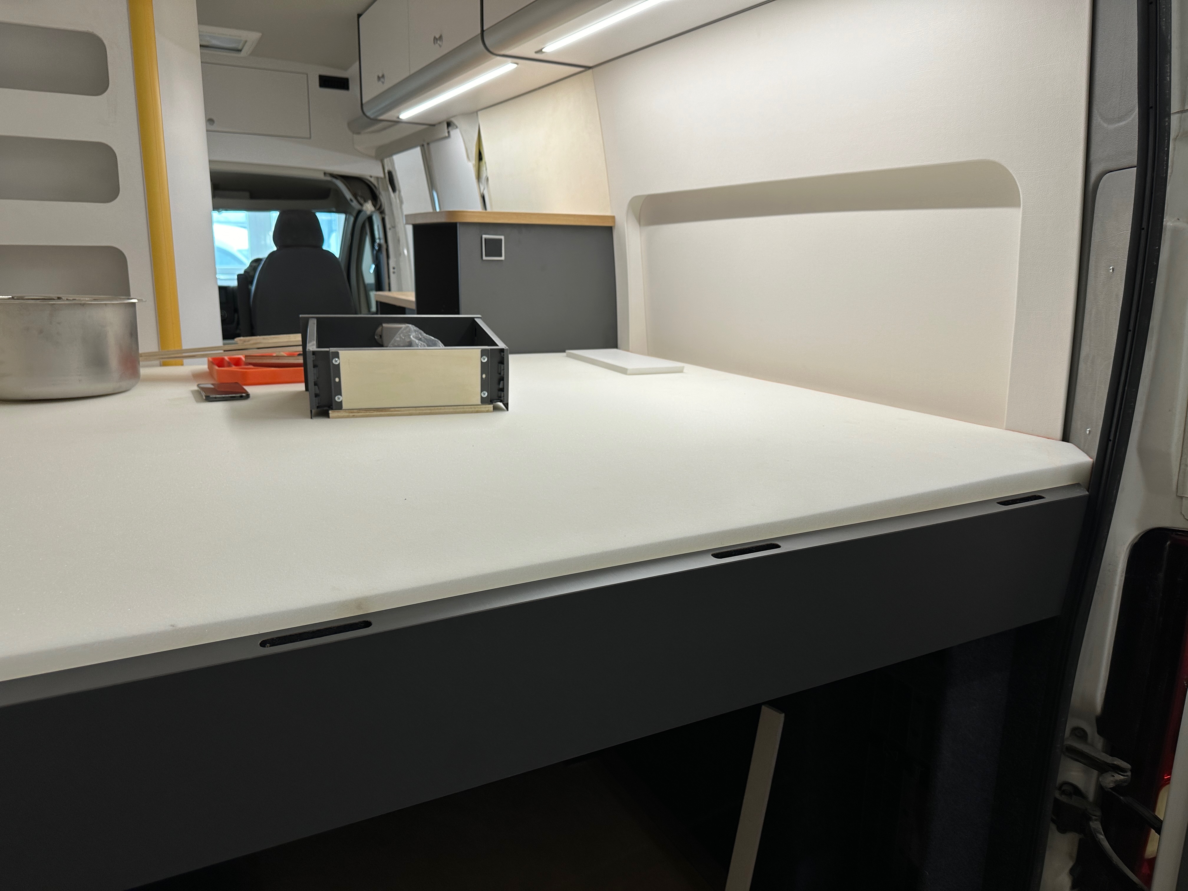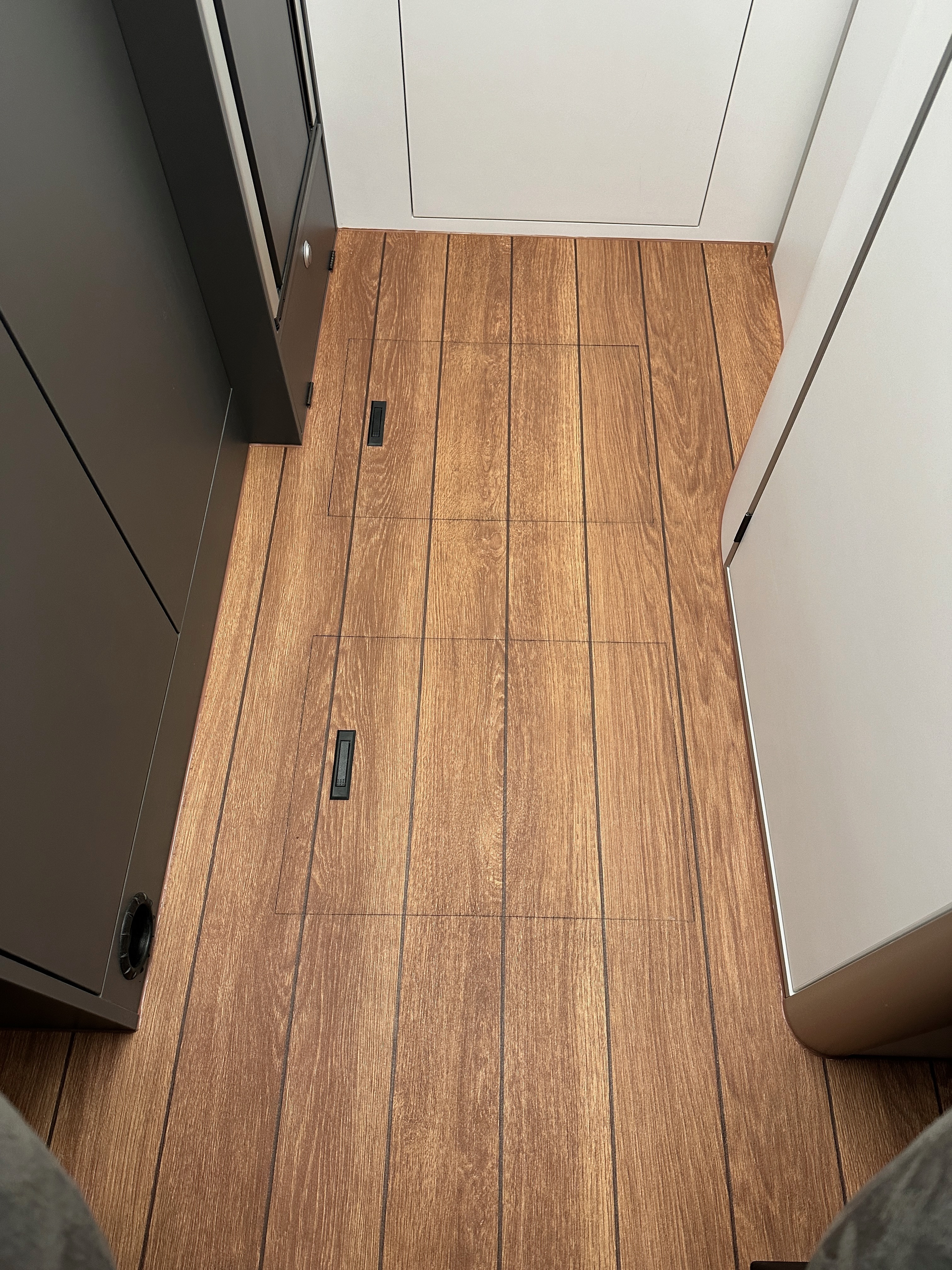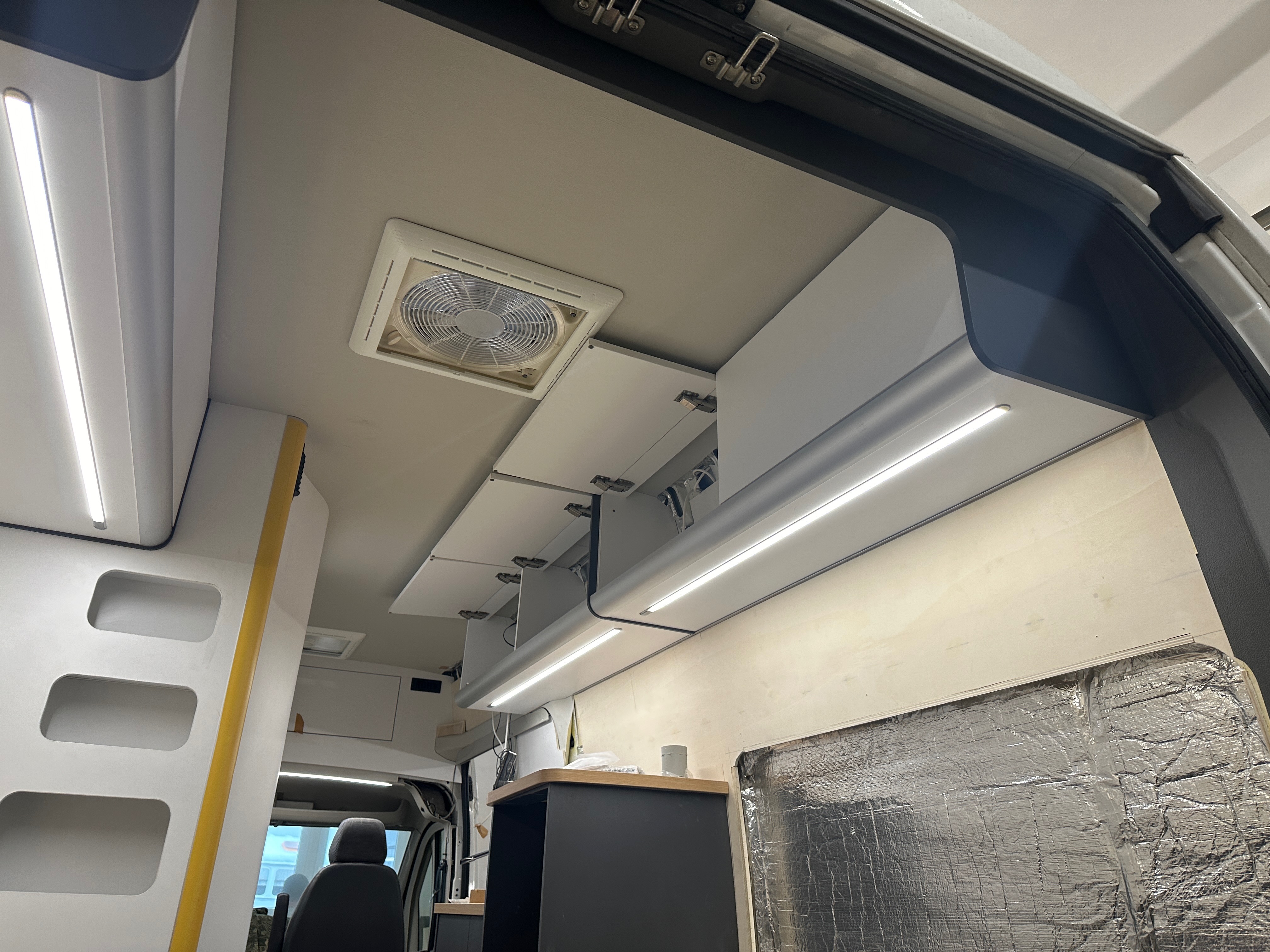 A világos, letisztult belső tér öt személy szállítására alkalmas, de az ötödik ülés könnyedén eltávolítható, így még tágasabb életteret biztosítva. A keresztirányban elhelyezett franciaágy a karosszéria bővítésének köszönhetően 2 méter hosszú, kényelmes alvóhelyet nyújtva. Számos rejtett tárolórekesz segíti a rendszerezést és a helykihasználást. A teljesen gázmentes kialakítású lakóautóban dízel kombi kazán és kompresszoros hűtő gondoskodik a fűtésről és hűtésről. A kényelmet tovább fokozza az állóhelyzeti klíma, amely biztosítja a megfelelő hőmérsékletet a pihenések során, valamint a beépített TV, amely szórakozást nyújt az utazások alatt. A tetőn elhelyezett napelemek lehetővé teszik az elektromos rendszerek önálló működtetését, függetlenül a külső áramforrásoktól. A belső tér kialakítása során különös figyelmet fordítottunk a praktikumra és a kényelemre, hogy hosszabb utazások során is otthonos környezetet biztosítson.