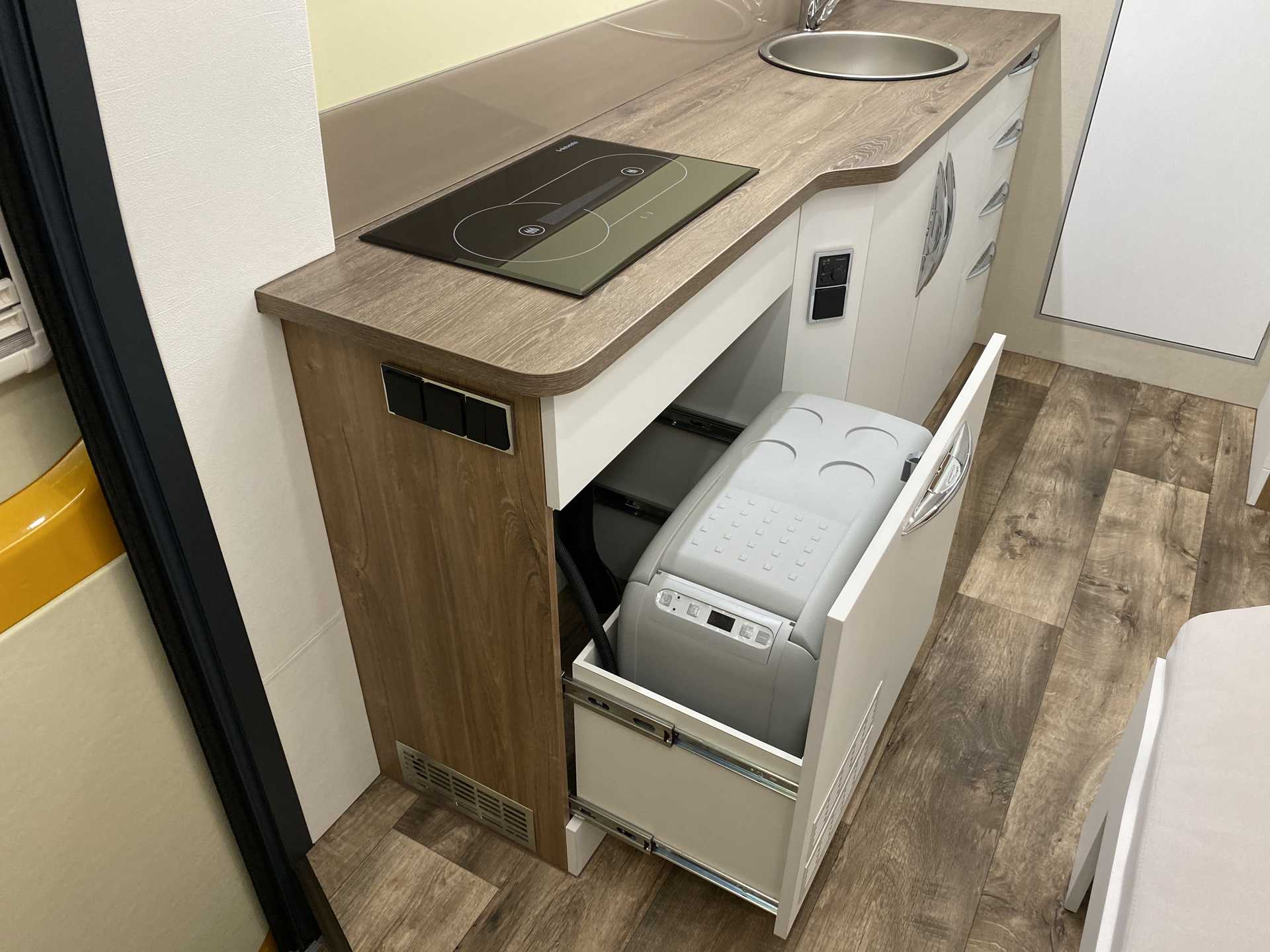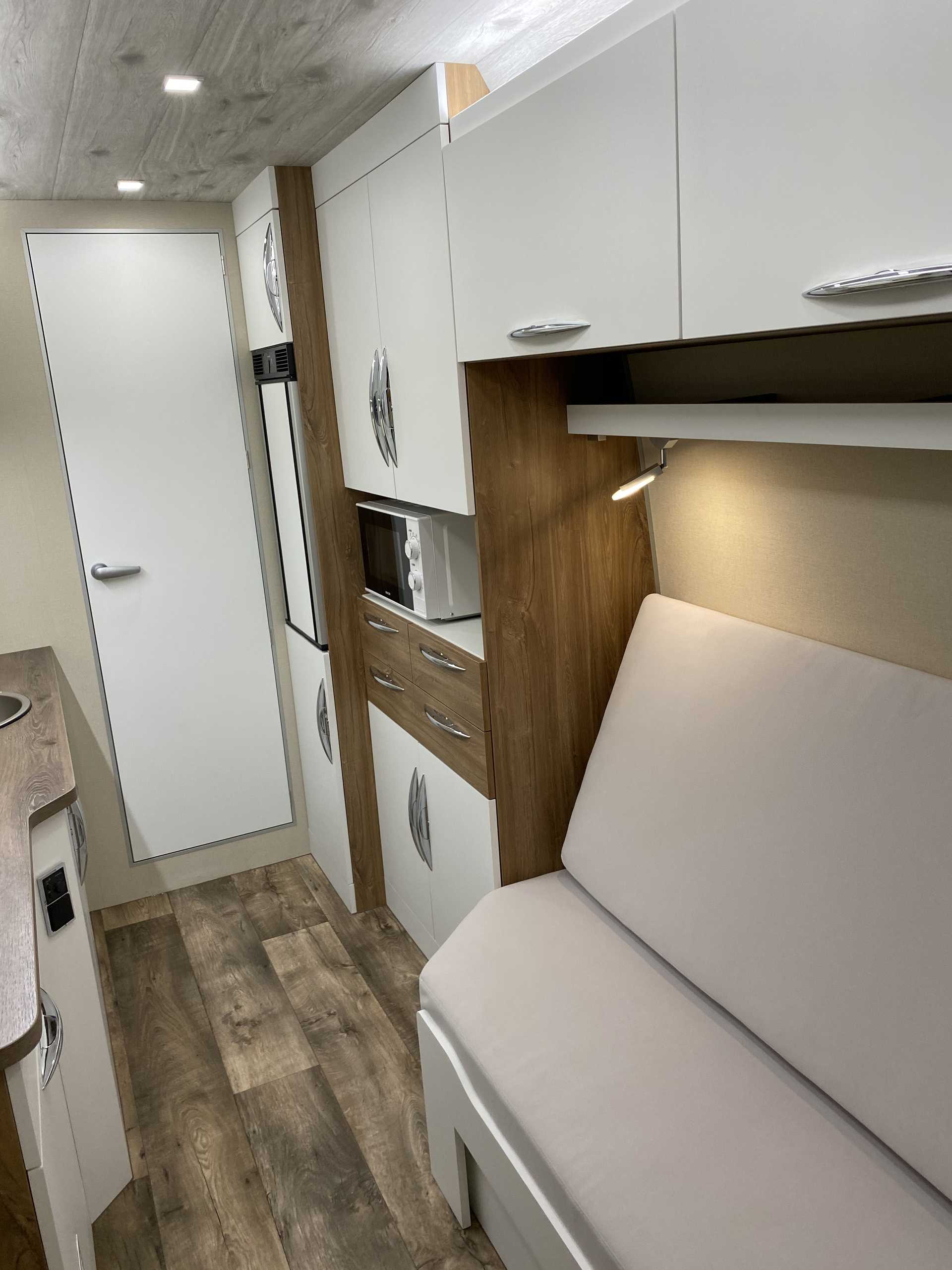 A külsöjénél is nagy figyelmet kellett fordítani arra, hogy ne lehessen látni rajta, hogy ez egy lakóautó. A belső rész teljesen gázmentes, ezért egy Truma Combi D diesel kombi kazán került beépítésre, valamint a főzéshez egy Webasto X-100-as diesel kerámia főzőlap. A raktérbe beépítésre került egy Dometic sütő, amit kívülről a hátsó ajtónál lehet használni.