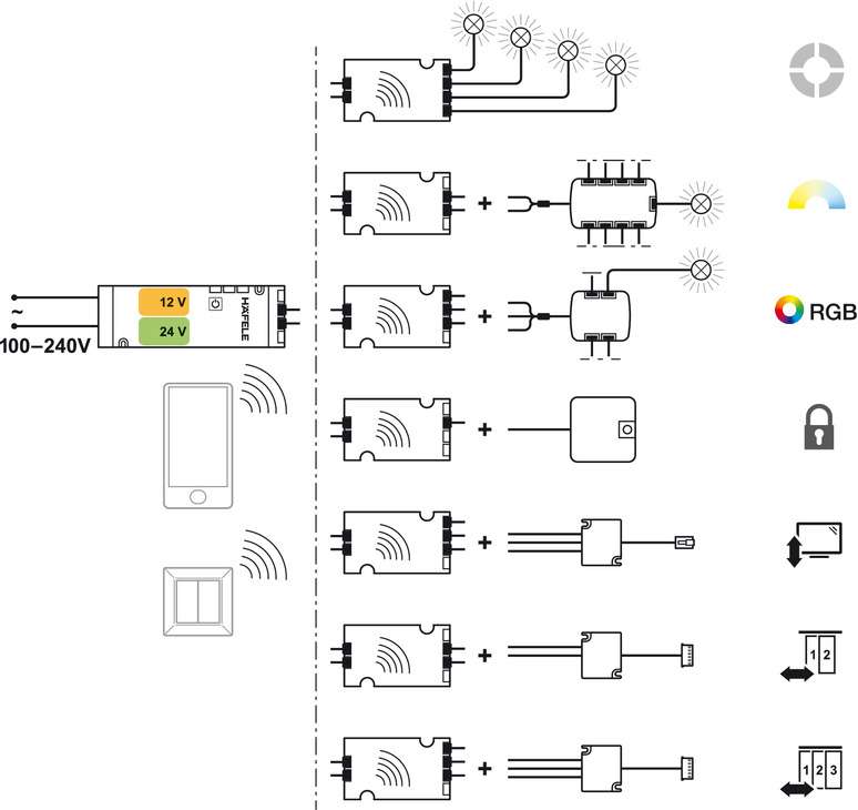 A világítás és az elektromos szerelvények intuitív és vezeték nélküli vezérléséhez, alkalmazáson keresztül. Az RGB lámpák be- és kikapcsolásához és tompításához (0–100%)