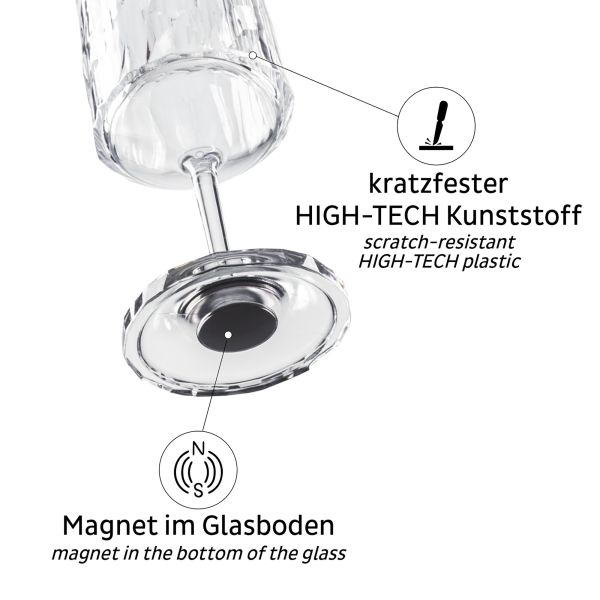 A „műanyag üveg” kifejezés nem igazán illik a műanyagból készült silwy® kempingüvegekre. Miért? Rendkívül jó minőségű műanyagból készültek, ezért kevés a közös vonás a hagyományos műanyag üvegekkel. A silwy műanyag üvegei a „ mint az üveg” nézd”. Amikor az asztalon vannak, azt fogja hinni, hogy kristály ivópoharak. Hogyan működik: a műanyag lencsék a legfinomabb, törés- és karcálló high-tech műanyagból készülnek. Ezáltal egyrészt szinte elpusztíthatatlanok, másrészt gyönyörű a látványuk is. Az ivópoharak, sörös, boros, pezsgős és hosszú ital poharak, de természetesen a whiskys műanyag poharak is stílusos hangulatot biztosítanak lakóautójában egységes, modern dizájnnal. A műanyag lencsék előnye: Ha leejtesz egyet, semmi sem fog történni. Nincs szilánk, nincs sérülésveszély - legfeljebb egy kis kiömlött folyadék. Ezeket gyorsan letörölheti, és továbbléphet. A borospoharakat egy tökéletesen integrált mágneslap tartja a helyén még extrém helyzetekben is.