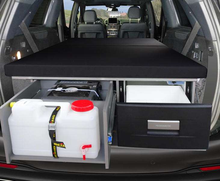 A CampingBox GLS egy nagy konyhakiválasztóval rendelkezik a bal oldalon, egy 12 l-es frissvíztartállyal, összecsukható mosogatóval, 1-égős gáztűzhelyel, kötőpántok, tároló rekeszek, edények és hasonló kiegészítők számára. A jobb oldali rekesz a Dometic CoolMatic CD 30, 30 literes hűtőláda telepítésére alkalmas. Mögötte egy másik tárolórekesz, ami egy lehajtható lemez asztallal egy nagy munkafelületet ad. A CampingBox GLS a csomagtérben van rögzítve a jármű oldalán lévő rögzítőszemekhez hevederekkel, és oldalsó fogantyúval rendelkezik. Kényelmes alvást az ágypanel (tartozék) nagy fekvő felülette teszi lehetővé (126 x 200 x 7 cm) Könnyen kivihető a járműből és könnyen szállítható. Felszereltség: Kempingbox M, mosogató, 12 literes kanna, gázfőző, evőeszköz fiók, hűtőláda tároló fiók, lehajtható asztal, 2db tárolódoboz, rögzítő elemek.