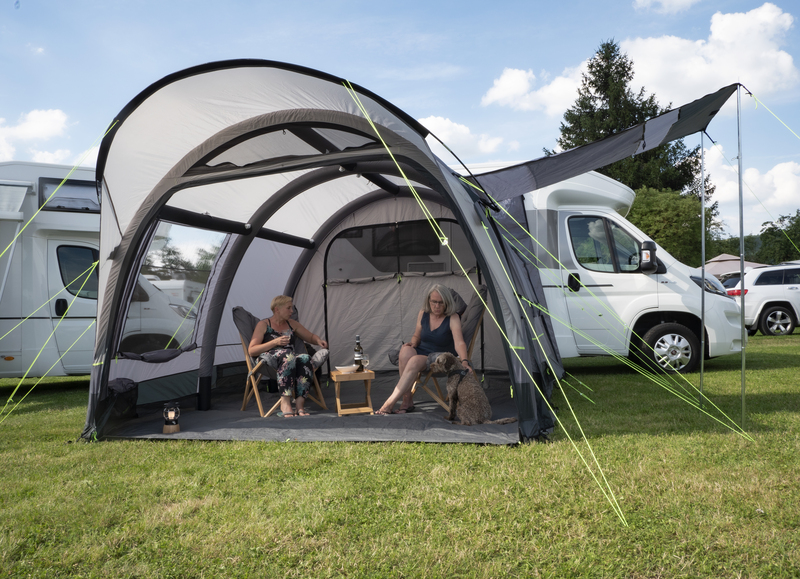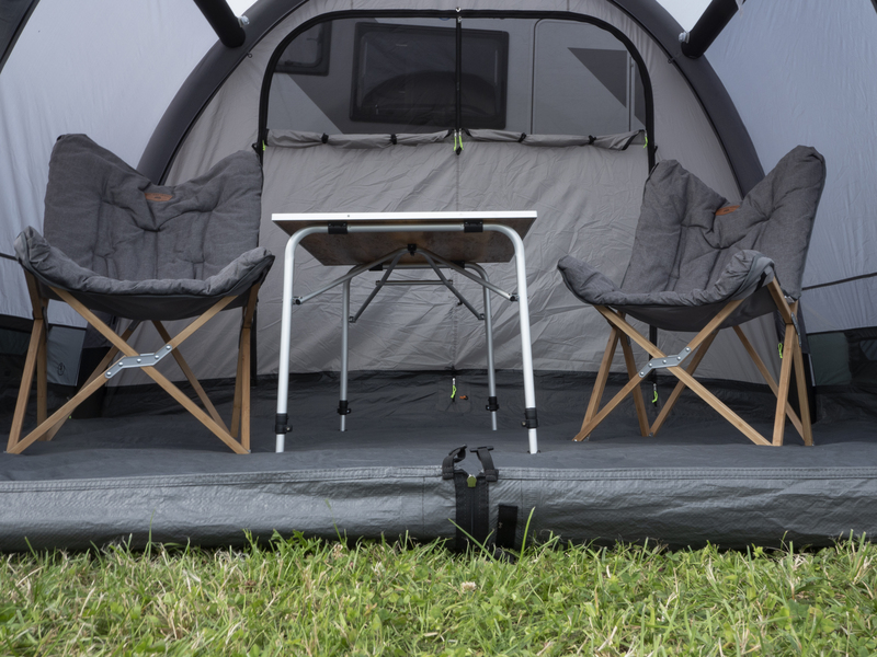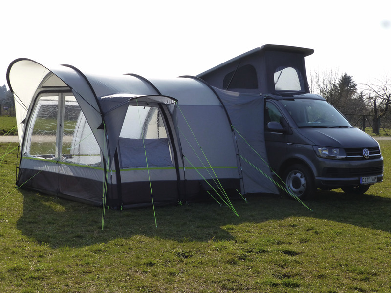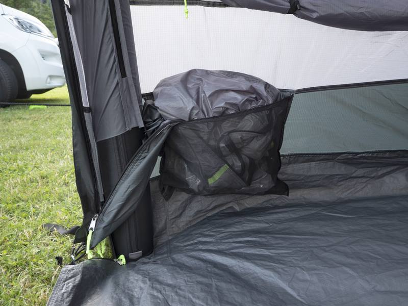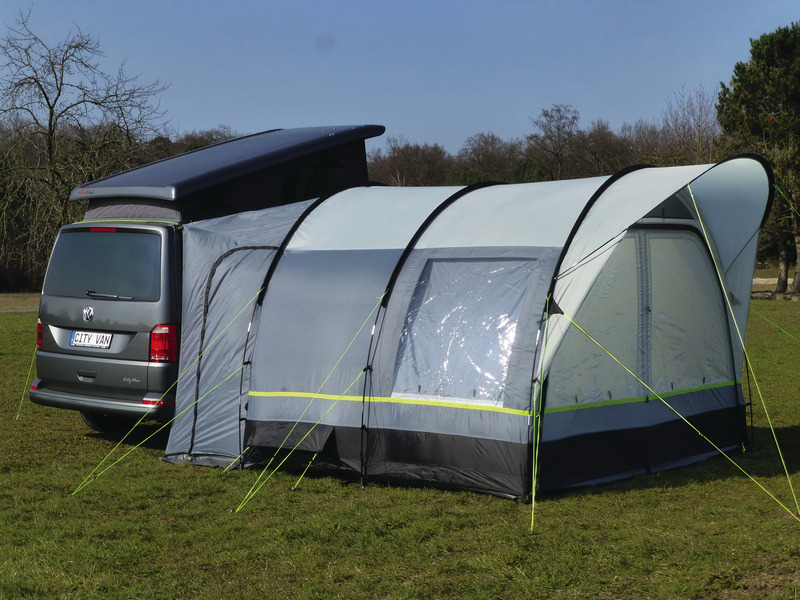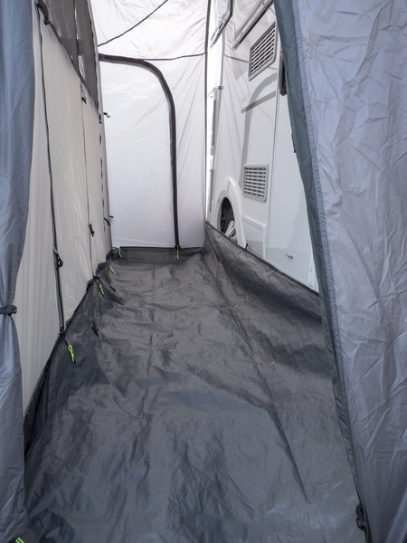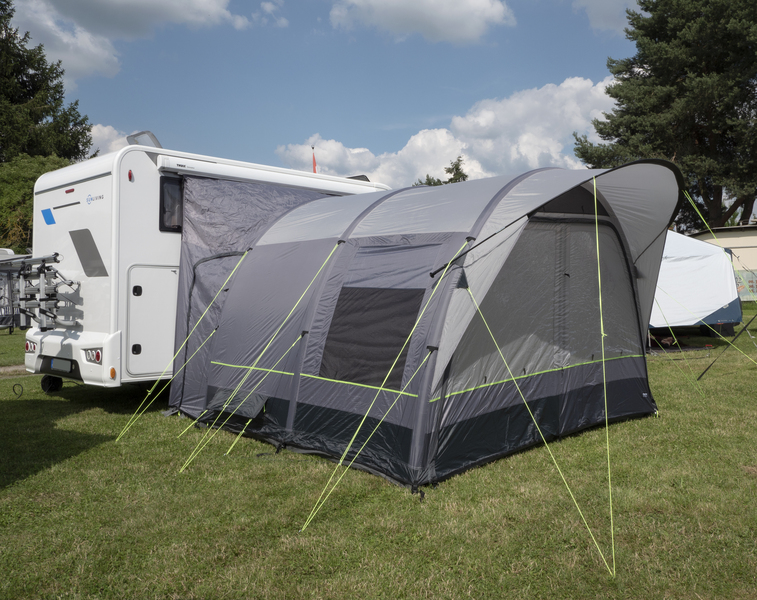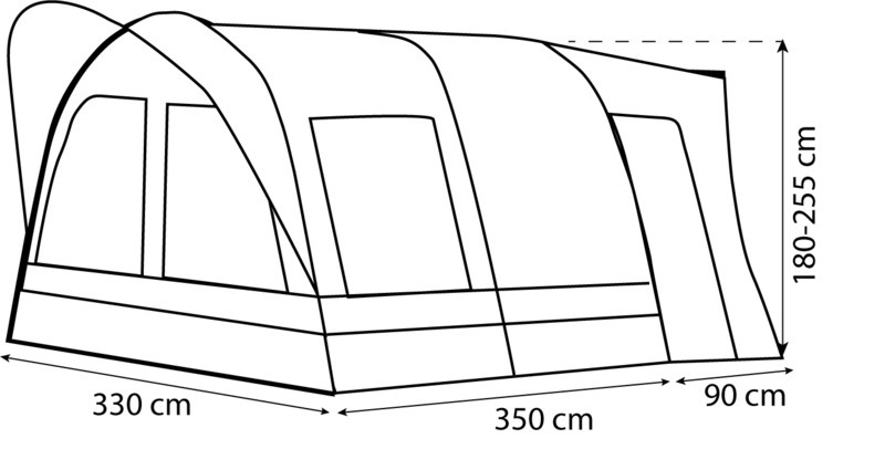 Felfújható sátor 3 légcsővel, külső szelepekkel. A bejárati ajtó teljesen vagy csak 1 oldalra nyitható, belső zsebbel a nyitott ajtó tárolására. bevarrt sátorpadló. Oldalfalak ablakokkal és szúnyoghálóval, hátsó fal 1/3 szúnyoghálóval. A 90 cm széles bejárat bal és jobb oldali ajtókkal, valamint a járműhöz rögzíthető padlóval rendelkezik. A belső sátor opcionális. Járműcsatlakozás: 5 és 8 mm-es csőprofil. Méretek: B330 x T350 x H220 cm.
